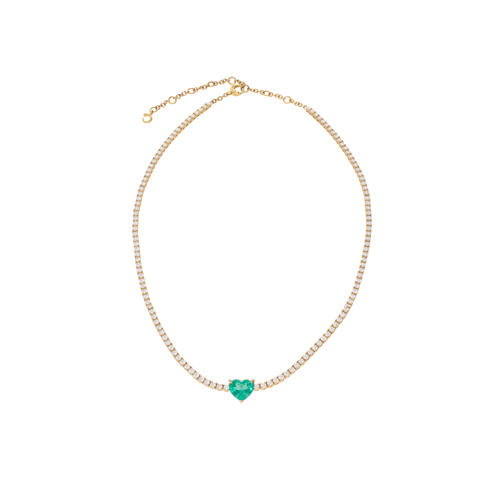 Girocollo tennis collezione forever in oro rosa 18 carati con diamanti bianchi taglio brillante e smeraldo certificato taglio cuore. Lunghezza regolabile da 38 a 47 cm. Certificato CDC 2307475.