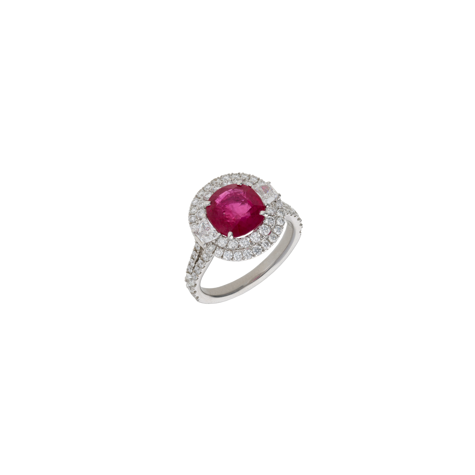 Anello rosetta in oro bianco con rubino centrale certificato, doppio contorno di diamanti e demi-pavé sul gambo - 000-4982NS