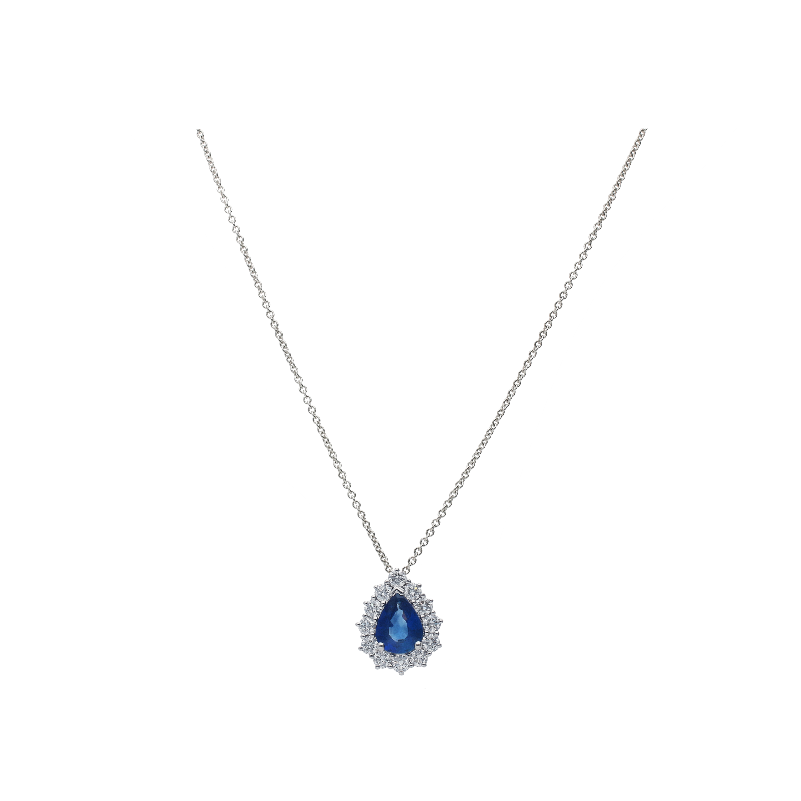 Collana collezione Forever in oro bianco 18 carati con zaffiro blu taglio goccia e diamanti bianchi taglio brillante