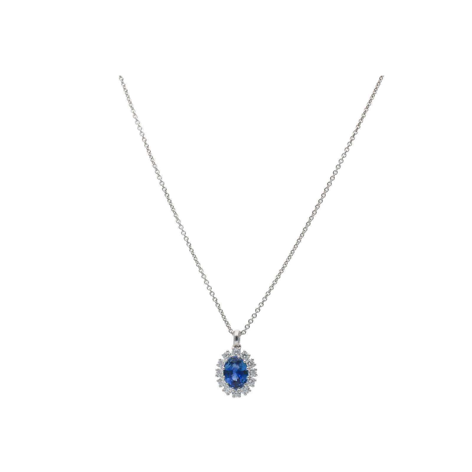 Collana collezione Forever in oro bianco 18 carati con zaffiro blu taglio ovale e diamanti bianchi taglio brillante. Lunghezza regolabile a 40 e 42 cm.