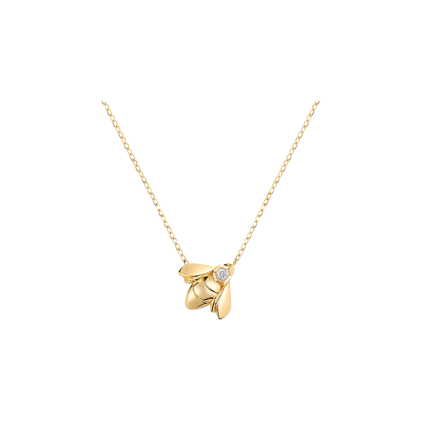 Ciondolo Bee de Chaumet in oro giallo 100% tracciabile con pavé di diamanti taglio brillante. Decorato con il motivo a forma di ape, diventato l'icona della collezione, questo pendente è realizzato al 100% con oro tracciabile proveniente da fonti responsabili. Chaumet garantisce inoltre che ogni fase del processo di approvvigionamento dell'oro sia controllata secondo una serie di rigorose normative. Simboleggiano la natura vibrante e vivace. Reinterpretano il motivo dell'ape. Incapsulano la luce. Unica nel suo genere, la collezione Bee de Chaumet nasce dalla fusione di questi elementi. Creazioni grafiche e irresistibili, le cui celle a nido d'ape si susseguono all'infinito. Diffondono la luce come nessun altro, permettendo a chi le indossa di brillare, insieme.