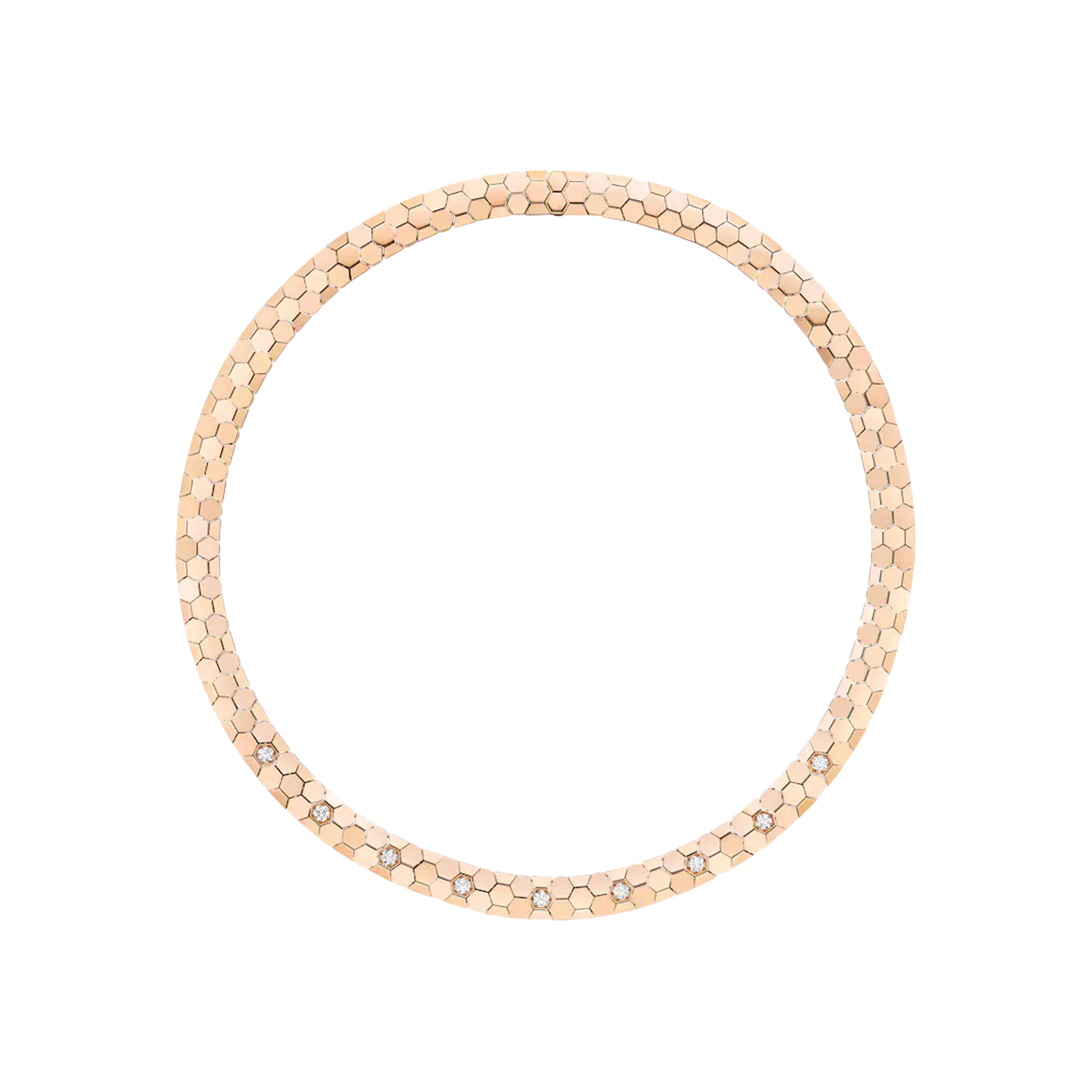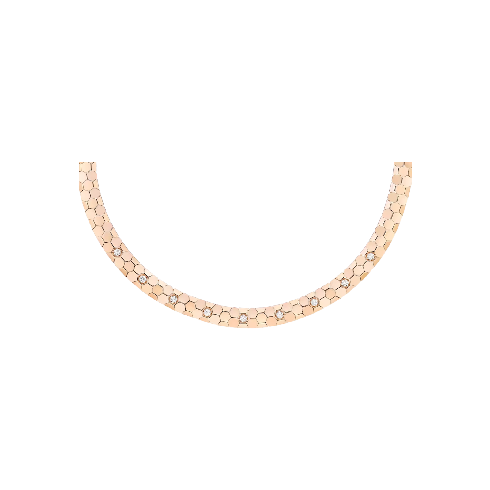 Altamente sofisticata, la collana Bee de Chaumet è delicatamente articolata, offrendo la promessa di una vestibilità morbida e avvolgente, come una seconda pelle. Rispecchiando perfettamente la forma del nido d'ape, ogni diamante Bee de Chaumet è mantenuto in posizione da una montatura a sei grani, aggiungendo un tocco di raffinatezza in più. I diamanti sono leggermente rialzati per esaltarne la brillantezza, quasi nascondendo completamente la montatura in metallo. Dotata di una chiusura discreta, la creazione abbraccia sensualemente le curve della silhouette. Una creazione da indossare da sola o abbinata all'anello, agli orecchini a cerchio e al bracciale di questa eccezionale parure.