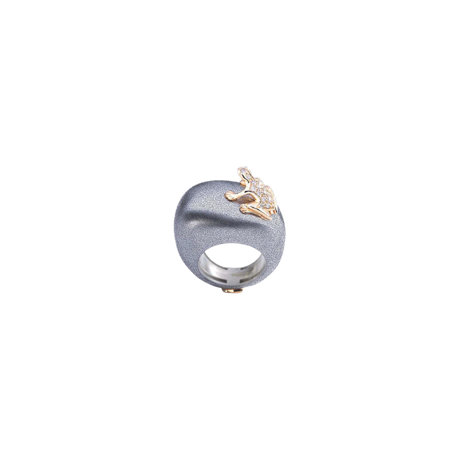 L’anello scultura dell’iconica collezione Happy Frog ha la base in argento 925, il cui colore è ottenuto mediante un trattamento di verniciatura manuale che ha una finitura materica. La rana è in oro rosa 18K e diamanti bianchi. Una combinazione che conferisce al gioiello un design contemporaneo, frutto dell’unione tra lo slancio creativo e l’artigianalità orafa italiana. Un porte-bonheur, ideale per le occasioni in cui si vuole augurare il meglio alle persone a noi più care. Internamente una molla consente di ridurre la misura di 2 taglie.
