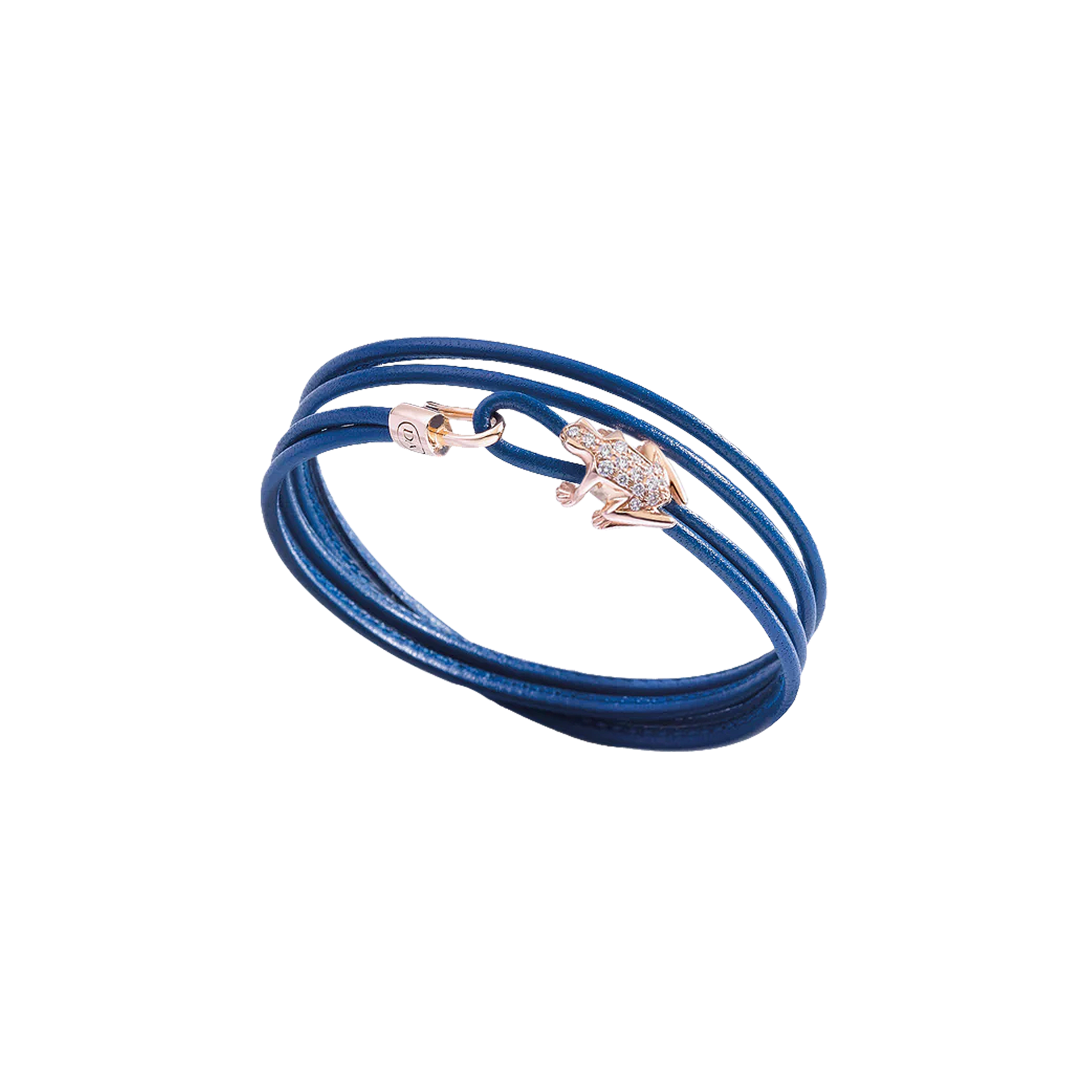 La rana è la protagonista assoluta dell'iconica collezione Happy Frog, creata nel 1994. Nel bracciale in pelle la preziosità della frog in oro rosa 18K con diamanti bianchi, si contrappone al materiale più organico. Una combinazione che conferisce al gioiello un design contemporaneo ed un carattere deciso, per avere sempre con sé la preziosa fortuna. Il bracciale si avvolge sul polso e la chiusura è ad amo.