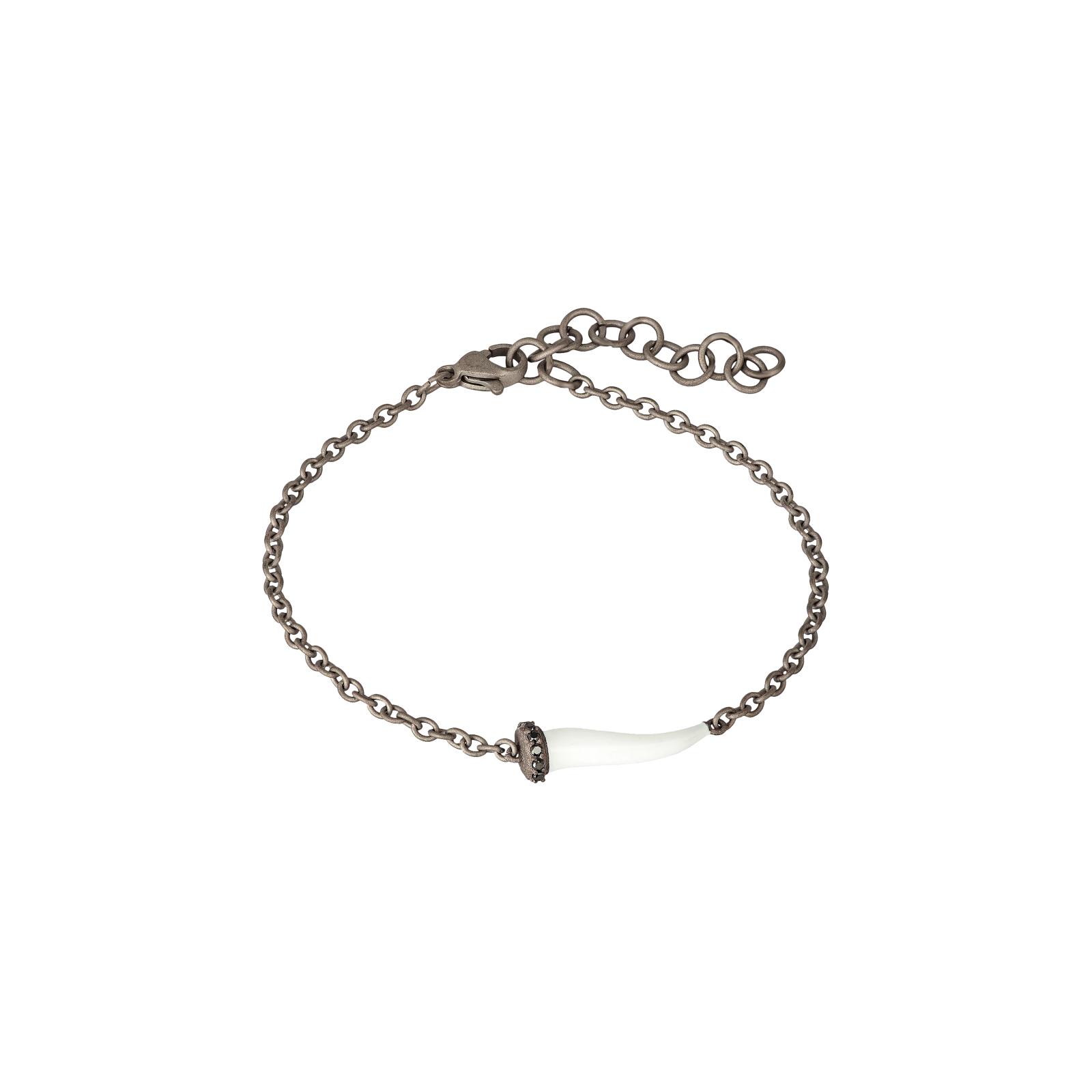 Bracciale da uomo in titanio e 5 diamanti black. Lo sviluppo del bracciale prende forma dall'elemento principale: un cornetto portafortuna in titanio smaltato colore bianco. Attorno all'estremità più grande, sono incastonati 5 diamanti black per una caratura totale di 5 punti. Ai vertici del cornetto smaltato, due piccoli anellini fungono da supporto per la catena che termina con una serie di anellini permettendo così massima indossabilità per ogni polso. A garanzia del marchio MANO, sulla parte posteriore del cornetto, fa la sua comparsa il diamante black da 1 punto, simbolo inconfondibile del brand.