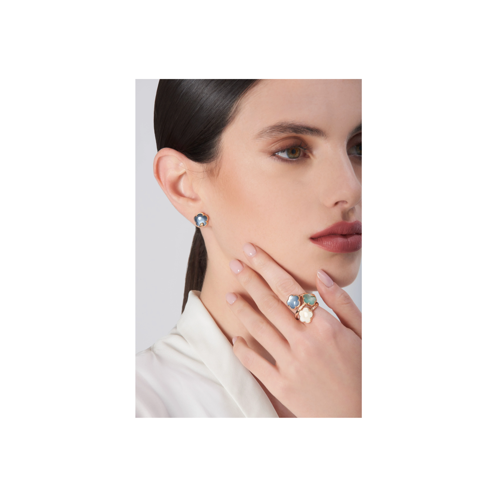 Una prima evoluzione legata alla linea riguarda la luna, la cui energia si esalta quando la pietra di luna incontra la forza delle altre pietre preziose: onice, agata verde, madreperla e calcedonio rosa. Gemme che ci invitano a vivere appieno le emozioni, a liberarci e a riconnetterci con il nostro io interiore attraverso la bellezza. L'onice, forza terrena, è simbolo di determinazione e coraggio femminile.