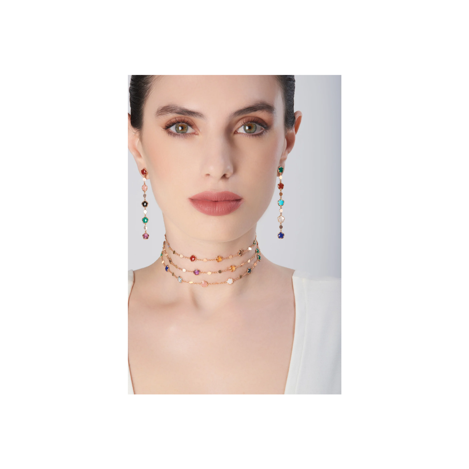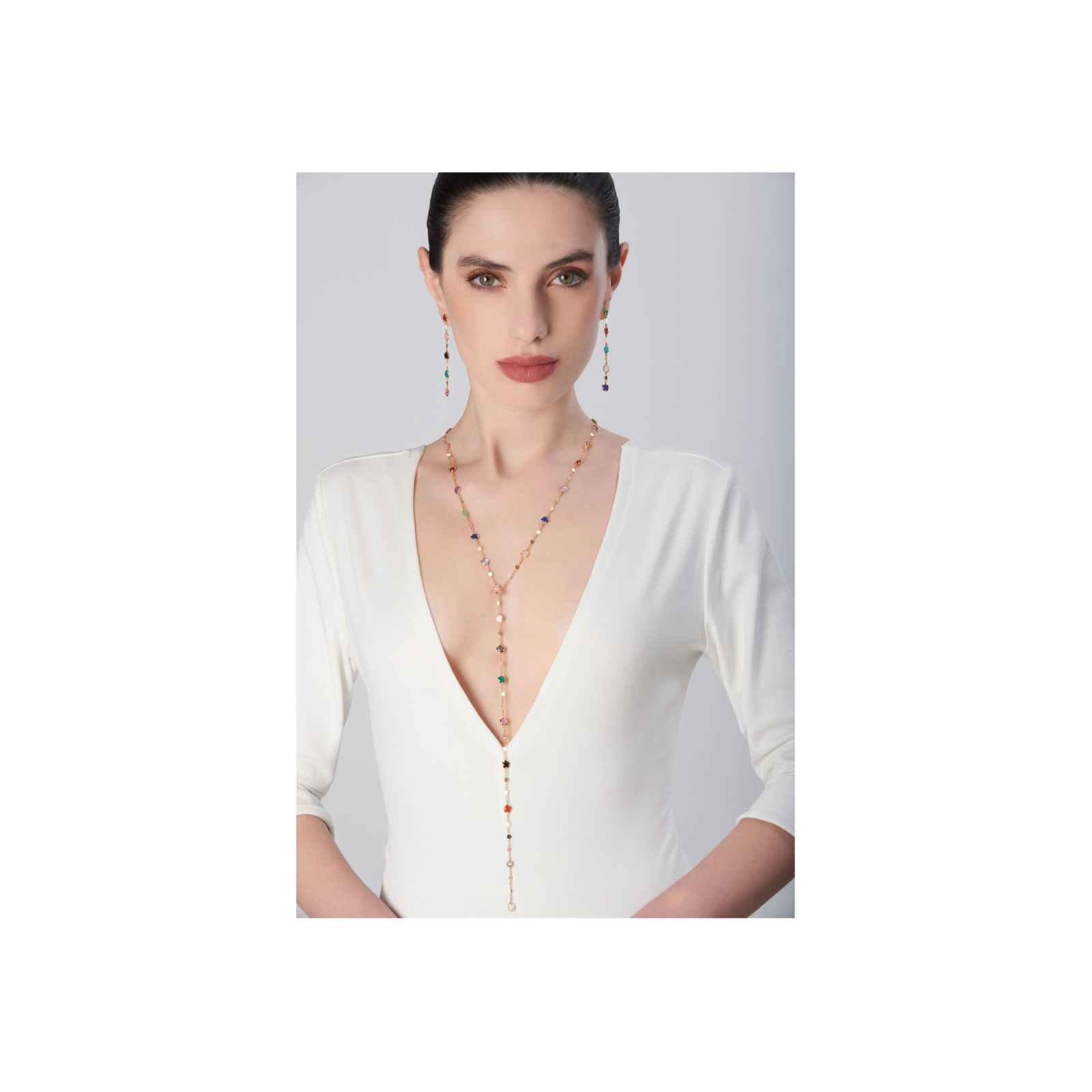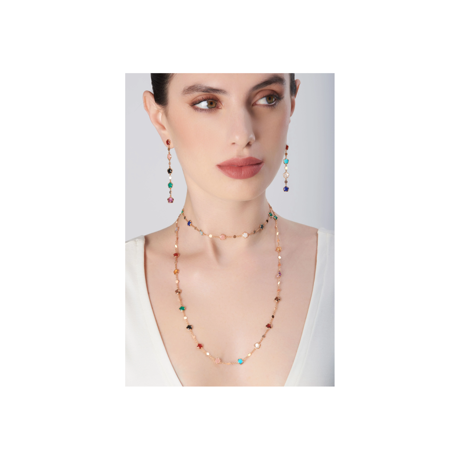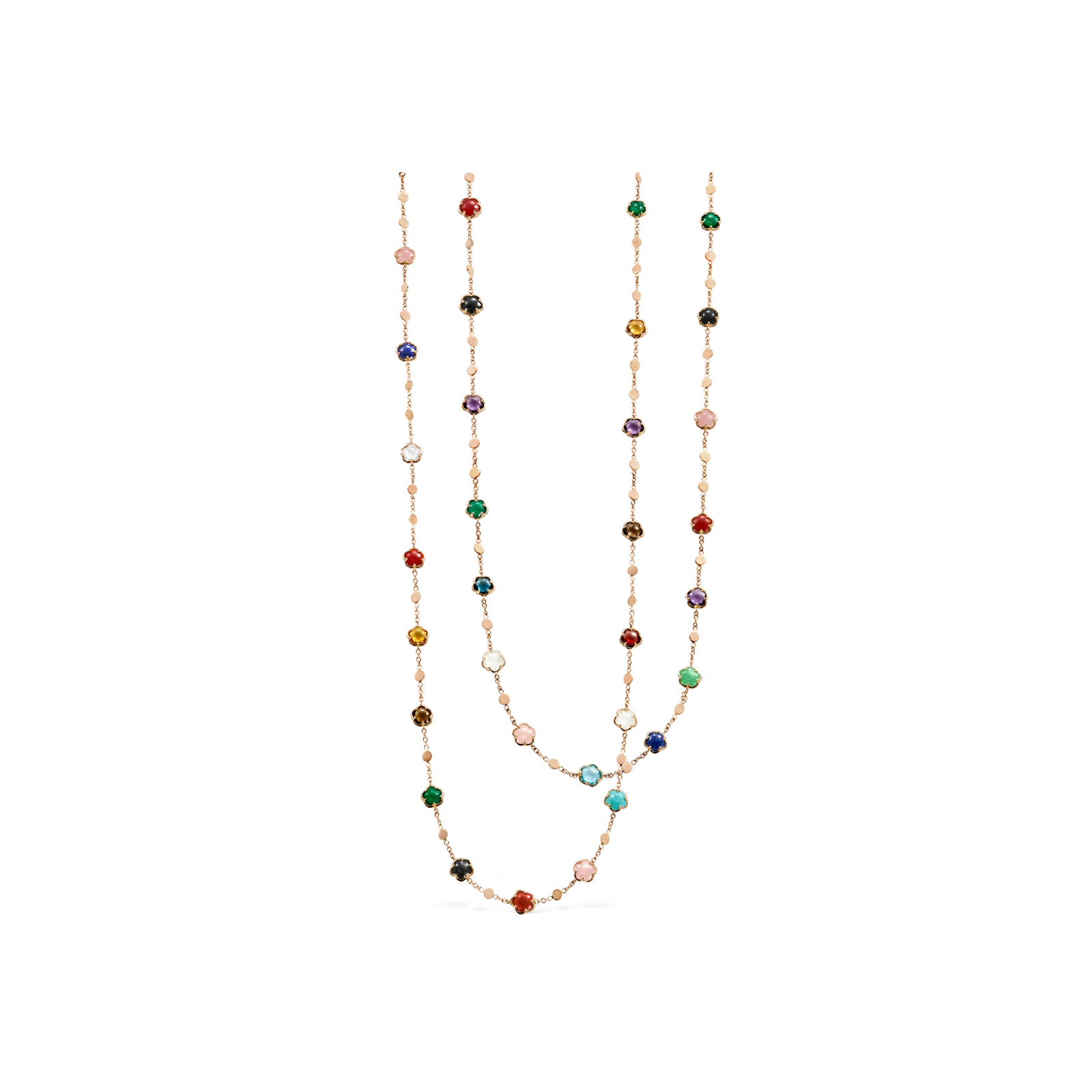 Sautoir figlia dei fiori in oro rosa con agata verde, corniola rossa, onice, pietra di luna bianca, calcedonio rosa, citrino, ametista, topazio blu london, quarzo fumé, topazio blu, lapislazzuli, crisoprasio, granato rosso, turchese, agata bianca, calcedonio azzurro e diamanti - 16705R