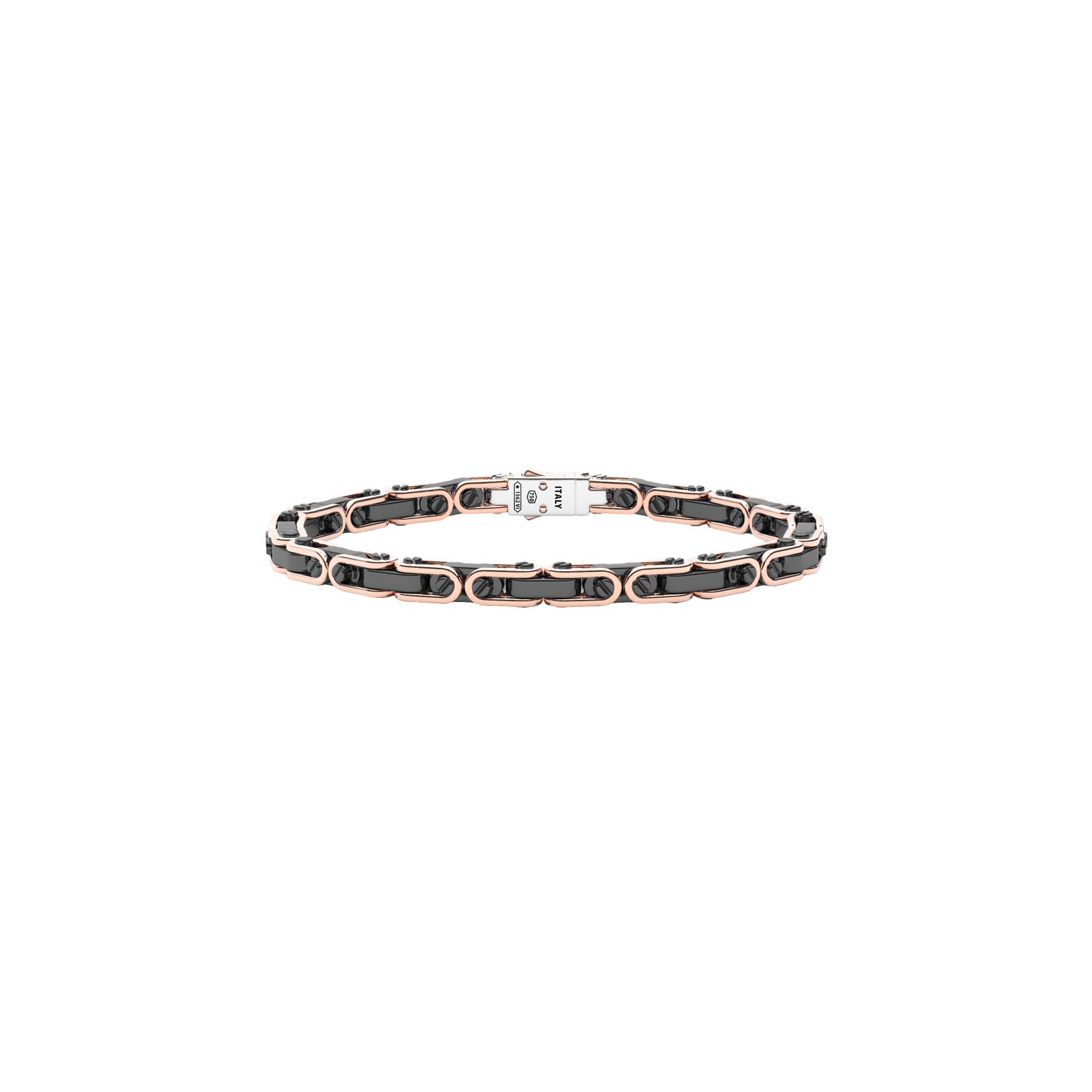 Bracciale Zancan in oro 18kt e ceramica nera. Il bracciale è composto da link geometrici uniti da viti funzionali che donano un design geometrico e meccanico al gioiello. Il contrasto tra oro rosa e lucente ceramica nera dona a questo bracciale un forte impatto visivo. Un gioiello della grande complessità meccanica, che esalta al massimo questo gioiello di altissima gioielleria. Il bracciale fa parte della collezione Ceramikgold, la collezione che unisce oro 18k e ceramica tramite complesse tecniche di lavorazione.