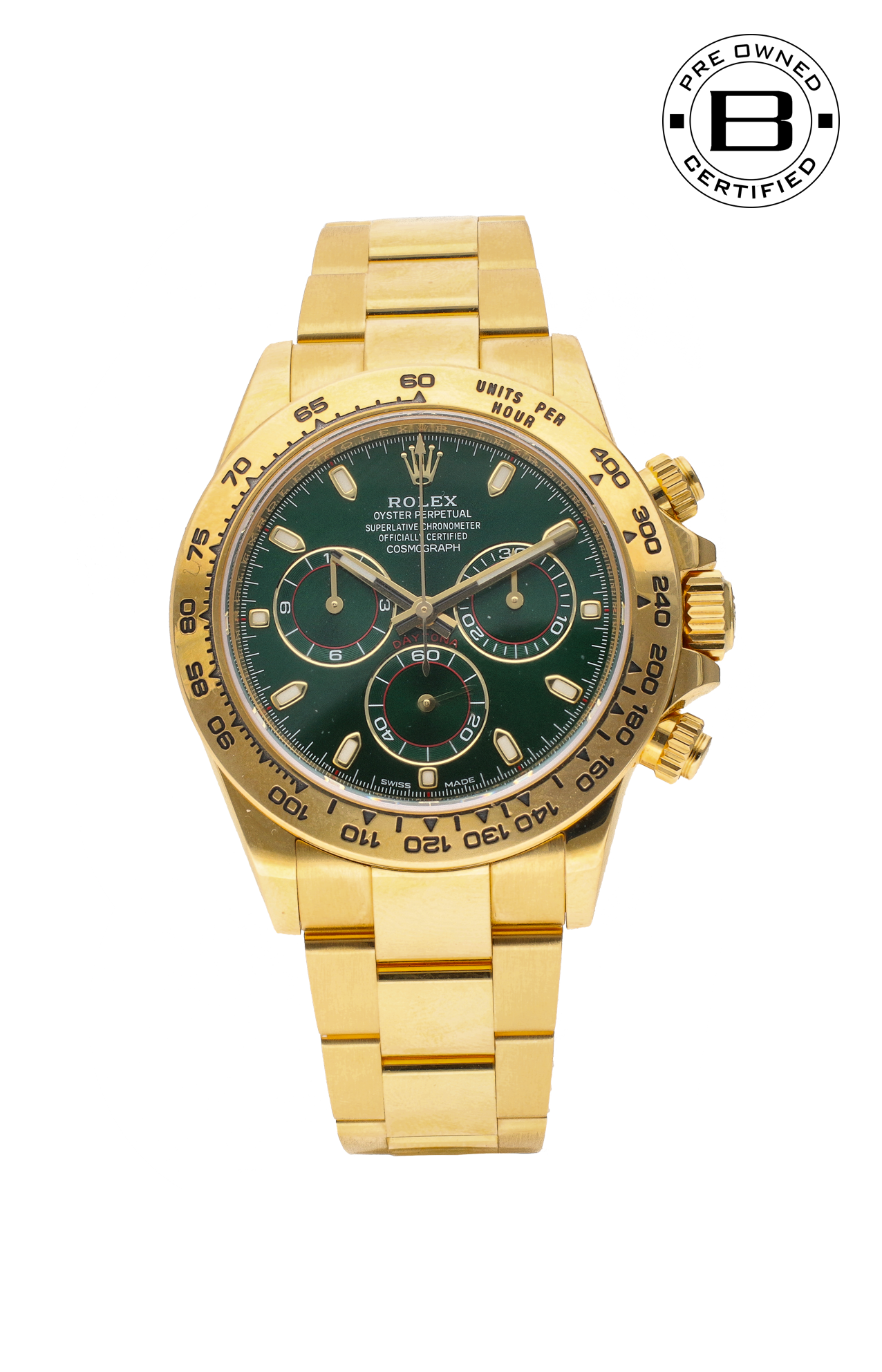 Il Rolex Daytona 116508, affettuosamente noto come il Daytona "John Mayer", è diventato uno dei modelli Daytona moderni più ricercati. Realizzata in oro giallo 18 carati, la cassa da 40 mm incarna un lusso senza tempo, completata da un bracciale Oyster in oro giallo abbinato con maglia centrale lucida e chiusura Oysterlock per una finitura impeccabile ed elegante. Lo straordinario quadrante verde metallizzato con finitura soleil, abbinato ai quadranti secondari dorati a contrasto, conferisce all'orologio un carattere unico e un fascino da collezione. Le lancette e gli indici delle ore con trattamento Chromalight garantiscono un'eccellente leggibilità, mentre i contatori dei 30 minuti e delle 12 ore del cronografo e il quadrante secondario dei piccoli secondi garantiscono una funzionalità precisa. Resa popolare dal musicista John Mayer, questa referenza ha guadagnato lo status di oggetto di culto tra i collezionisti, combinando la tradizione automobilistica di Rolex con un design vivace e audace che la distingue nella gamma Daytona.