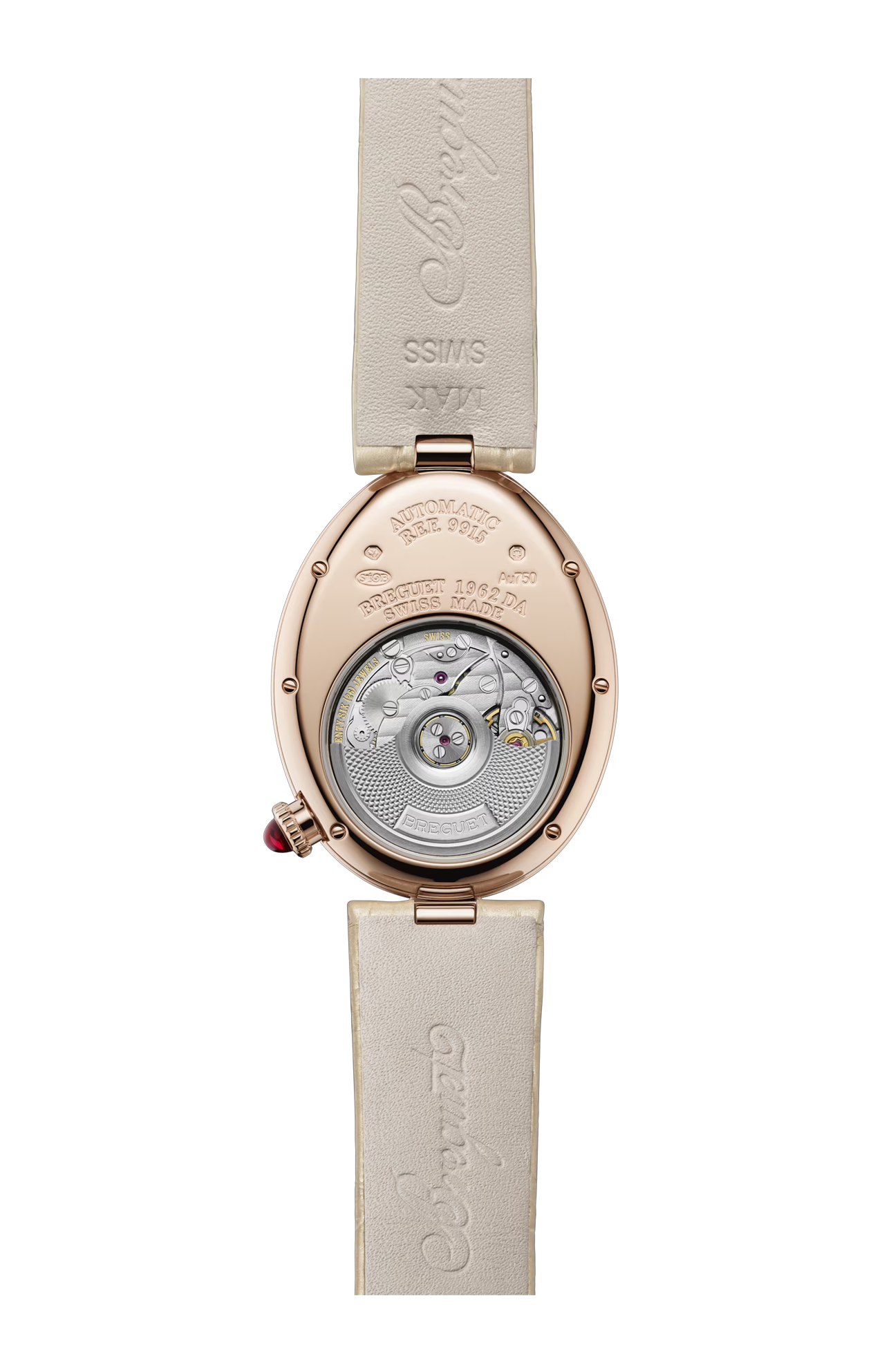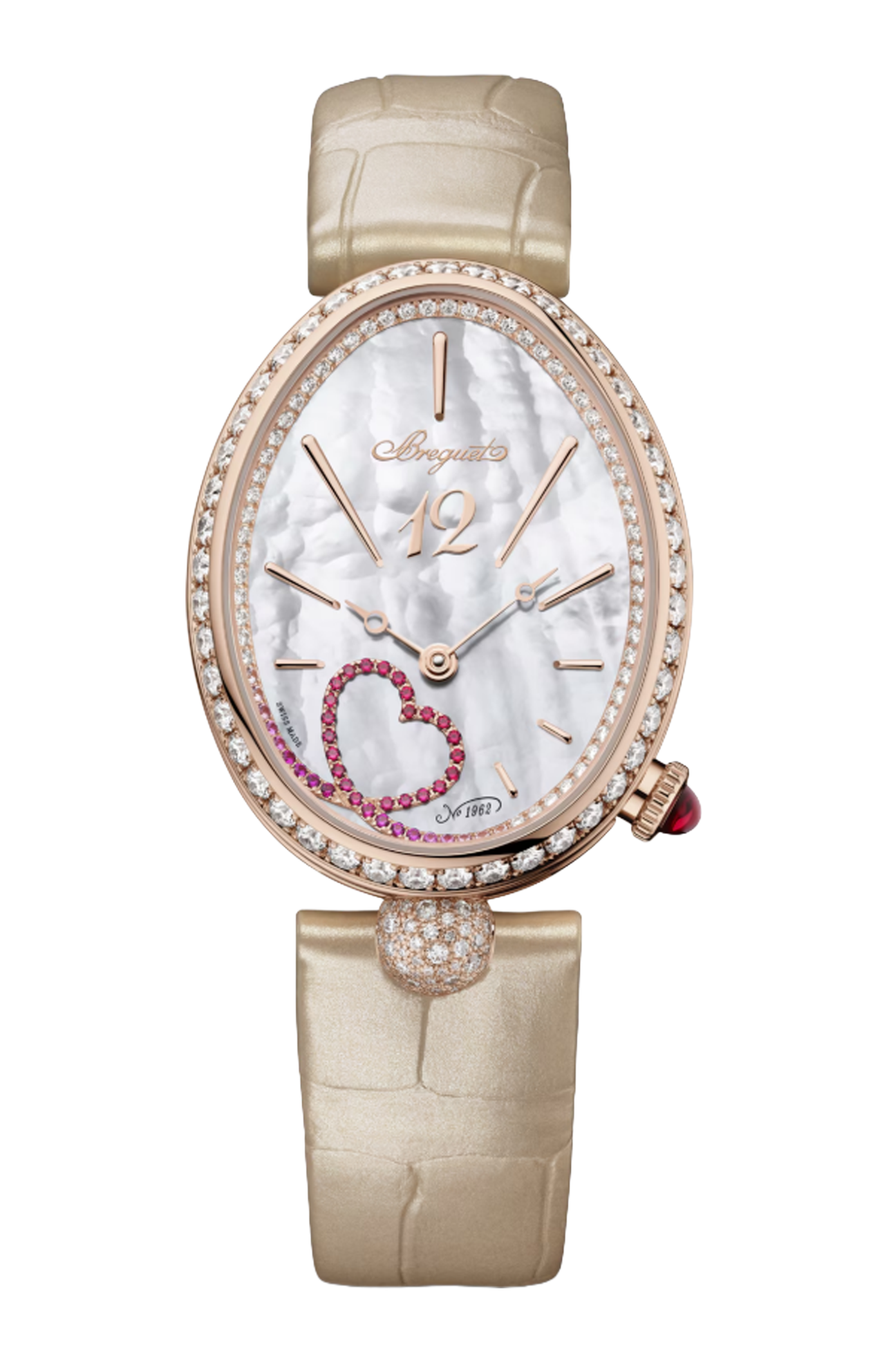 Il Breguet Reine de Naples 9915BR/5896/4D0 è un segnatempo femminile di alta orologeria che incarna la perfetta fusione tra eleganza classica, arte gioielliera e tradizione tecnica, pensato per chi desidera un orologio raffinato e distintivo. La cassa ovale in oro rosa 18 K presenta proporzioni armoniose e linee sinuose, impreziosita da una lunetta interamente incastonata con diamanti taglio brillante di alta qualità che catturano la luce con una brillantezza intensa e sofisticata. Il quadrante in madreperla bianca, con la sua iridescenza delicata, è impreziosito da numeri Breguet elegantemente curvati e da un motivo guilloché finemente lavorato, offrendo un’estetica ricca di profondità visiva e fascino discreto; le lancette sottili e affusolate assicurano una leggibilità raffinata. Il vetro zaffiro bombato antigraffio protegge il quadrante e ne esalta ogni dettaglio, conferendo protezione e trasparenza. All’interno pulsa un movimento meccanico automatico di alta precisione, progettato per garantire affidabilità e prestazioni eccellenti, espressione della maestria tecnica della Maison. Il cinturino in pelle di alta qualità completa l’insieme con comfort e stile, rendendo questo segnatempo ideale sia per occasioni formali sia come simbolo di eleganza quotidiana. Il Reine de Naples 9915BR/5896/4D0 è molto più di un semplice orologio: è un gioiello d’alta orologeria che celebra la femminilità, la tradizione e l’estetica senza tempo. Edizione limitata a 28 esemplari.