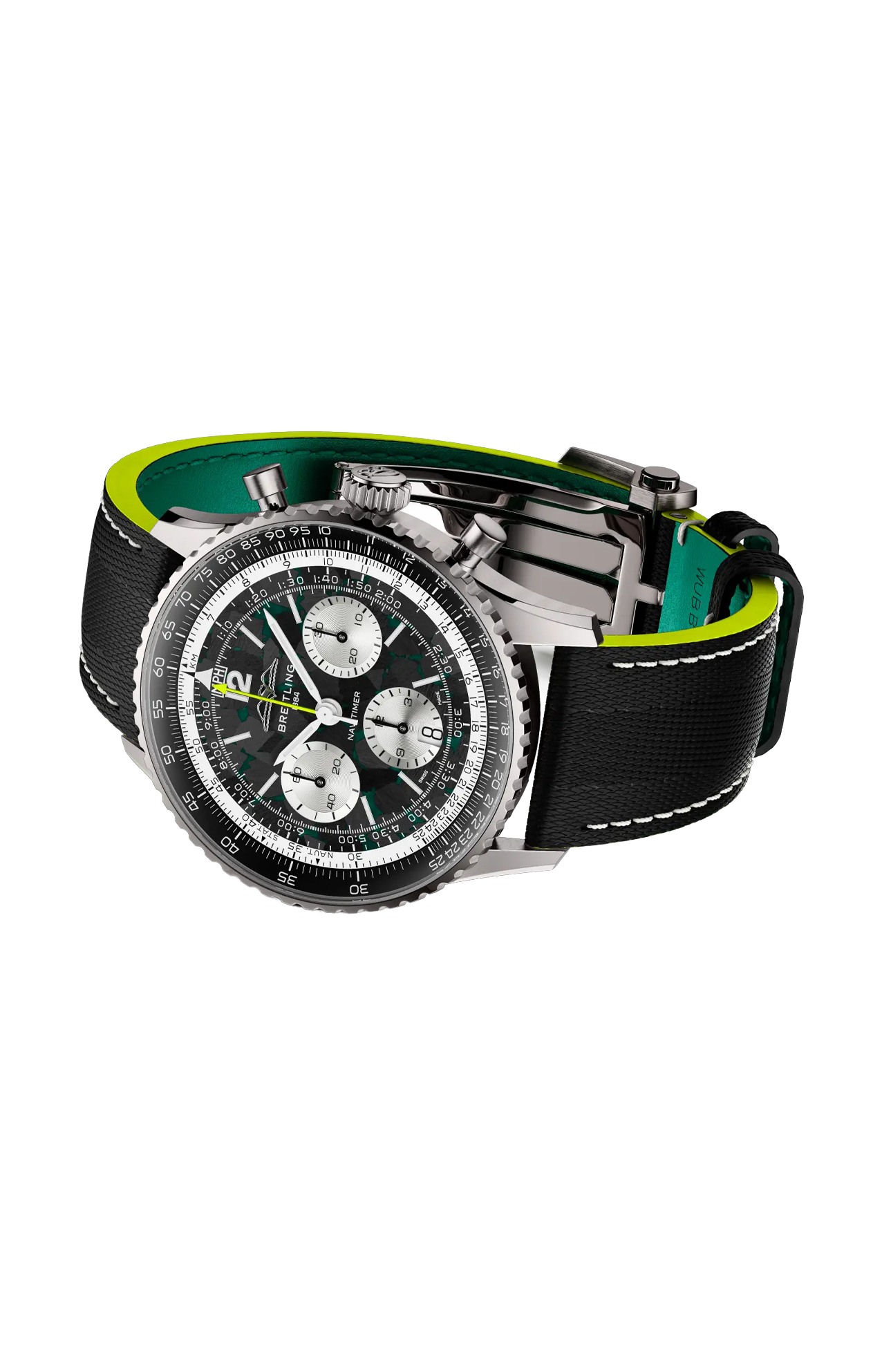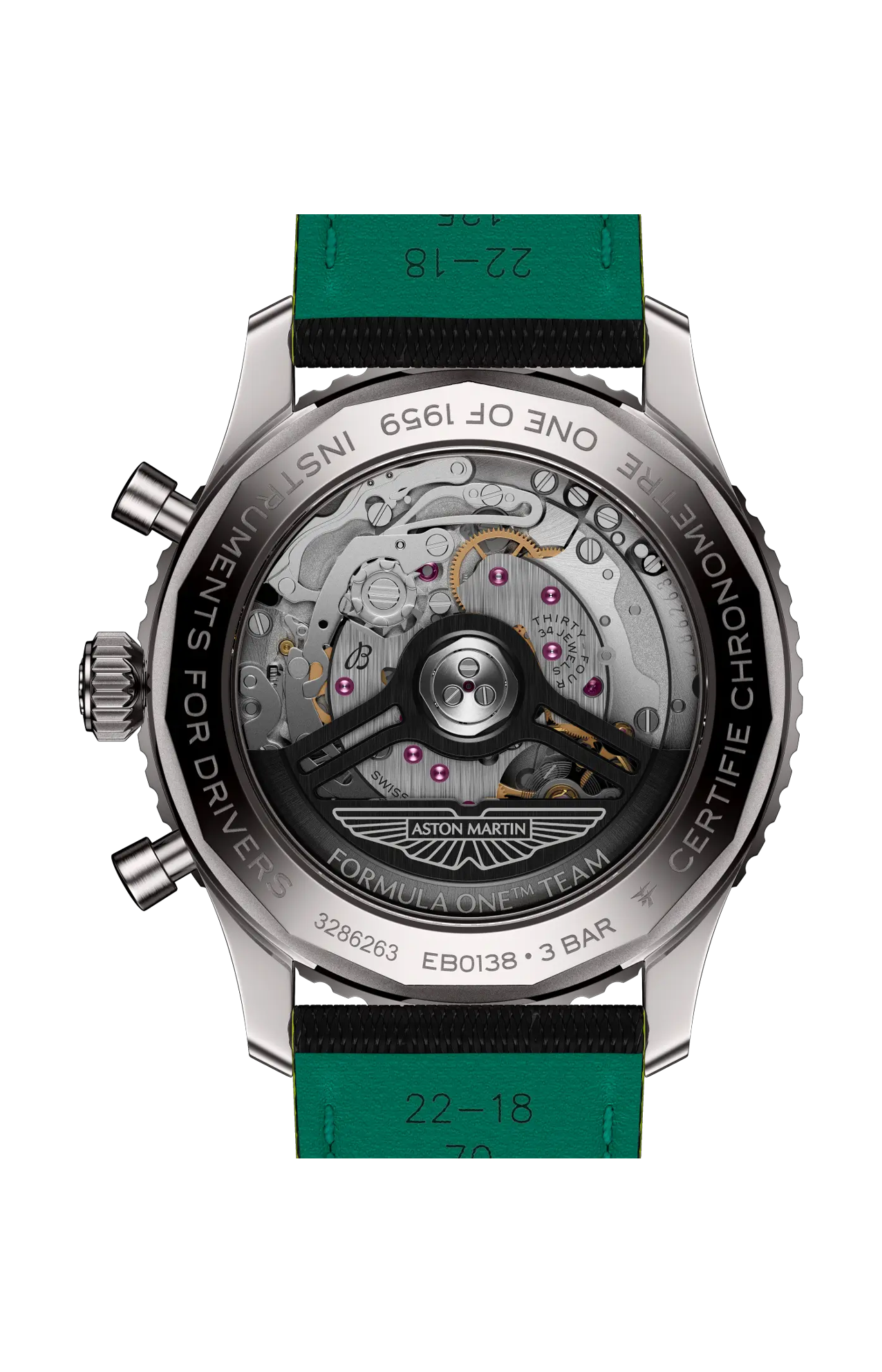 La partnership tra Breitling e Aston Martin Aramco Formula One™ Team prende vita in un Navitimer concepito per un mondo in cui i millisecondi contano. Il Navitimer B01 Chronograph 43 Aston Martin Aramco Formula One™ Team, limitato a 1.959 esemplari, celebra l'anno in cui Aston Martin ha debuttato in Formula 1. Racchiude in sé materiali di alta qualità, ingegneria di precisione e oltre 70 anni di tradizione Navitimer. Dal quadrante in fibra di carbonio alla cassa leggera in titanio fino ai dettagli ispirati all'abitacolo di un'auto da F1, ogni elemento è progettato per una precisione di cronometraggio assoluta anche sotto pressione. Girando l'orologio si rivela il suo motore, il calibro di manifattura Breitling 01 dotato di un rotore nero opaco appositamente sviluppato che porta il logo Aston Martin Aramco. Originariamente sviluppato come strumento per piloti, con un regolo calcolatore circolare per calcoli in tempo reale, il Navitimer è passato dal cielo al circuito, indossato dai piloti che esigevano la stessa precisione in pista.