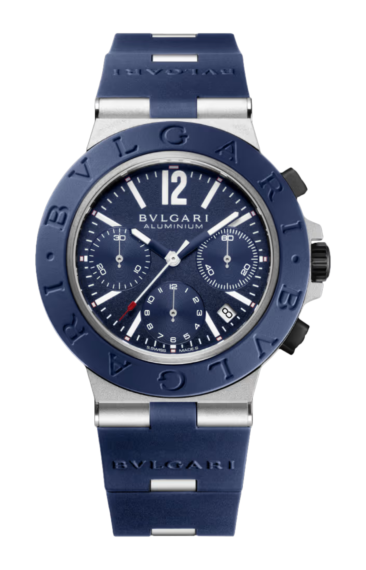 Sin dal lancio della prima generazione di modelli nel 1998, BVLGARI ALUMINIUM ha ridefinito i canoni dell’orologeria sportiva di lusso. Alimentato da un movimento di manifattura a carica automatica con cronografo, l’orologio unisce a una cassa in alluminio una lunetta e un cinturino in caucciù blu. Una nuova espressione cromatica della sua caratteristica combinazione di materiali innovativi e non convenzionali. Incarnando un ideale di eleganza che va oltre ogni genere, età, epoca e tendenza, l'orologio continua ad affermarsi nel panorama dell’orologeria contemporanea con il suo stile audace e il suo spirito pionieristico. Orologio BVLGARI ALUMINIUM CHRONOGRAPH con movimento meccanico di manifattura a carica automatica, funzioni cronografo, ore, minuti, piccoli secondi e data, calibro B381 (6,90 mm), riserva di carica di 42 ore. Cassa di 41 mm in alluminio sabbiato, lunetta in caucciù blu con logo BVLGARI BVLGARI, quadrante verniciato blu con contatori cronografici azuré, finestrella della data a ore 4/5, indici bianchi, lancette ore e minuti in ottone verniciato blu con super-luminova®, lancetta cronografo secondi centrali in ottone rodiato sabbiato con punta laccata rossa, lancette contatori cronografici in ottone laccato bianco, corona e pulsanti in titanio sabbiato con trattamento DLC nero, fondello in titanio sabbiato con finiture satinate e trattamento DLC nero, cinturino in caucciù blu con anse e fibbia ad ardiglione in alluminio sabbiato. Impermeabile fino a 100 metri.