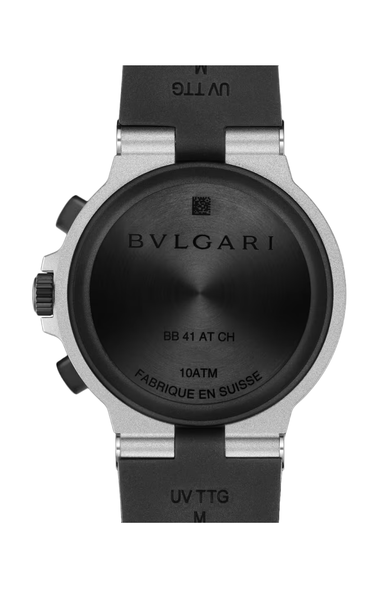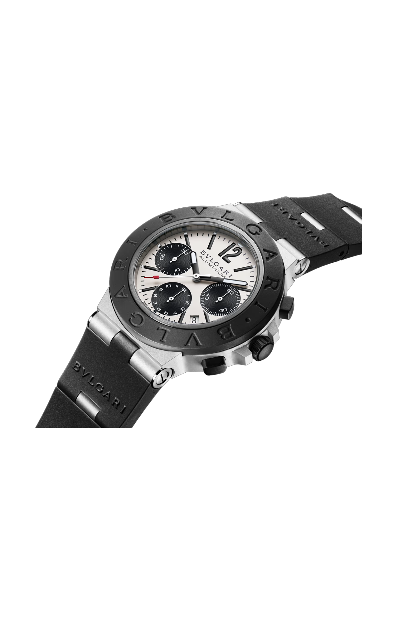 Orologio BVLGARI ALUMINIUM con movimento meccanico di manifattura a carica automatica, cronografo, cassa di 41 mm in alluminio e titanio, lunetta in caucciù nero con logo BVLGARI BVLGARI, quadrante grigio, indicazione della data e cinturino in caucciù nero. Impermeabile fino a 100 metri.