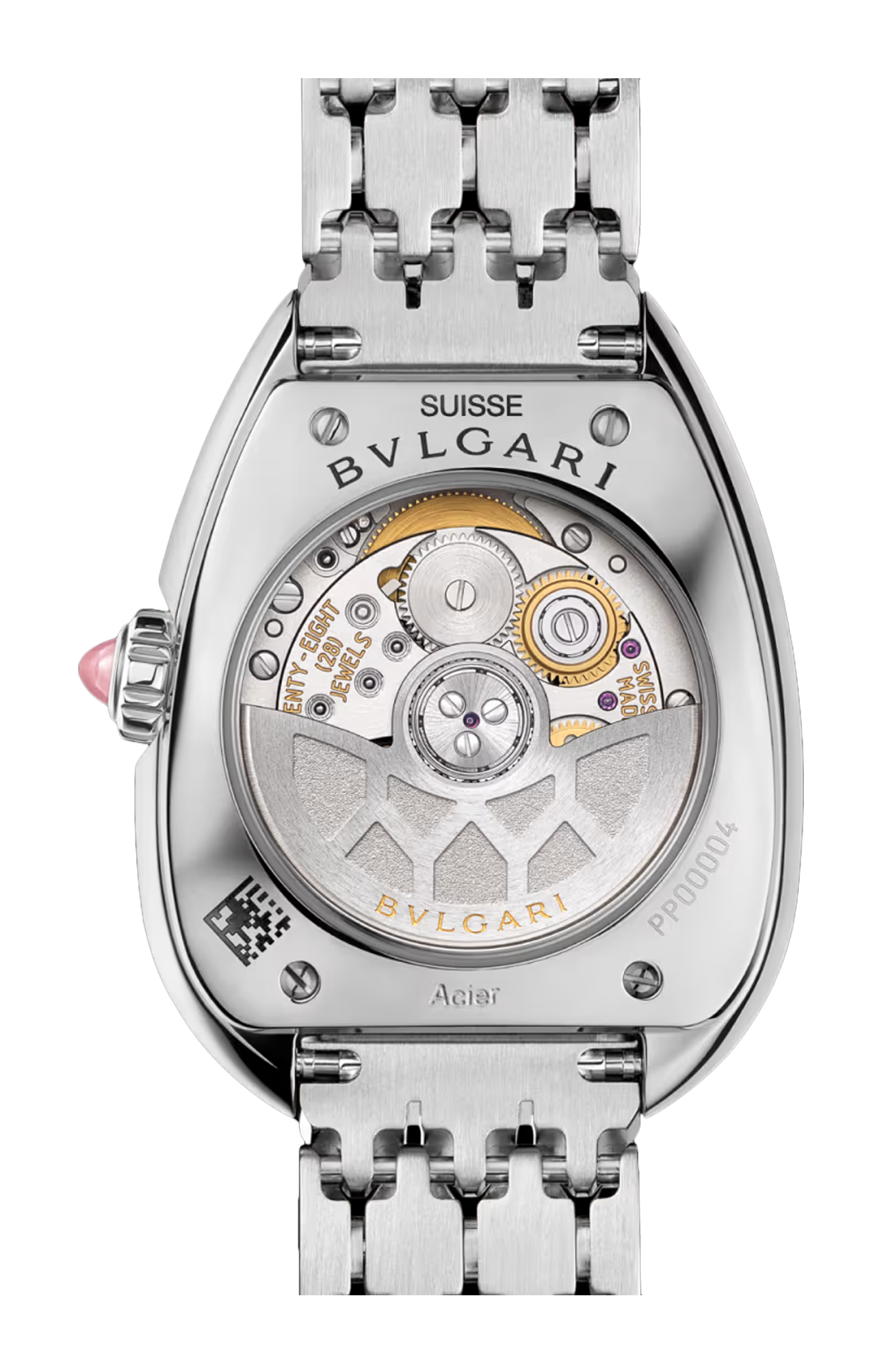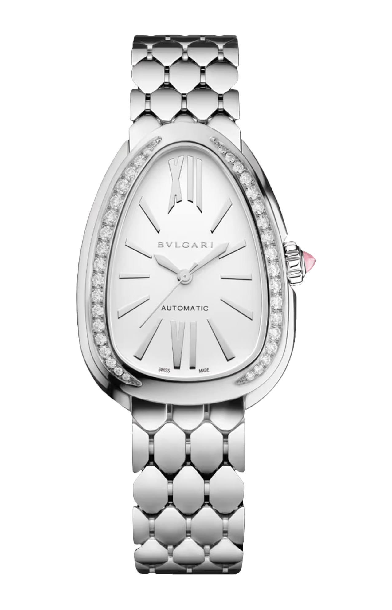 Con il raffinato splendore dei suoi preziosi materiali, l'orologio Serpenti Seduttori in acciaio inossidabile è un trionfo di sensualità, fascino enigmatico e glamour contemporaneo. Contornato dall'iconico design a goccia della cassa, l'incantevole quadrante opalino bianco è illuminato da una lunetta con diamanti, per un effetto sofisticato e scintillante. Il cuore dell'orologio batte al ritmo del movimento automatico di manifattura Lady Solotempo BVS 100. Un perfetto connubio tra precisione e performance, che unisce al savoir-faire di BVLGARI nell'orologeria la maestria della maison nell'arte della gioielleria. A completare il design, un flessuoso bracciale a squame esagonali ispirato alla sinuosa eleganza del serpente. Orologio Serpenti Seduttori con movimento meccanico di manifattura a carica automatica, funzioni ore e minuti, calibro BVS 100 (diametro 19 mm, spessore 3,9 mm) decorato con logo BVLGARI e motivo a squama di serpente, frequenza 3 Hz, 28 rubini, riserva di carica di 50 ore. Cassa di 34 mm in acciaio inossidabile e lunetta con 36 diamanti tondi taglio brillante, corona in acciaio inossidabile con rubellite rosa taglio cabochon, quadrante opalino bianco, fondello a vista, bracciale con fibbia déployante in acciaio inossidabile. Impermeabile fino a 30 metri.