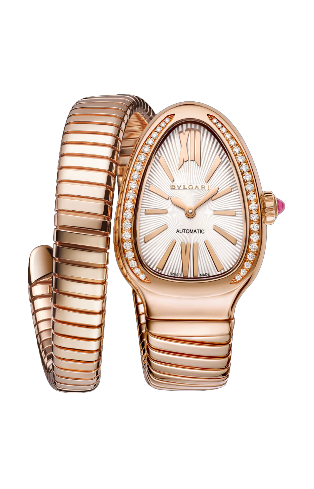 Combinando due dei simboli più iconici del design BVLGARI, l'orologio automatico a spirale Serpenti Tubogas in oro rosa 18 kt unisce alla sinuosa eleganza del serpente il fascino contemporaneo di Tubogas. Con la sua emblematica cassa a forma di testa di serpente, contornata da diamanti e impreziosita da un quadrante opalino bianco con finiture soleil, e il suo bracciale dalle forme ipnotiche e avvolgenti, l’orologio cattura il potere seduttivo del serpente e la flessuosa eleganza delle sue spire. Il cuore dell'orologio batte al ritmo del movimento automatico di manifattura Lady Solotempo BVS 100. Un perfetto connubio tra precisione e performance, che unisce al savoir-faire di BVLGARI nell'orologeria la maestria della maison nell'arte della gioielleria. Orologio Serpenti Tubogas con movimento meccanico di manifattura a carica automatica, funzioni ore e minuti, calibro BVS 100 (diametro 19 mm, spessore 3,9 mm) decorato con logo BVLGARI e motivo a squama di serpente, frequenza 3 Hz, 28 rubini, riserva di carica di 50 ore. Cassa ricurva di 35 mm in oro rosa 18 kt e lunetta con 40 diamanti tondi taglio brillante, quadrante opalino bianco con motivo guilloché soleil, fondello a vista, corona in oro rosa 18 kt con rubellite rosa taglio cabochon, bracciale a spirale in oro rosa 18 kt (misura 135 mm). Impermeabile fino a 30 metri.