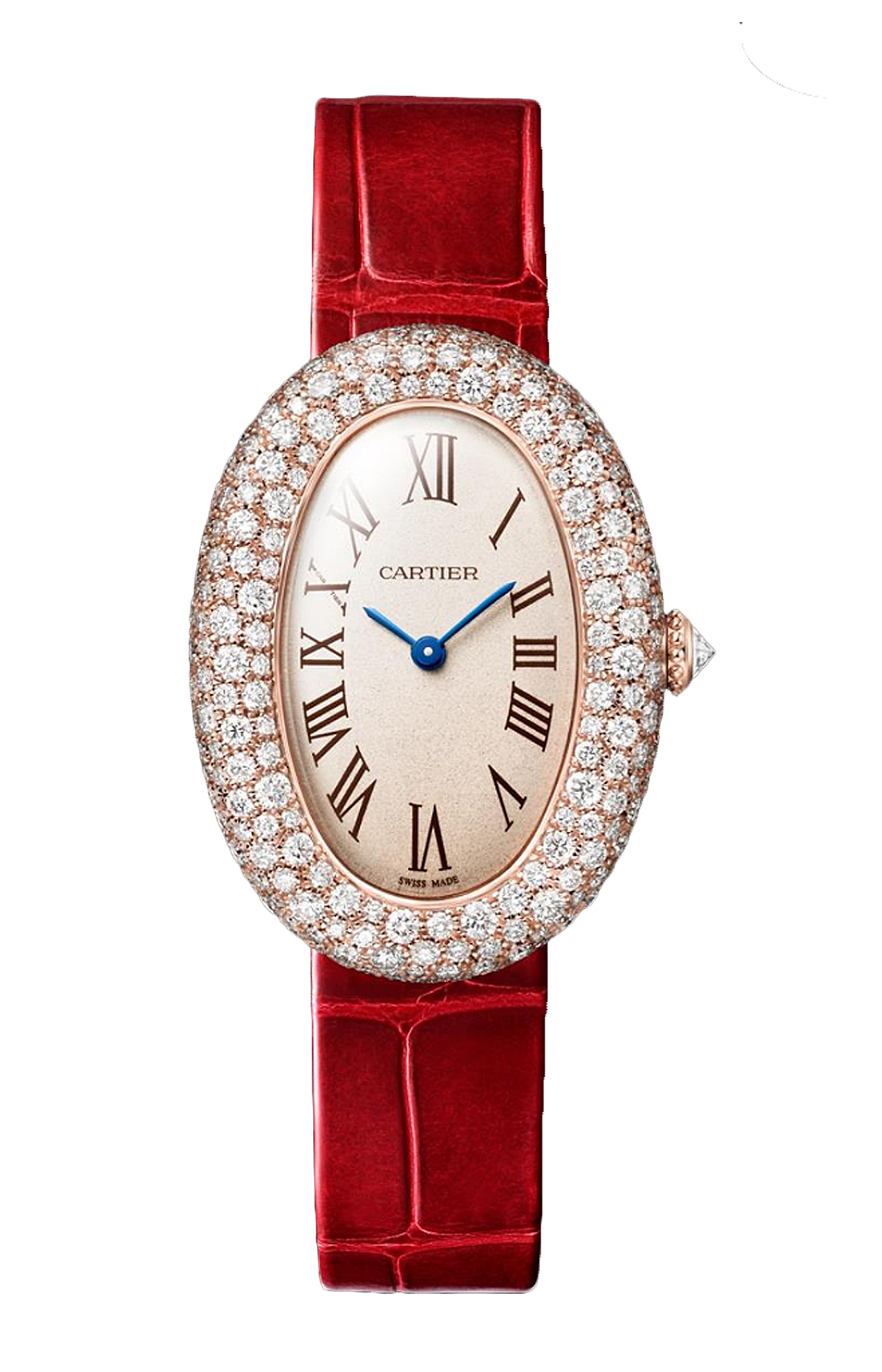 Orologio Baignoire, modello medio, movimento al quarzo. Cassa in oro rosa 750/1000 ornata di 286 diamanti taglio brillante (3,56 carati). Corona perlata in oro rosa 750/1000 ornata di un diamante taglio brillante (0,14 carati). Quadrante granulato argentato, lancette a forma di gladio d’acciaio azzurrato, vetro zaffiro. Cinturino d’alligatore rosso, fibbia ardiglione in oro rosa 750/1000. Dimensioni della cassa: 36 mm x 26 mm, spessore: 8,5 mm. Impermeabile fino a 30 metri.