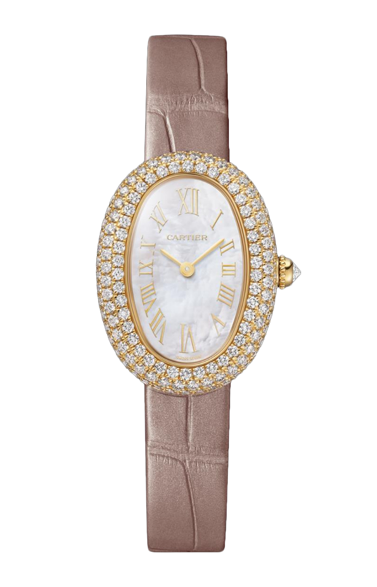 Orologio Baignoire, modello piccolo, movimento al quarzo. Cassa in oro giallo 750/1000 ornata di 227 diamanti taglio brillante (2,25 carati). Corona perlata in oro giallo 750/1000 ornata di un diamante taglio brillante (0,08 carati). Quadrante in madreperla, lancette a forma di gladio d’acciaio finitura oro, vetro zaffiro. Cinturino d’alligatore semi-opaco beige, fibbia ardiglione in oro giallo 750/1000. Dimensioni della cassa 31,4 x 23,1 mm, spessore 6,9 mm. Impermeabile fino a 30 metri.
