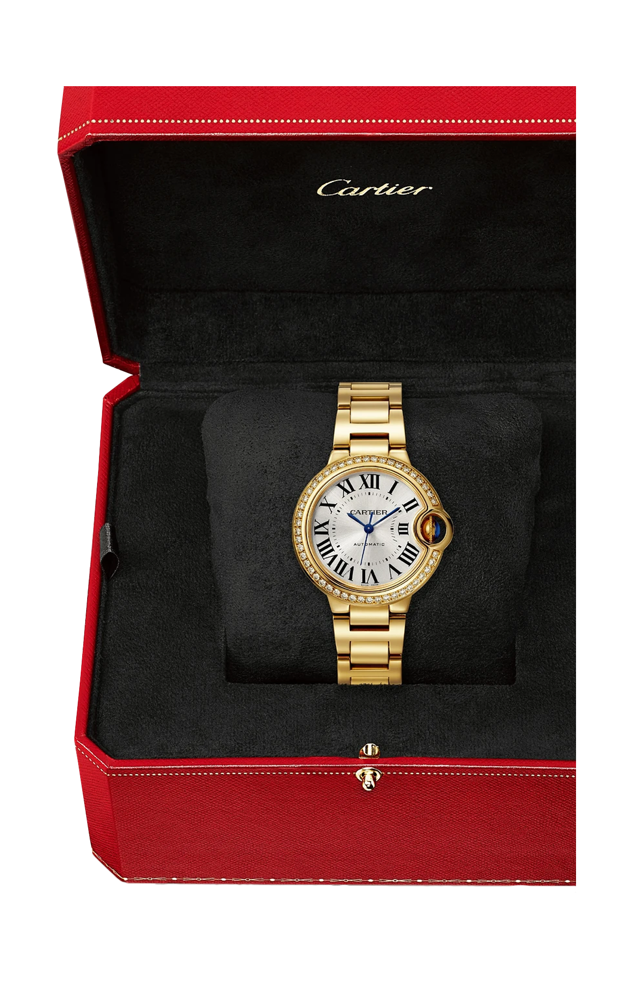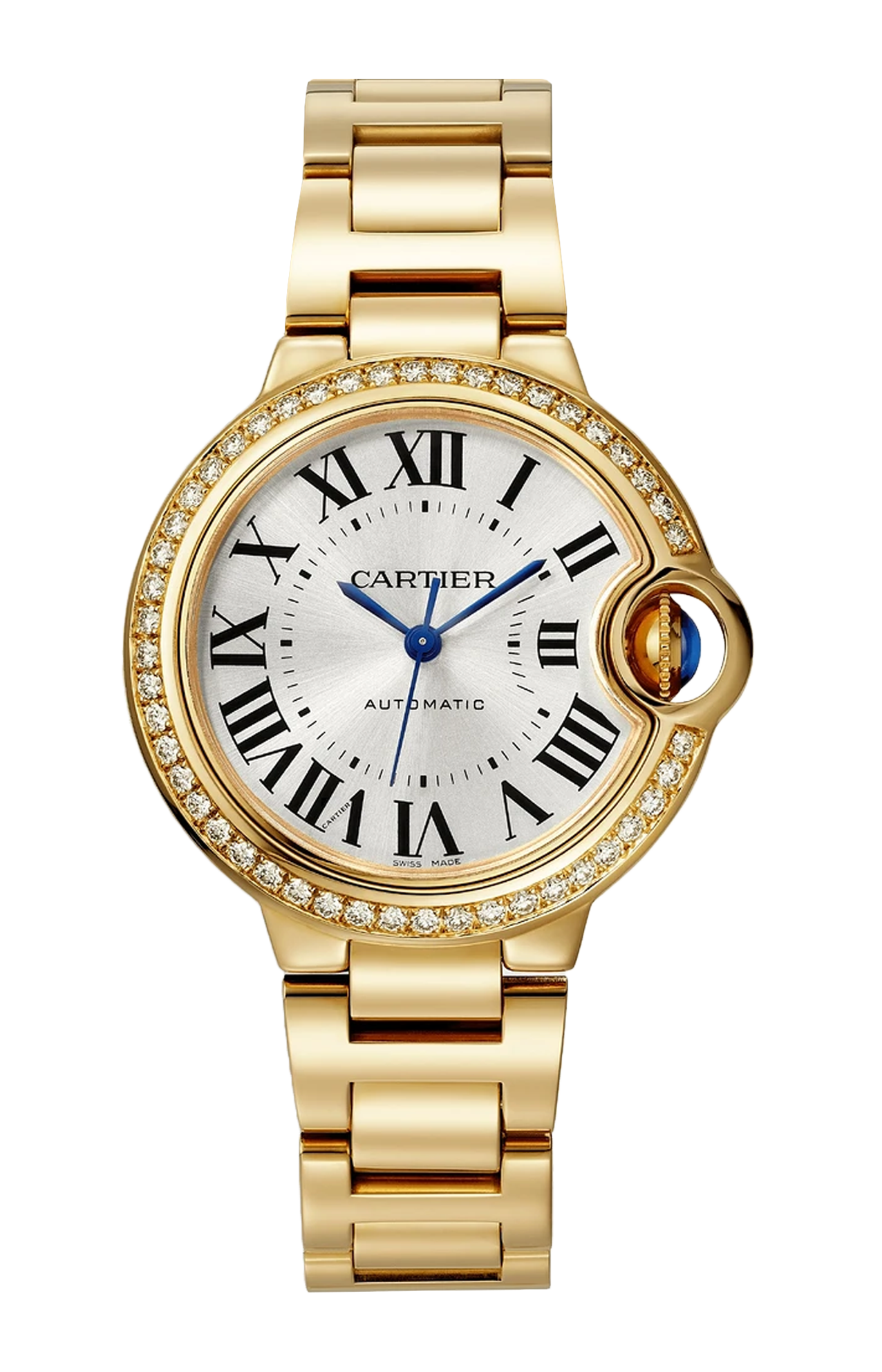Orologio Ballon Bleu de Cartier, 33 mm. Movimento meccanico a carica automatica. Cassa in oro giallo 750/1000 ornata di 47 diamanti taglio brillante (0,68 carati). Corona scanalata ornata di uno zaffiro cabochon. Quadrante effetto soleil argentato. Lancette a forma di gladio d’acciaio azzurrato. Vetro zaffiro. Bracciale intercambiabile in oro giallo 750/1000. Spessore 10,16 mm. Impermeabile fino a 30 metri.