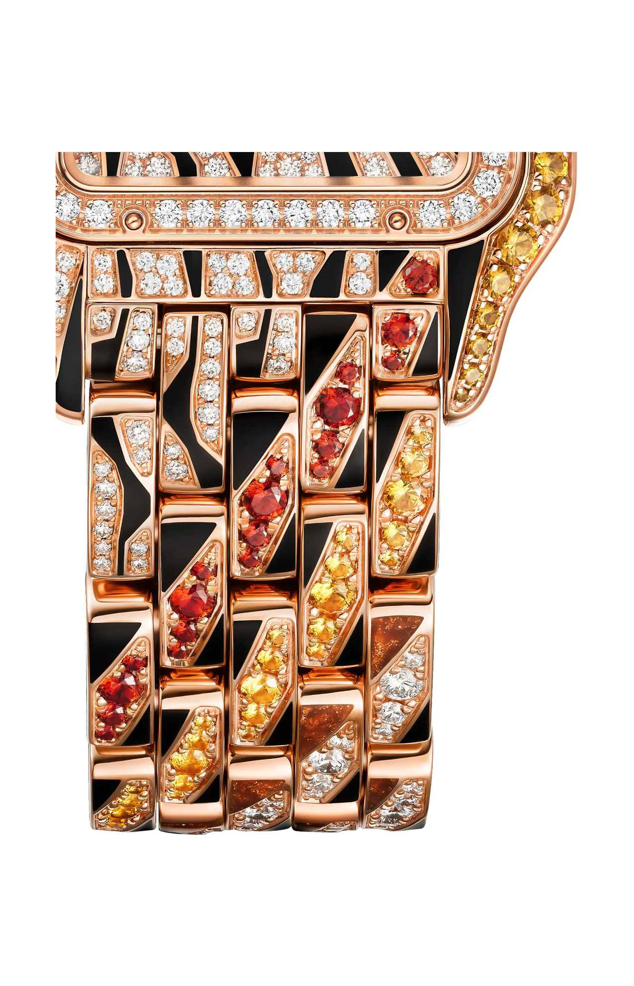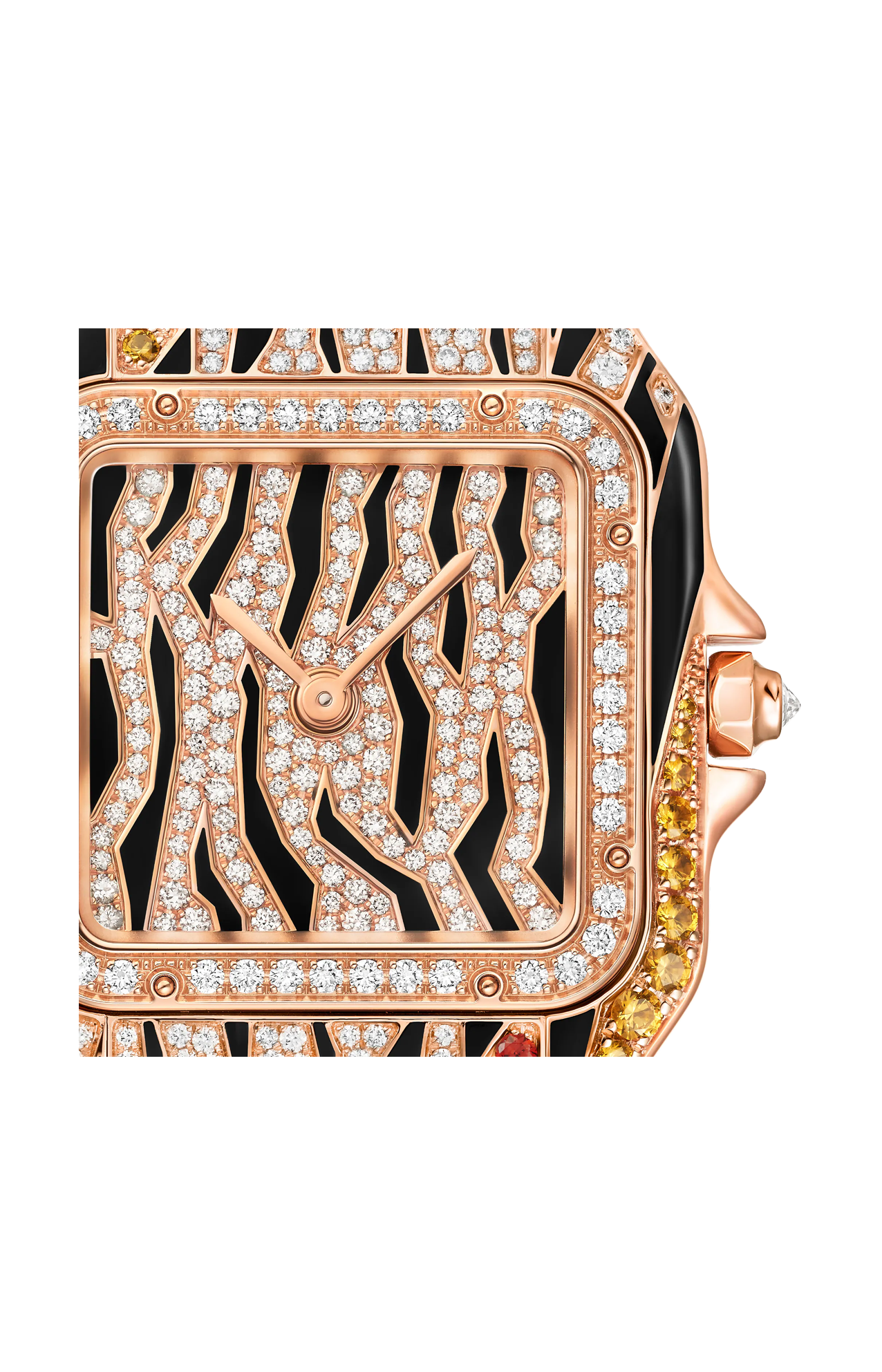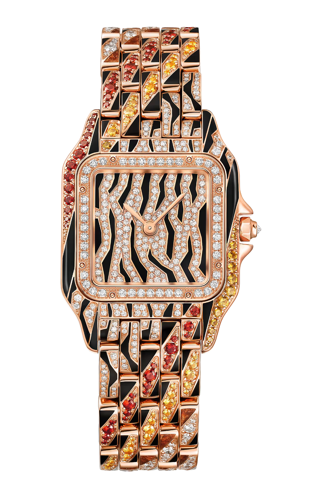 Orologio gioiello per eccellenza, Panthère è una creazione protagonista di molteplici interpretazioni creative. Le versioni animalier dell’iconica pantera hanno ispirato Cartier per la creazione di un manto astratto, metà zebra e metà tigre. Una composizione grafica con motivi in lacca nera e marrone dorato, pavé di diamanti e spessartiti arancioni e gialle. La rivisitazione dell’orologio Panthère ha richiesto l’intervento di un savoir-faire esperto, come dimostrano la laccatura - realizzata a mano e cotta ad alta temperatura presso la Maison des Métiers d’Art di Cartier - e l’incastonatura a neve del quadrante, decorato con 145 diamanti taglio brillante.