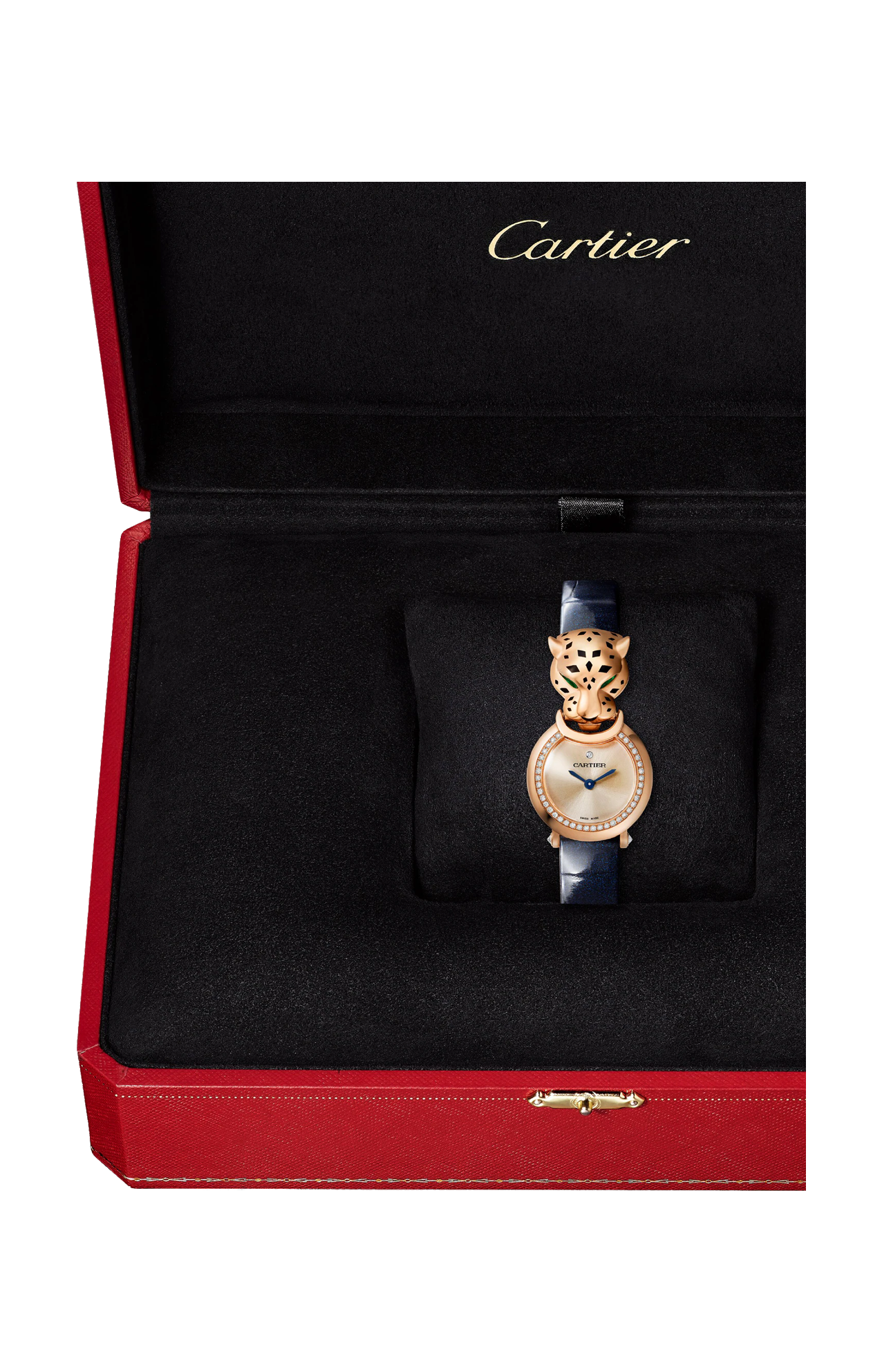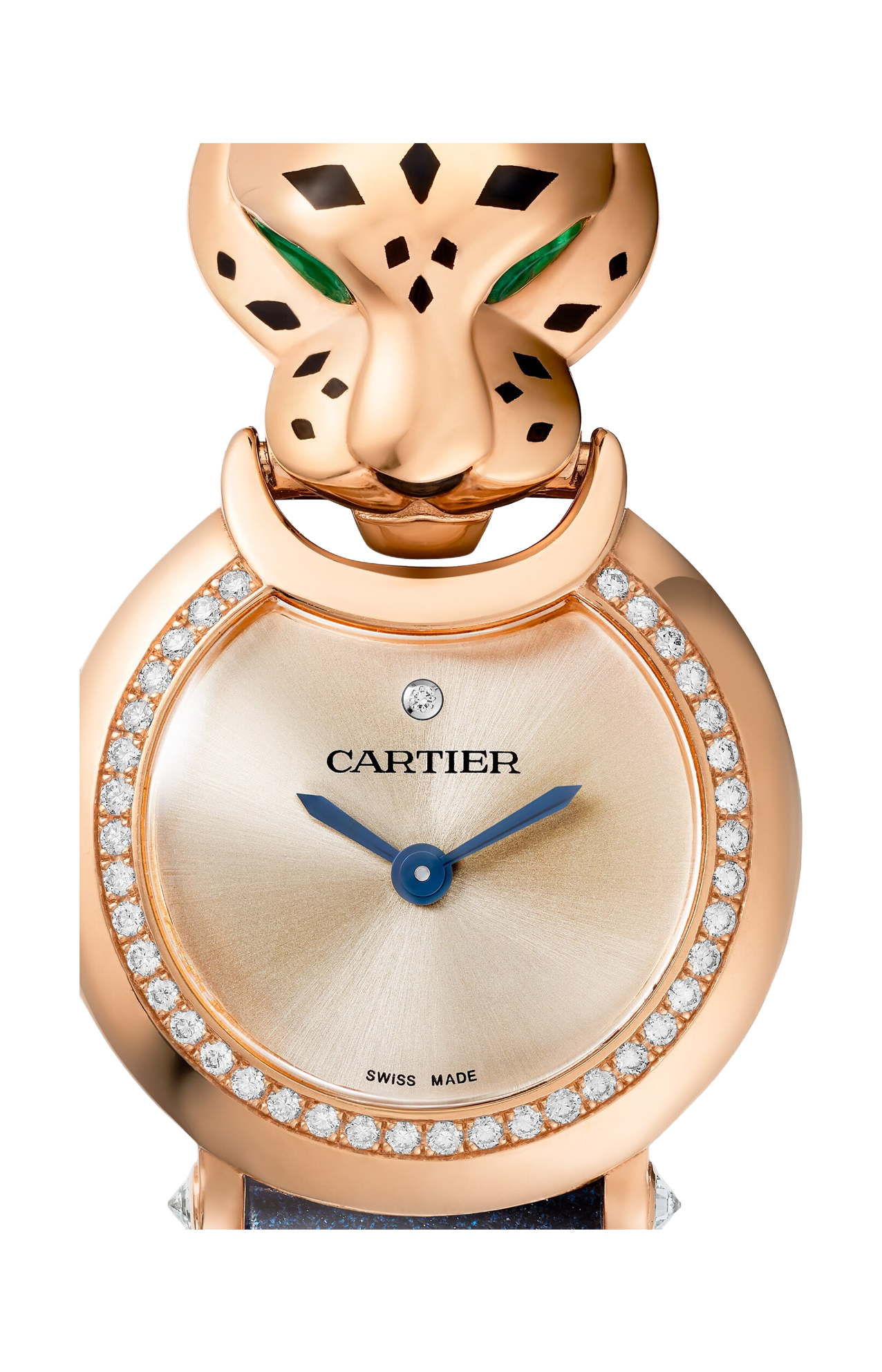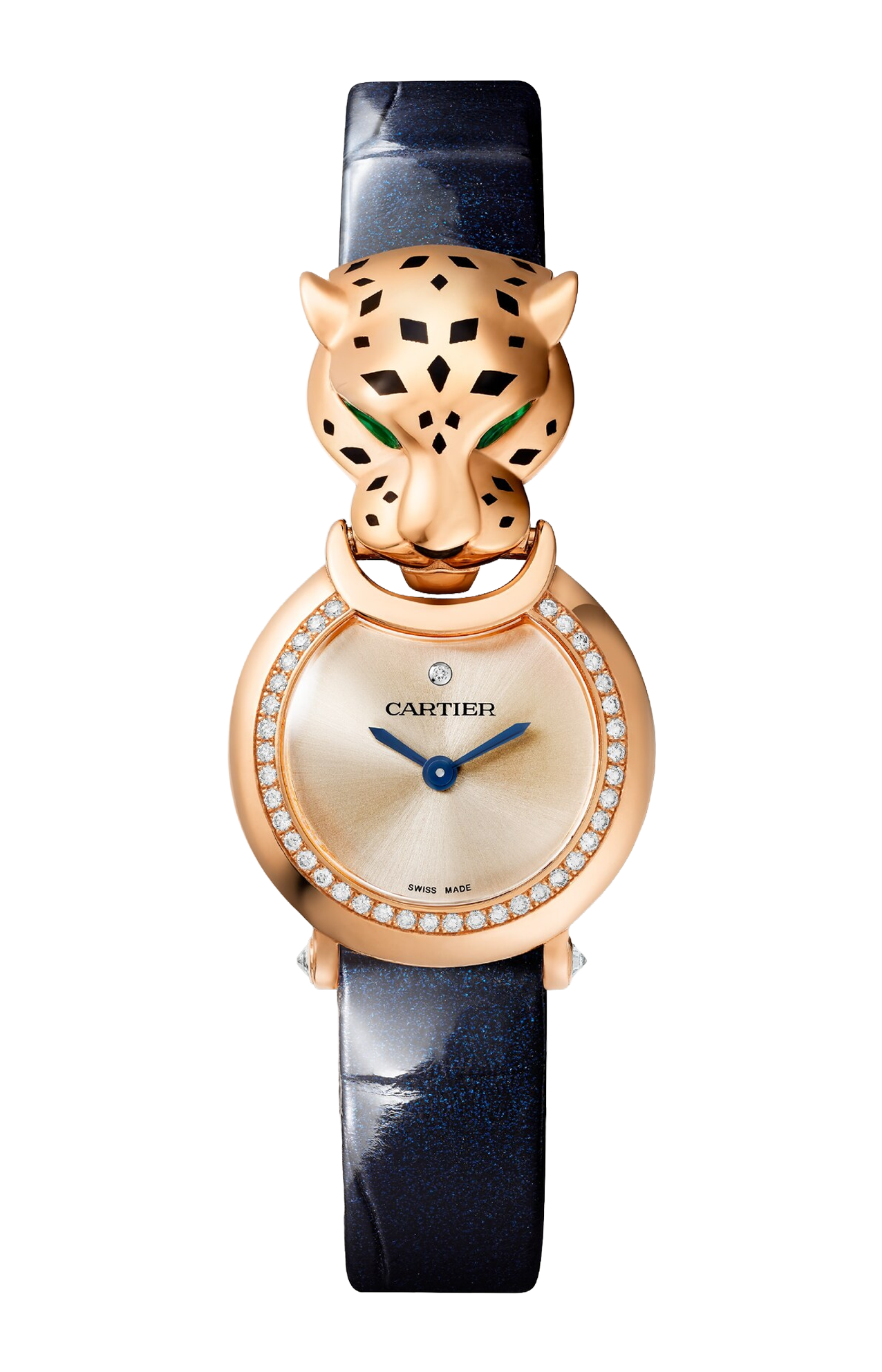 Orologio Panthère de Cartier, movimento al quarzo. Cassa in oro rosa 18 carati (750/1000) incastonata con 40 diamanti taglio brillante per un totale di 0,24 carati, testa di pantera in oro rosa 18 carati (750/1000), occhi in tsavorite taglio a goccia, macchie e naso in lacca nera, quadrante dorato, lancette a forma di gladio in acciaio azzurrato, cinturino in alligatore blu navy lucido, fibbia ad ardiglione in oro rosa 18 carati (750/1000). Diametro cassa: 23,6 mm. Spessore: 7,8 mm. Resistente all'acqua fino a 3 bar (circa 30 metri/100 piedi).