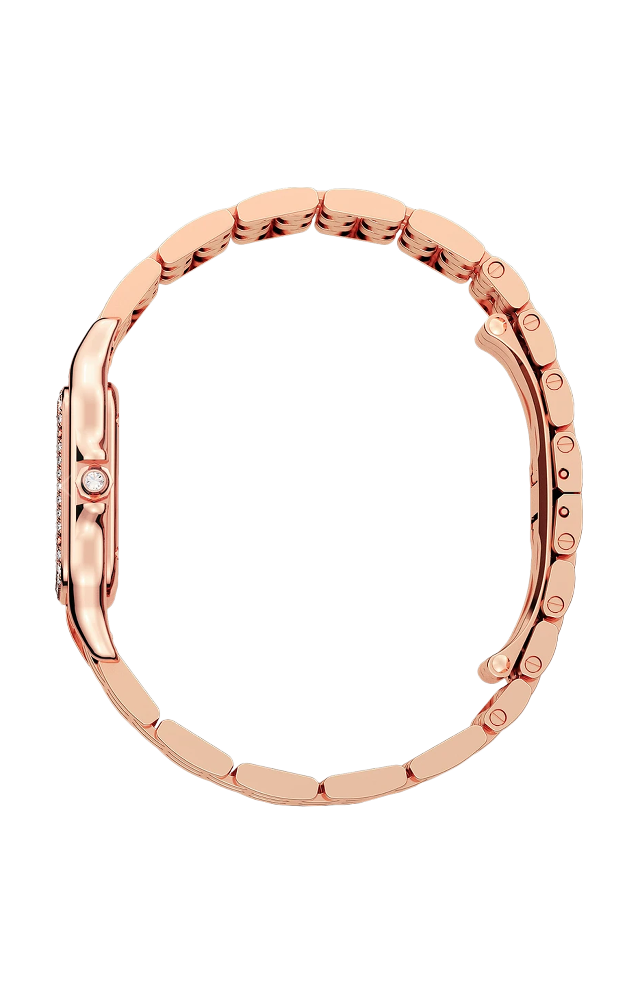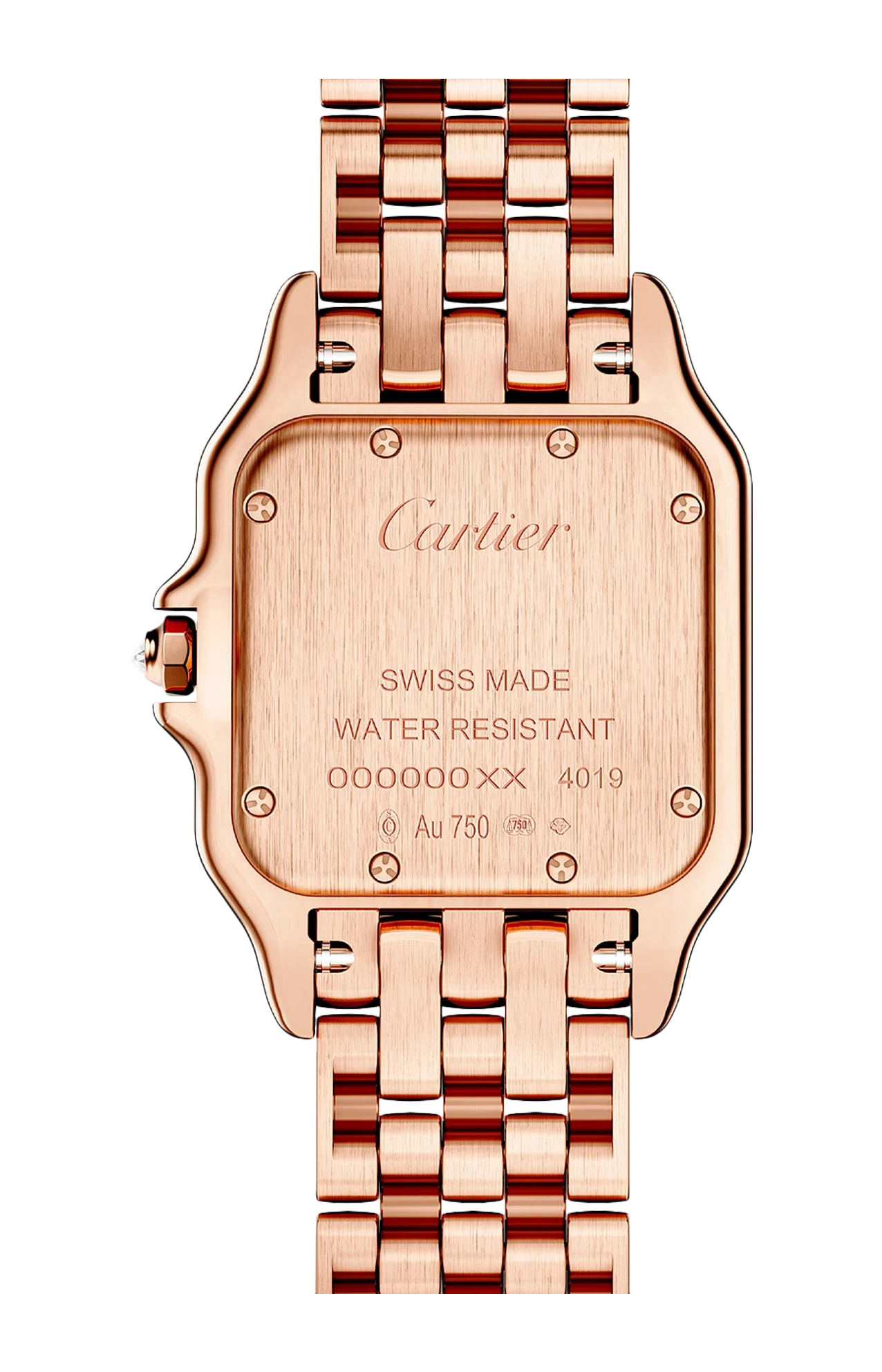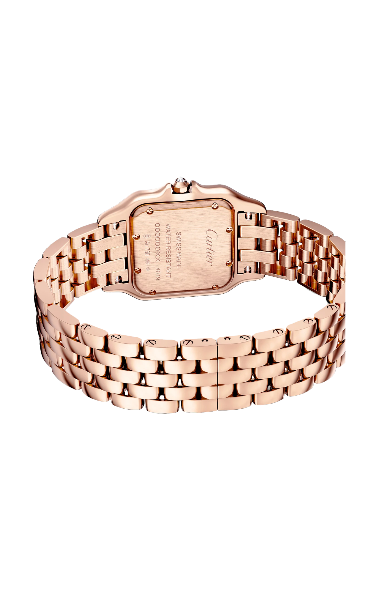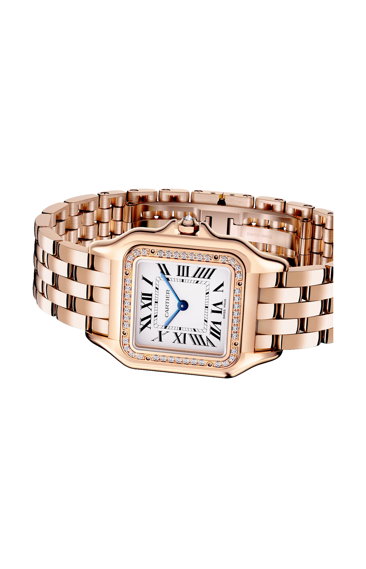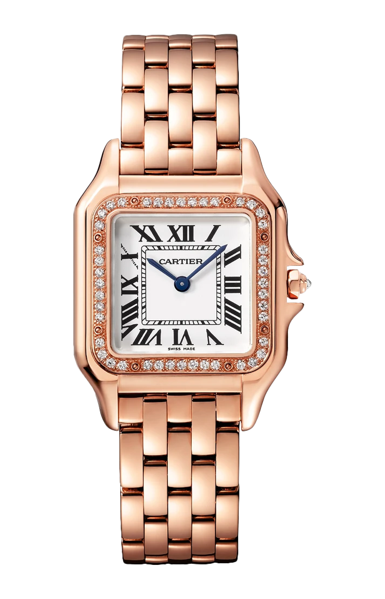 Orologio Panthère de Cartier, modello medio, movimento a quarzo. Cassa in oro rosa 750/1000 ornata di diamanti taglio brillante, dimensioni 27 x 36 mm, spessore 6 mm, corona ornata di un diamante, quadrante argentato, lancette a forma di gladio d'acciaio azzurrato, bracciale in oro rosa 750/1000, impermeabile fino a 30 metri.