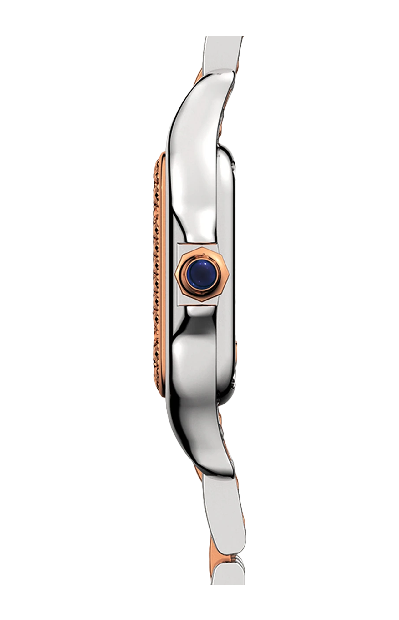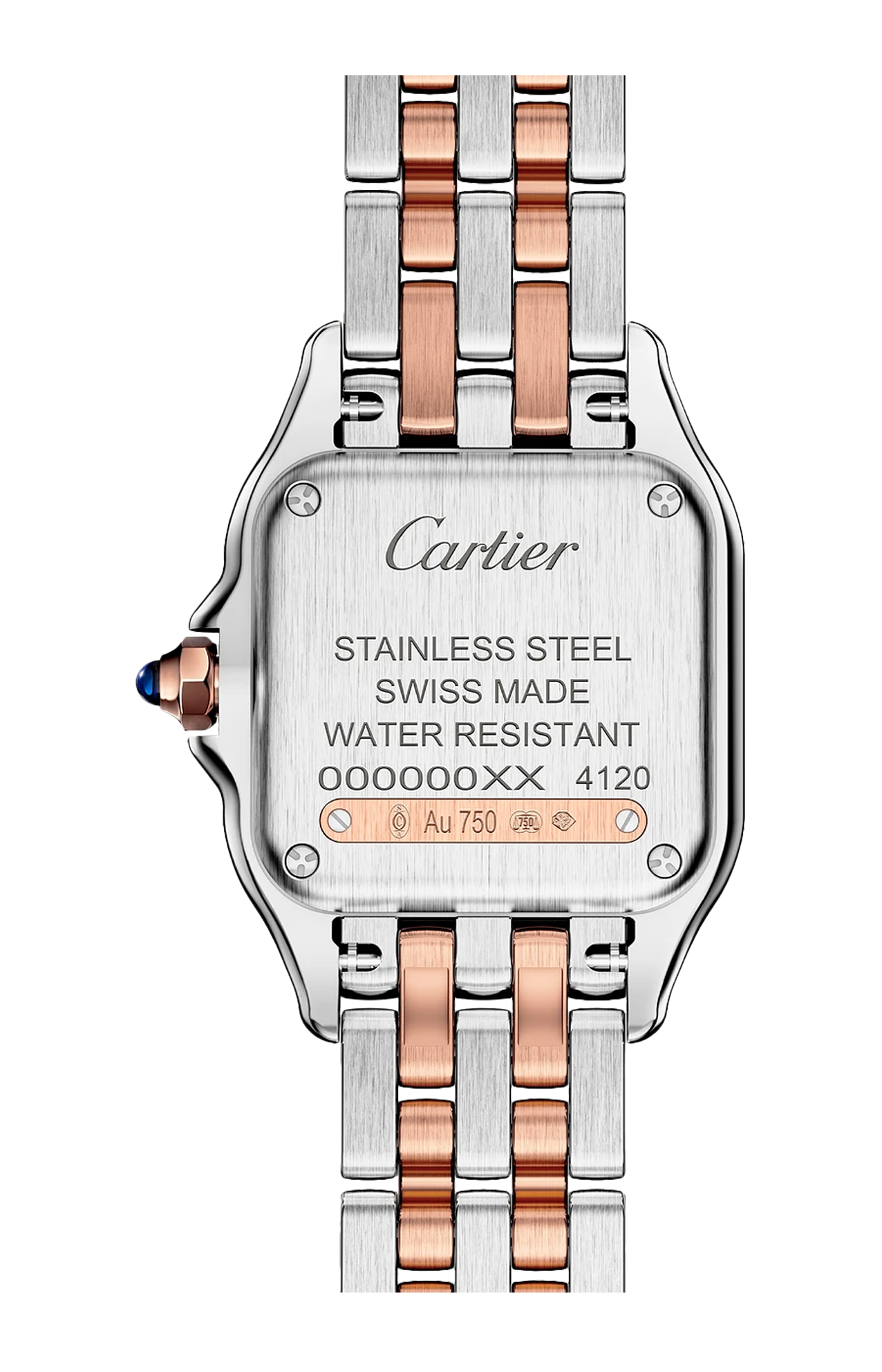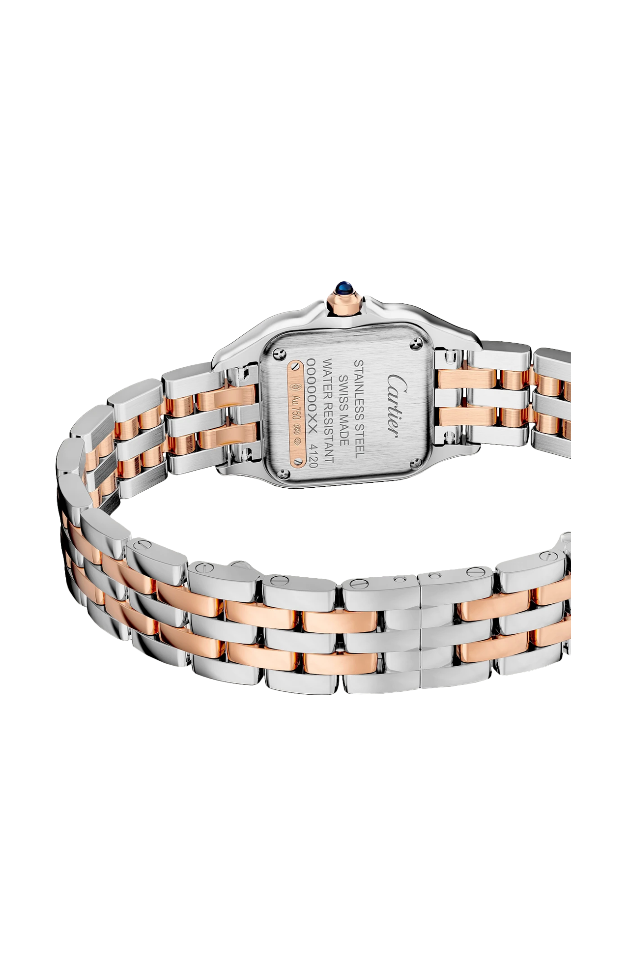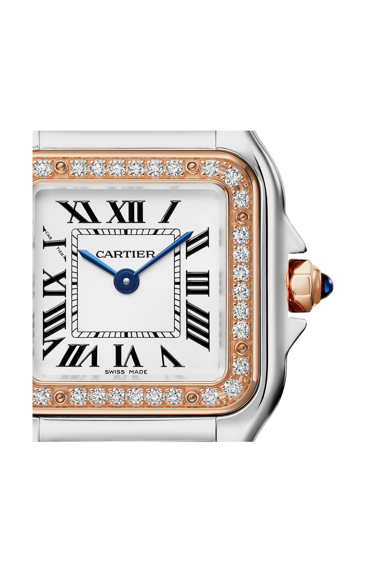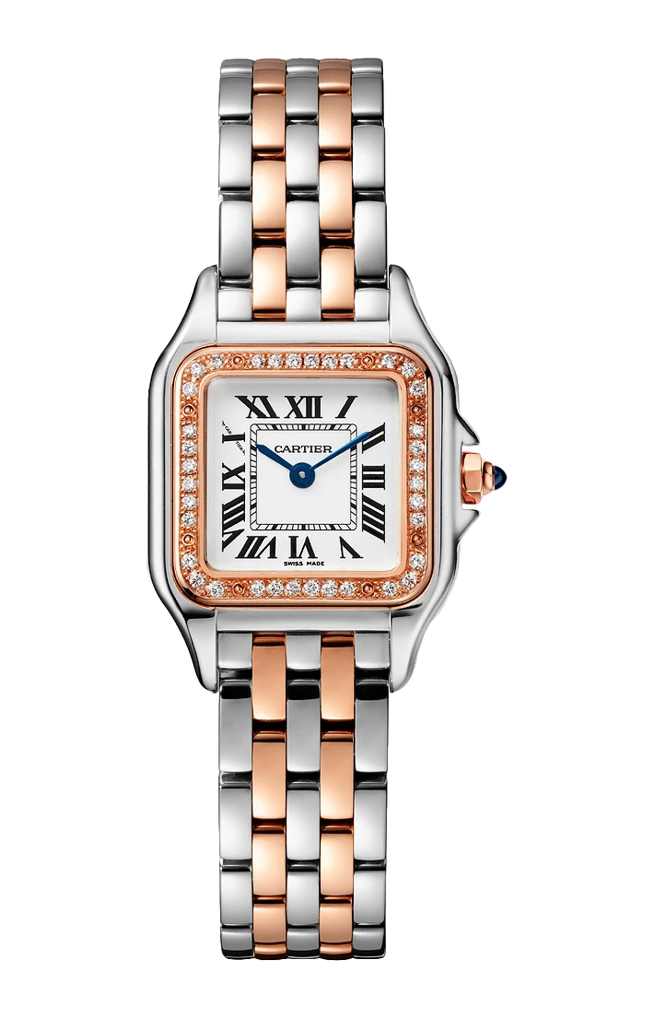 Orologio Panthère de Cartier, modello piccolo, movimento a quarzo. Cassa in oro rosa 750/1000 e acciaio, lunetta ornata di diamanti taglio brillante, dimensioni 22 x 30 mm, spessore 6 mm, corona ornata di uno spinello sintetico blu, quadrante argentato, lancette a forma di gladio d'acciaio azzurrato, bracciale in oro rosa 750/1000 e acciaio, impermeabile fino a 30 metri.