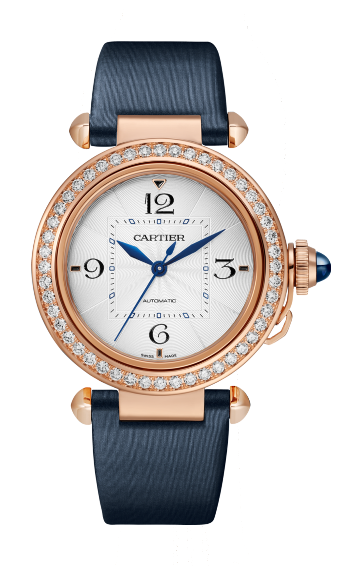 Orologio Pasha de Cartier, 35 mm, movimento meccanico a carica automatica, calibro 1847 MC. Cassa in oro rosa 750/1000, lunetta ornata di 48 diamanti taglio brillante (1,15 carati), copricorona e corona scanalati e ornati di zaffiri, quadrante argentato lavorazione flinqué, lancette a forma di losanga d’acciaio azzurrato, bracciale in oro rosa 750/1000 con sistema di regolazione della misura SmartLink, secondo cinturino in pelle di vitello satinata blu navy, fibbia pieghevole intercambiabile in oro rosa 750/1000. Entrambi sono dotati del sistema d’intercambiabilità QuickSwitch. Diametro della cassa 35 mm, spessore 9,37 mm. Impermeabile fino a 100 metri.