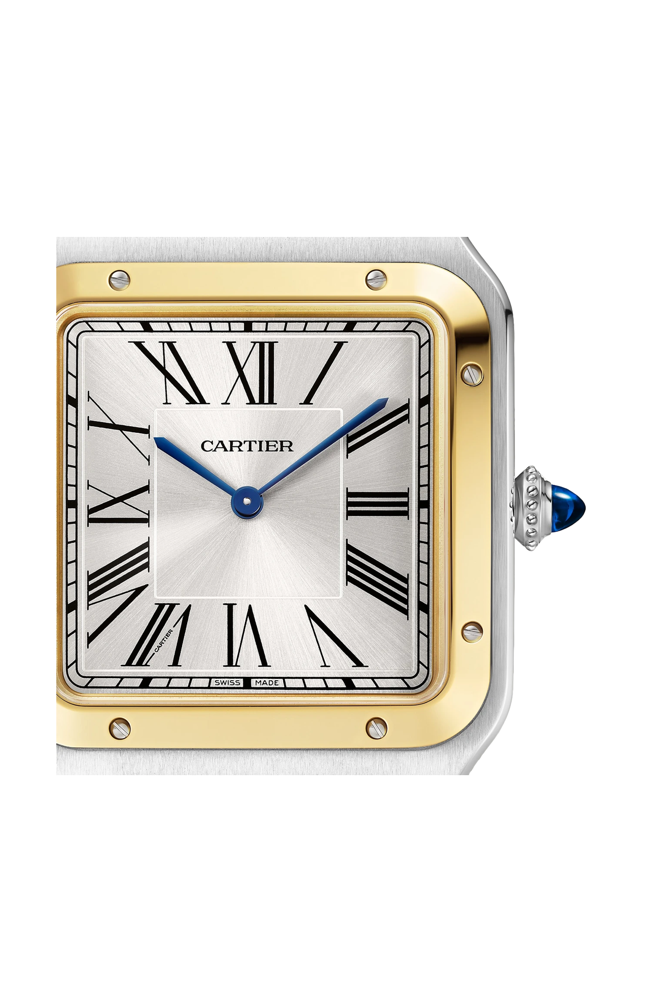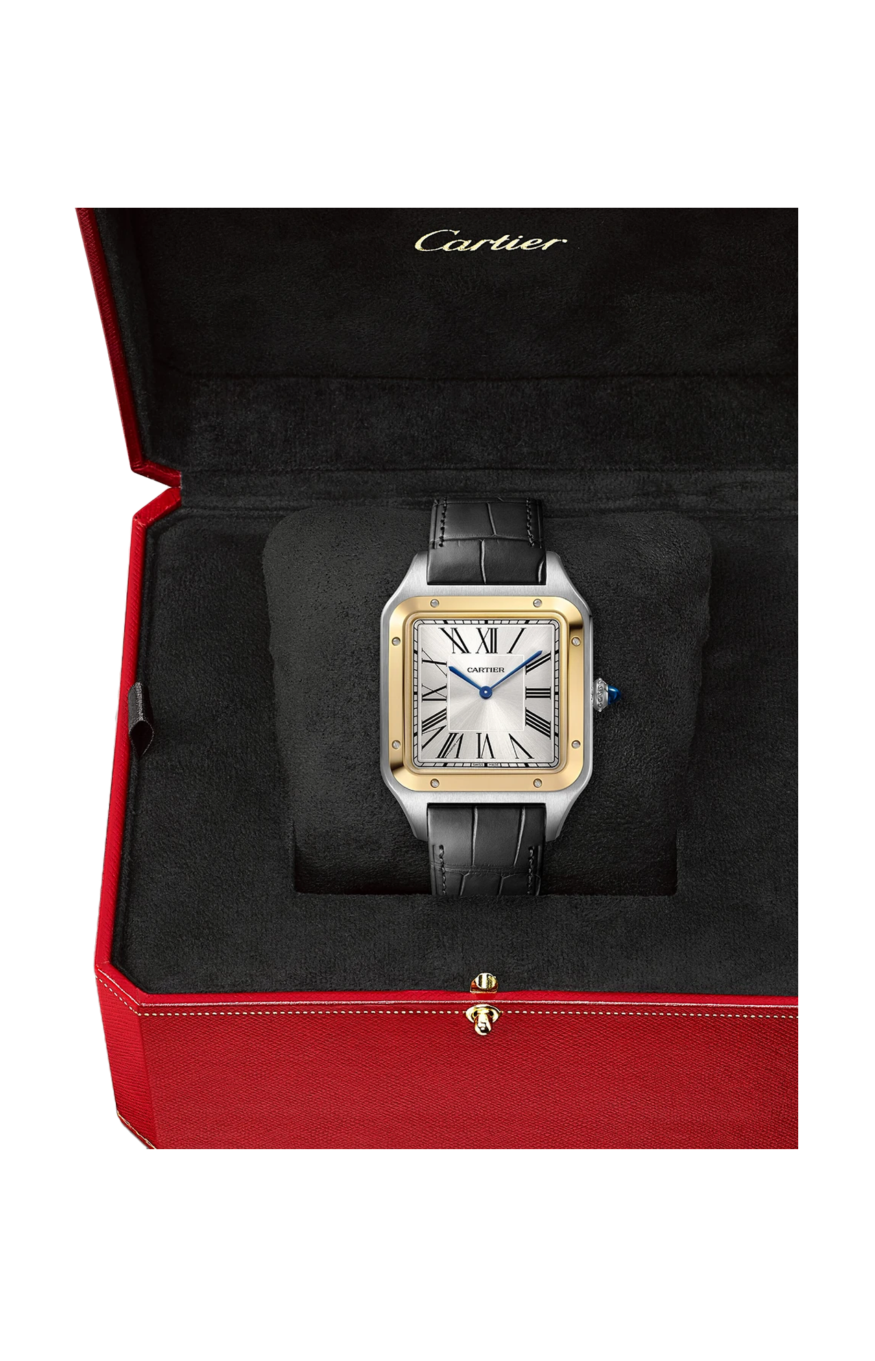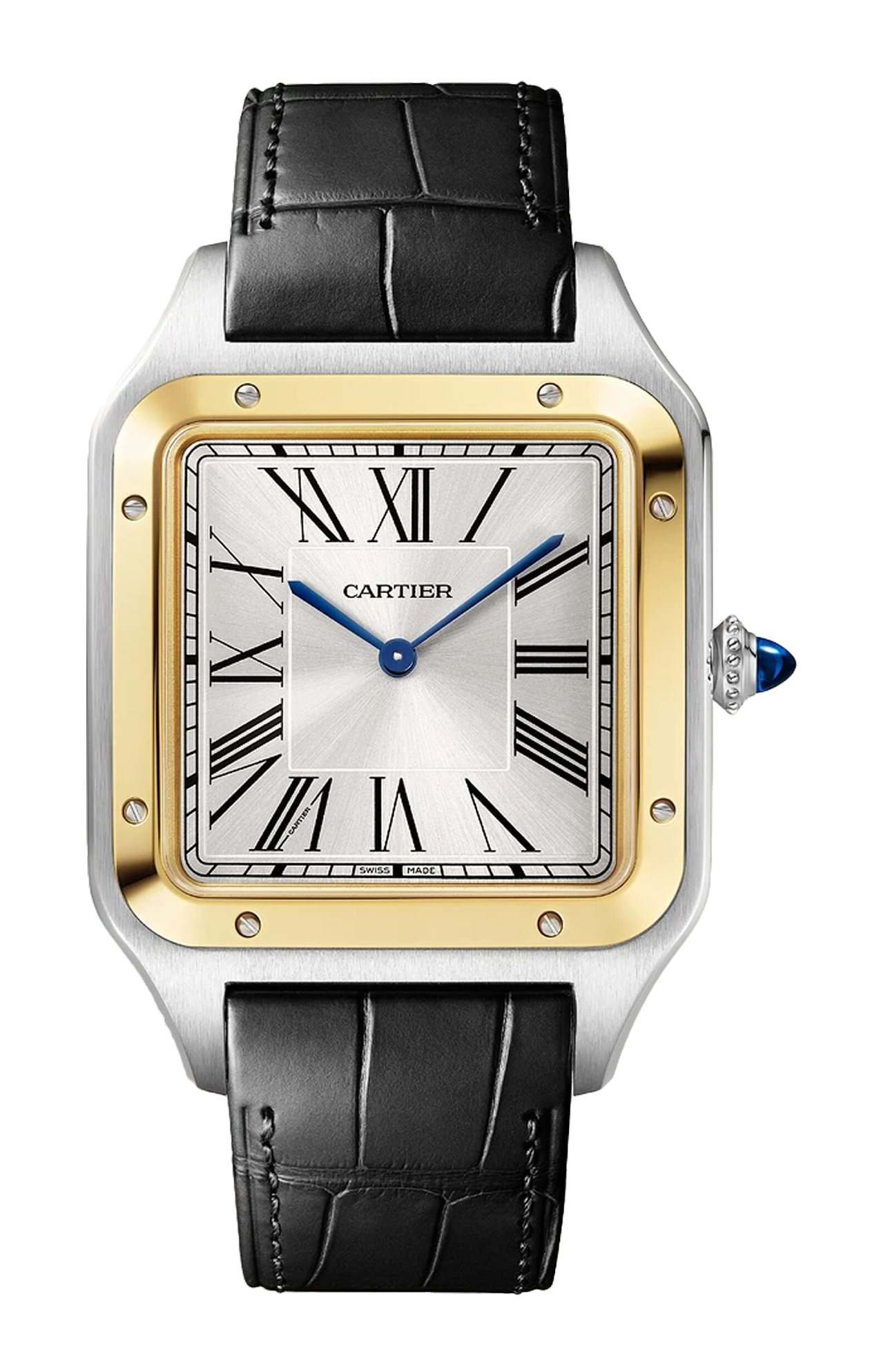Orologio Santos-Dumont, modello Extra-Large, movimento meccanico a carica manuale 430 MC. Cassa in acciaio e lunetta in oro giallo 750/1000, corona perlata ornata di uno spinello blu sintetico cabochon, quadrante argentato con finitura effetto soleil, cifre romane, lancette a forma di gladio in acciaio blu, vetro zaffiro. Fondello dell’orologio con incisione raffigurante la firma autografa di Alberto Santos-Dumont. Cinturino in alligatore antracite con fibbia ardiglione in acciaio. Dimensioni della cassa 33,9 x 46,6 mm, spessore 7,5 mm. Impermeabile fino a 30 metri.