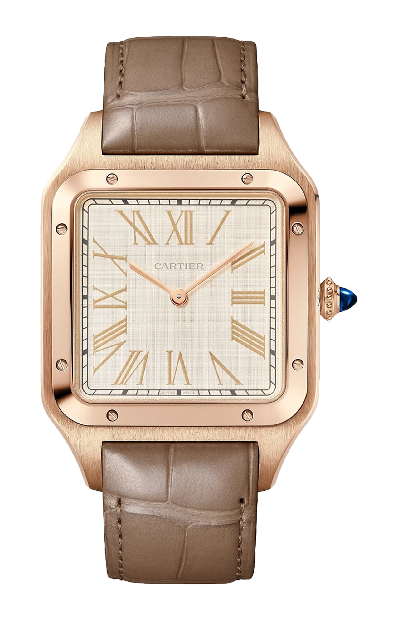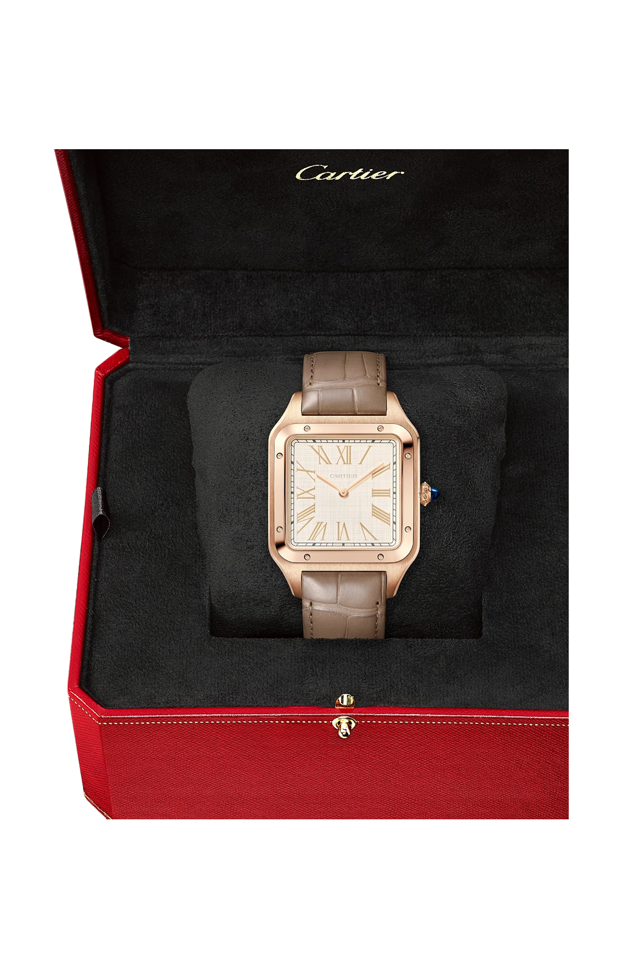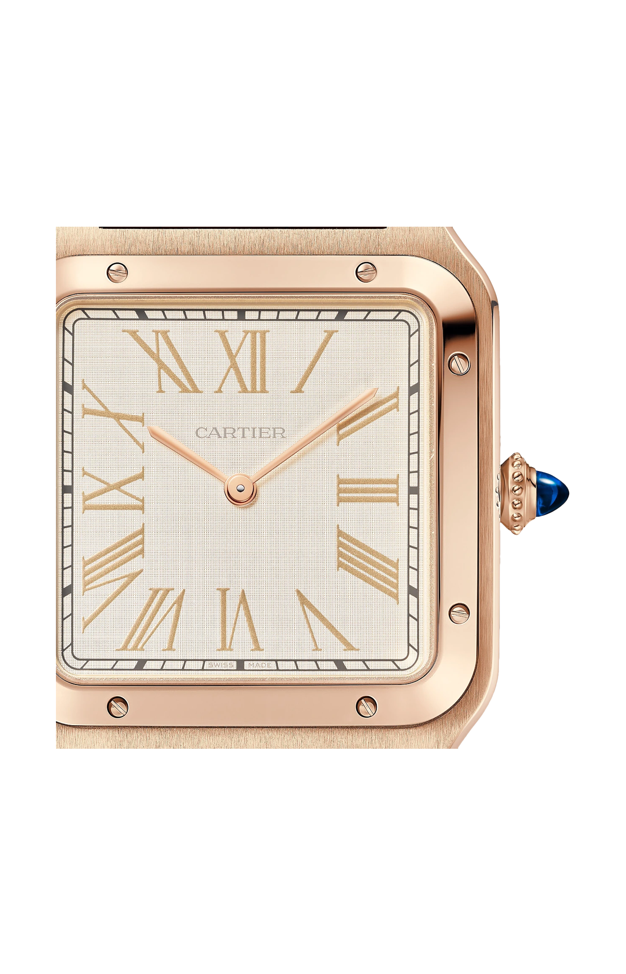 Orologio Santos-Dumont, modello Extra-Large, movimento meccanico a carica manuale 430 MC. Cassa e lunetta in oro rosa 750/1000, corona perlata in oro rosa 750/1000 ornata di uno zaffiro blu cabochon, quadrante beige galvanizzato, cifre romane, lancette a forma di gladio in acciaio con finiture oro rosa, vetro zaffiro. Fondello dell’orologio con incisione raffigurante la firma autografa di Alberto Santos-Dumont. Cinturino in alligatore grigio con fibbia ardiglione in oro rosa 950/1000. Dimensioni della cassa 33,9 x 46,6 mm, spessore 7,5 mm. Impermeabile fino a 30 metri.