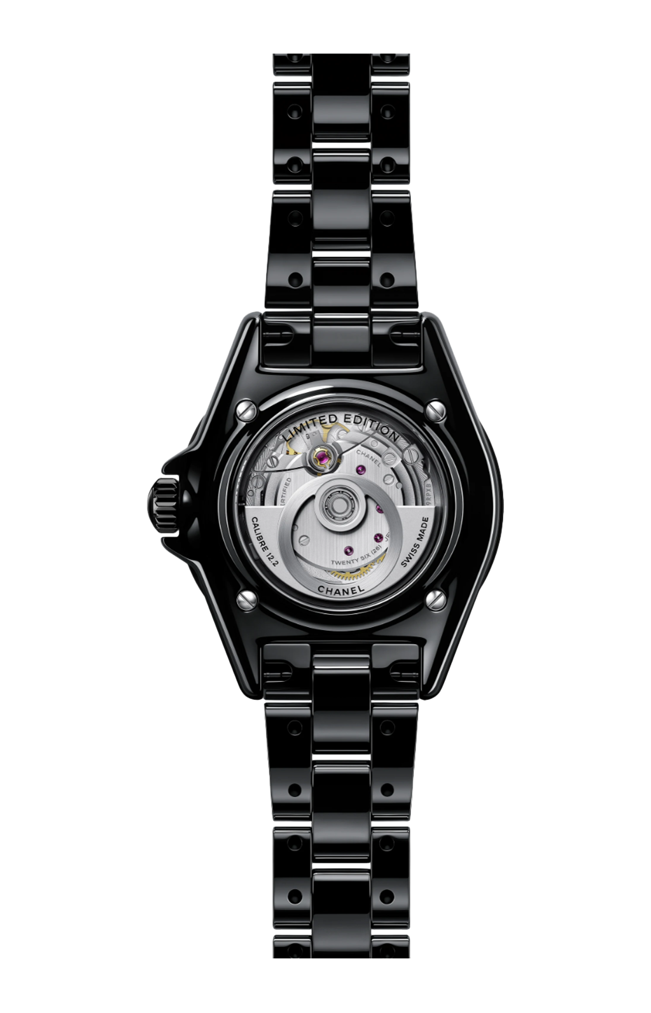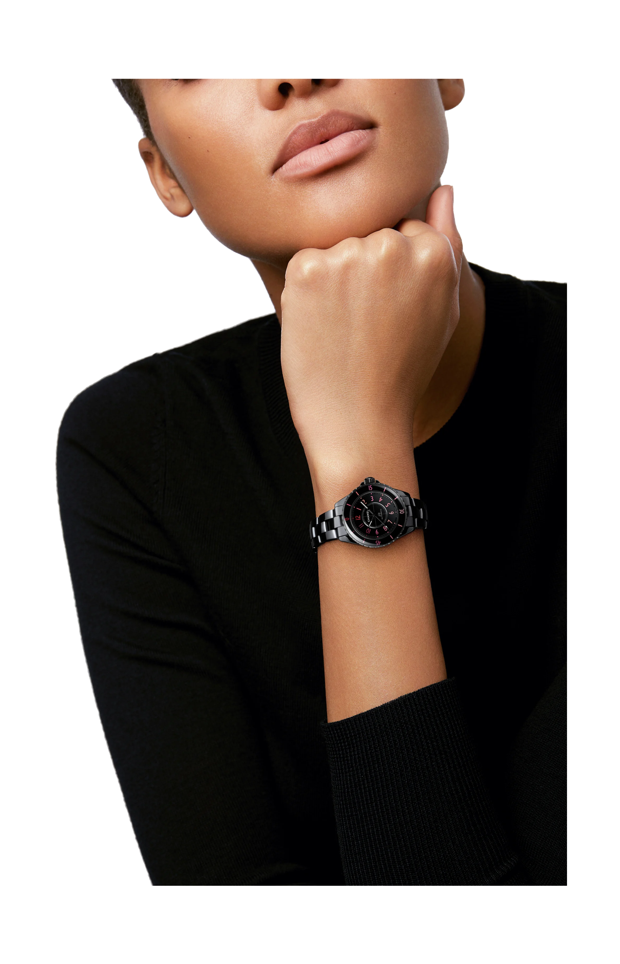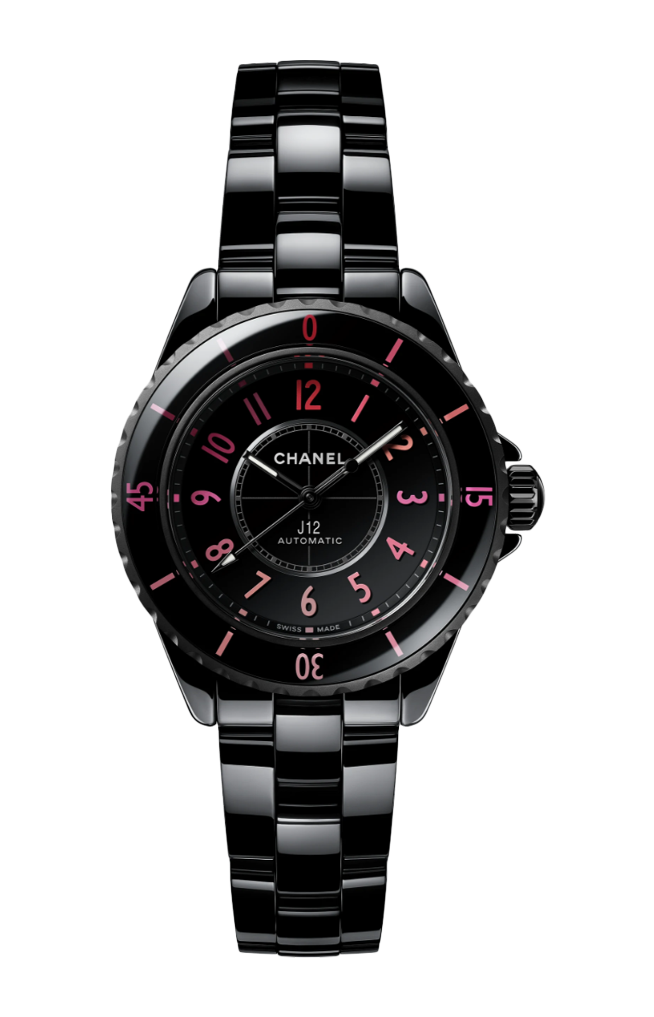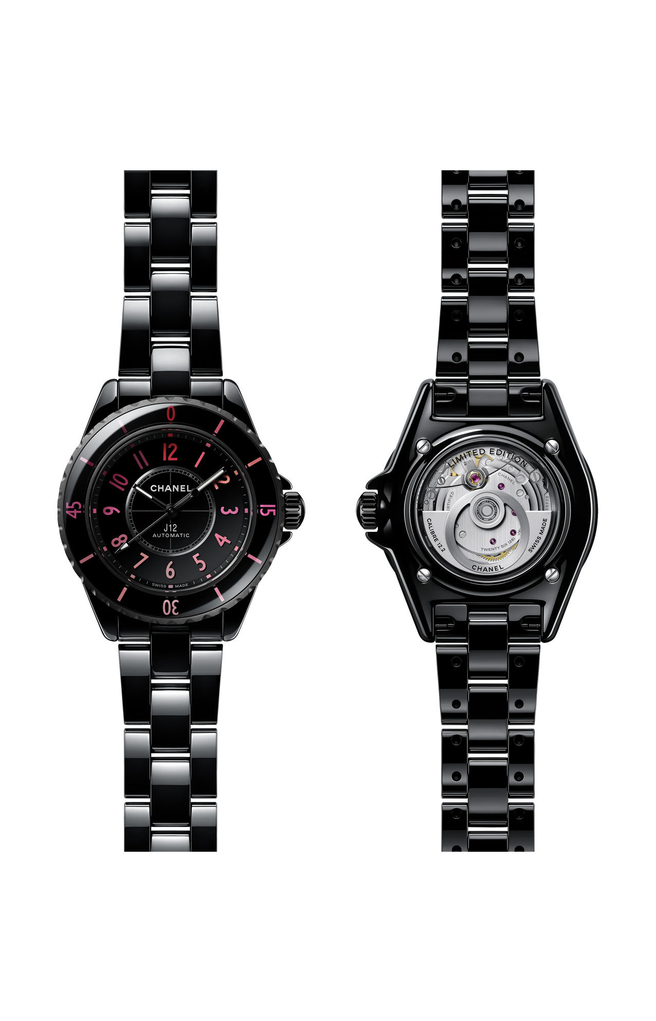 L’orologio J12 Blush Calibre 12.2, 33 mm Ref. H10311 di Chanel è un’edizione limitata che unisce tecnologia di eccellenza, materiali ricercati e un’estetica carica di contrasti. Presenta una cassa da 33 × 12,94 mm realizzata in ceramica nera ad alta resistenza e acciaio con rivestimento nero opaco. La lunetta, girevole unidirezionale, è in acciaio nero opaco ed è impreziosita da un anello in cristallo di zaffiro verniciato nero con indicatori sfumati nei toni del rosa e del rosso, che dialogano con gli indici sul quadrante laccato nero, conferendo profondità e carattere. Il movimento è il Calibre 12.2, meccanico a carica automatica, prodotto in Svizzera, dotato di certificazione cronometro COSC e garantito da una riserva di carica di circa 50 ore. È completo di bracciale in ceramica nera ad alta resistenza con chiusura deployante tripla in acciaio e corona serrata con cabochon in ceramica, per un comfort di utilizzo che non sacrifica lo stile. L’impermeabilità arriva a 200 metri, rendendolo non solo un oggetto di lusso da esibire, ma anche un orologio pratico per la vita quotidiana. Un segnatempo che fonde il rigore del nero, la leggerezza della ceramica e la delicatezza dei toni blush in un mix di forza e raffinatezza.