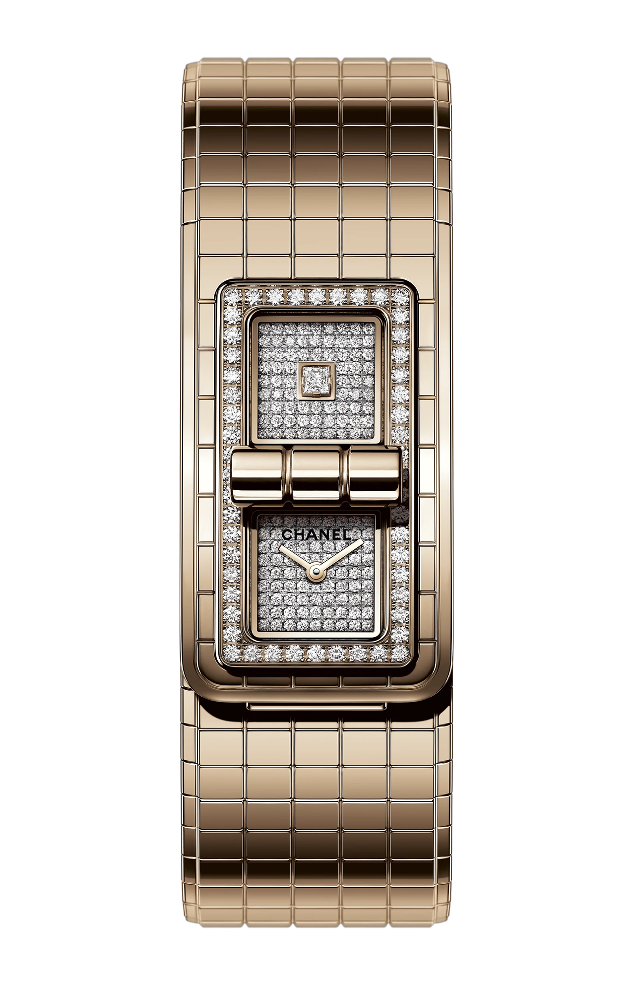38,1 x 21,5 x 7,8 mm. Cassa in ORO BEIGE 18 carati. Lunetta in ORO BEIGE 18 carati con 52 diamanti taglio brillante (~0,58 carati). Quadranti con 152 diamanti taglio brillante (~0,51 carati) e un diamante taglio princess (~0,05 carati). Bracciale in ORO BEIGE 18 carati. Movimento al quarzo ad alta precisione. Funzioni ore, minuti. Impermeabilità 30 m.