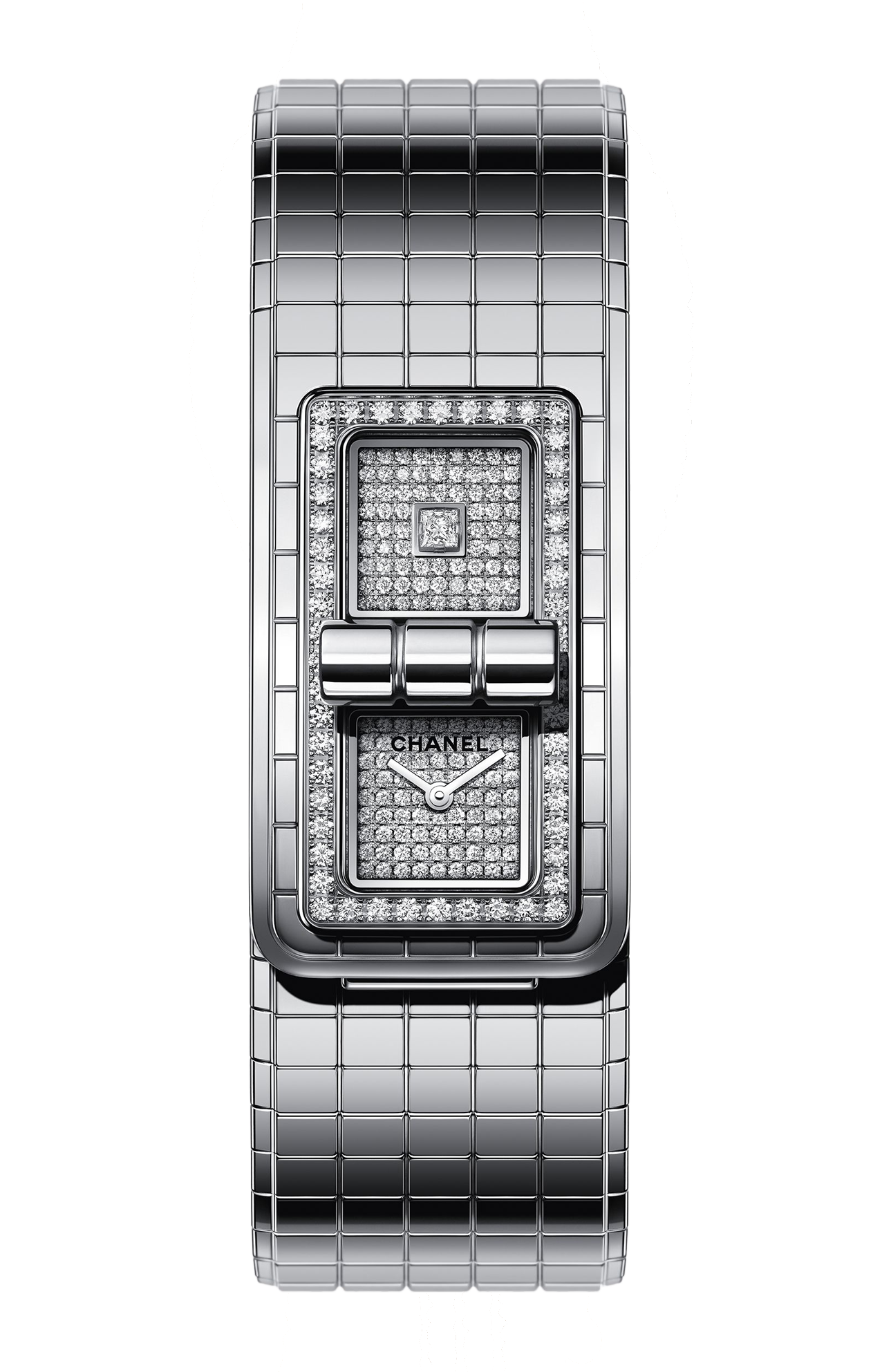 Cassa, lunetta e bracciale in acciaio. Lunetta con 52 diamanti taglio brillante. Due quadranti con 152 diamanti taglio brillante e 1 diamante taglio princess. Movimento al quarzo ad alta precisione. Impermeabilità: 30 metri. Dimensioni: 38.1 x 21.5 x 7.8 mm. Diamanti: ~1.14 carati.