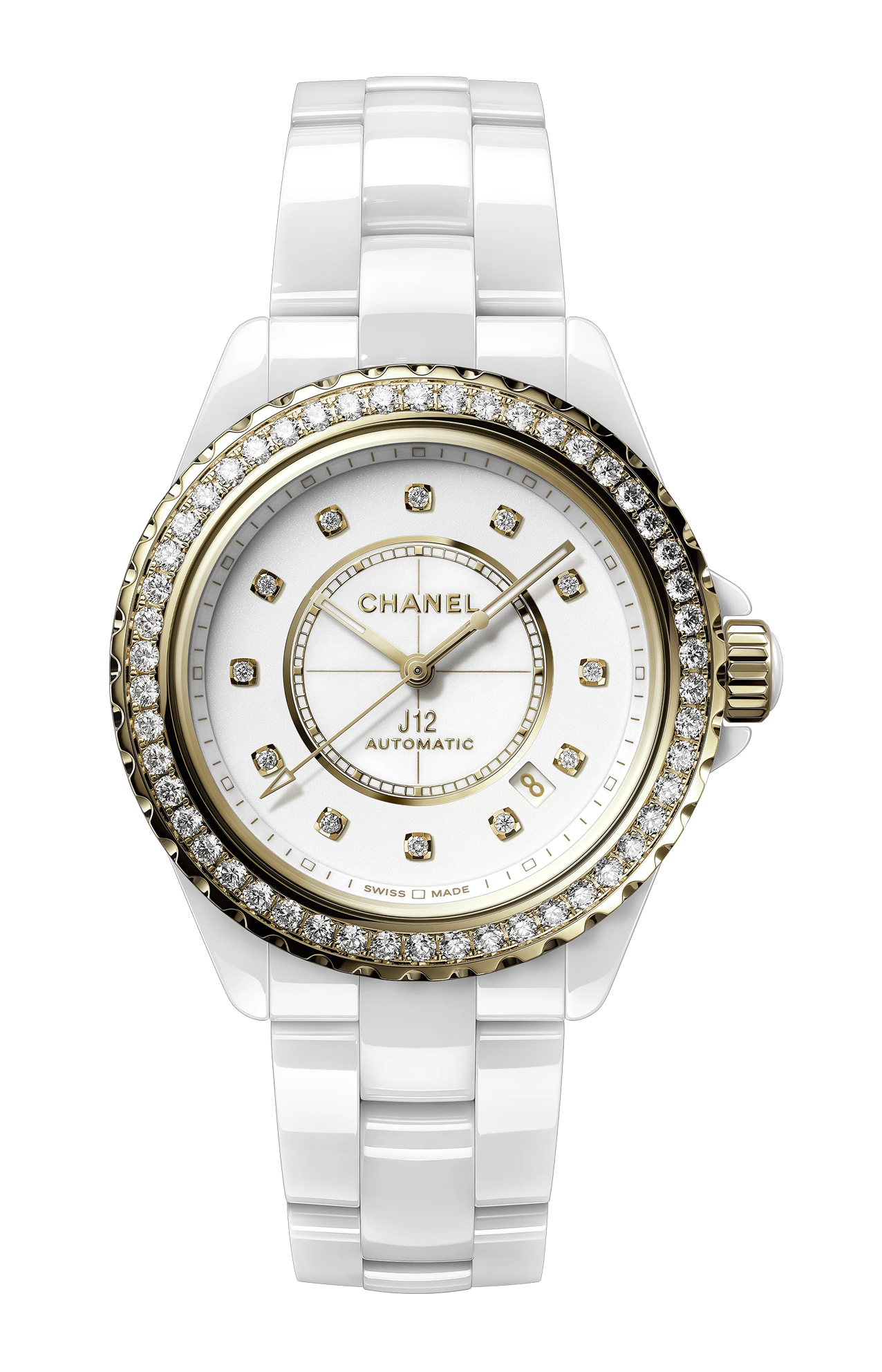Ceramica bianca ad alta resistenza e oro giallo 18 carati, lunetta e indici di diamanti.