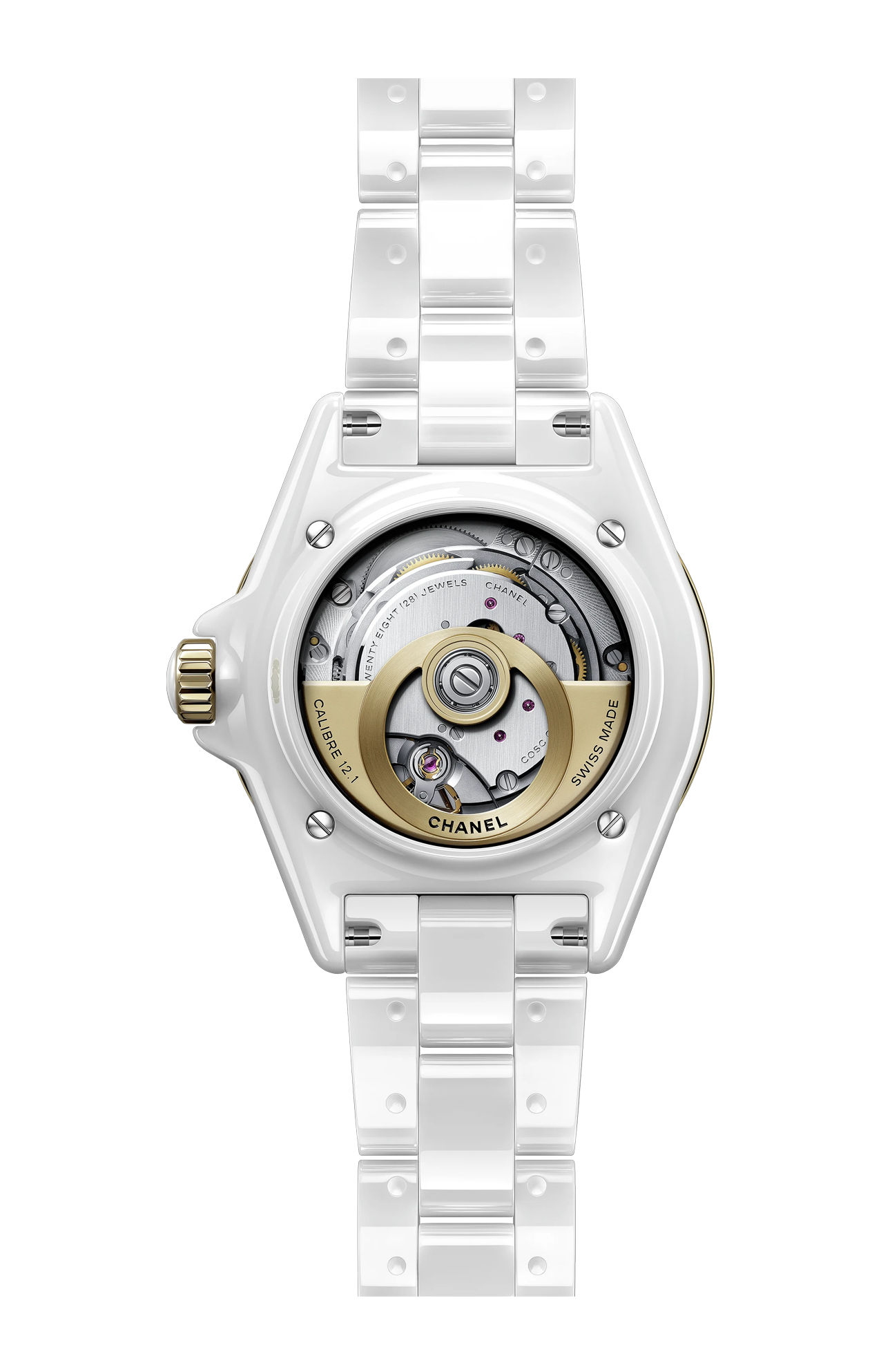 Rendere visibile l’invisibile. È a partire da questa visione che, nel 2019, è stato progettato il movimento automatico di Manifattura Calibro 12.1. Curato nei minimi dettagli, presenta bordi lucidati a diamante e una massa oscillante traforata in tungsteno – un materiale denso e pesante, proprietà che lo rendono particolarmente adatto ad armare la molla del bariletto e garantire una riserva di carica di 70 ore, molto al di sopra degli standard tradizionali. Una potenza erogata con estrema delicatezza, per garantire prestazioni e precisione. Visibile attraverso un vetro zaffiro sul fondello del J12, forma un cerchio perfetto: la firma orologiera della Maison.