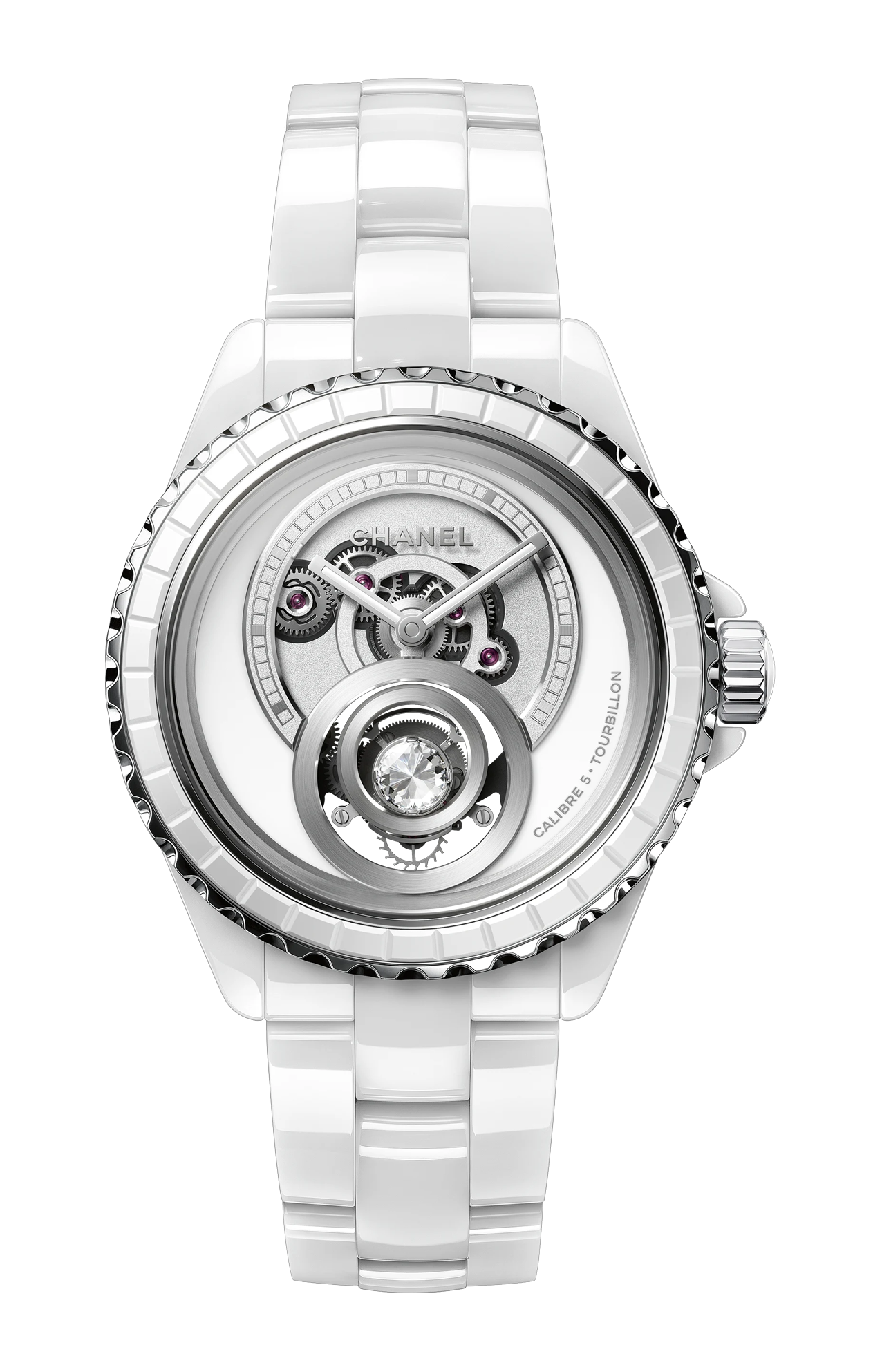 L’orologio CHANEL J12 Diamond Tourbillon Calibro 5 38 mm Ref. H9960 è un segnatempo di altissimo livello che fonde l’estetica iconica della collezione J12 con l’eccellenza tecnica di una complicazione prestigiosa come il tourbillon, pensato per chi desidera lusso, performance e design all’avanguardia. La cassa da 38 mm è realizzata in acciaio e ceramica bianca ad alta resistenza, materiali che garantiscono brillantezza, durabilità e resistenza ai graffi, mentre la lunetta fissa in acciaio con anello in ceramica bianca motivo baguette aggiunge un tocco di luminosità e raffinata preziosità. Il cuore dell’orologio è il movimento manuale Swiss made Calibro 5 con tourbillon, visibile attraverso l’apertura del quadrante e progettato per migliorare la precisione cronometrica compensando gli effetti della gravità, un elemento riconosciuto come simbolo di alta orologeria. Il quadrante bianco scheletrato è studiato per creare un contrasto elegante con i dettagli metallici e la struttura del tourbillon, valorizzando allo stesso tempo indici e lancette rodiati per una lettura chiara e armoniosa delle ore e dei minuti. Il bracciale in ceramica bianca con chiusura deployante in acciaio garantisce comfort, stile e continuità estetica con la cassa, rendendo l’orologio perfetto per chi cerca un segnatempo che unisca performance tecniche, lusso e versatilità. Con impermeabilità fino a 200 metri, il J12 Diamond Tourbillon 38 mm è progettato per accompagnarti con eleganza in ogni momento della giornata, incarnando l’essenza dell’innovazione tecnica e dell’estetica senza tempo firmata CHANEL.
