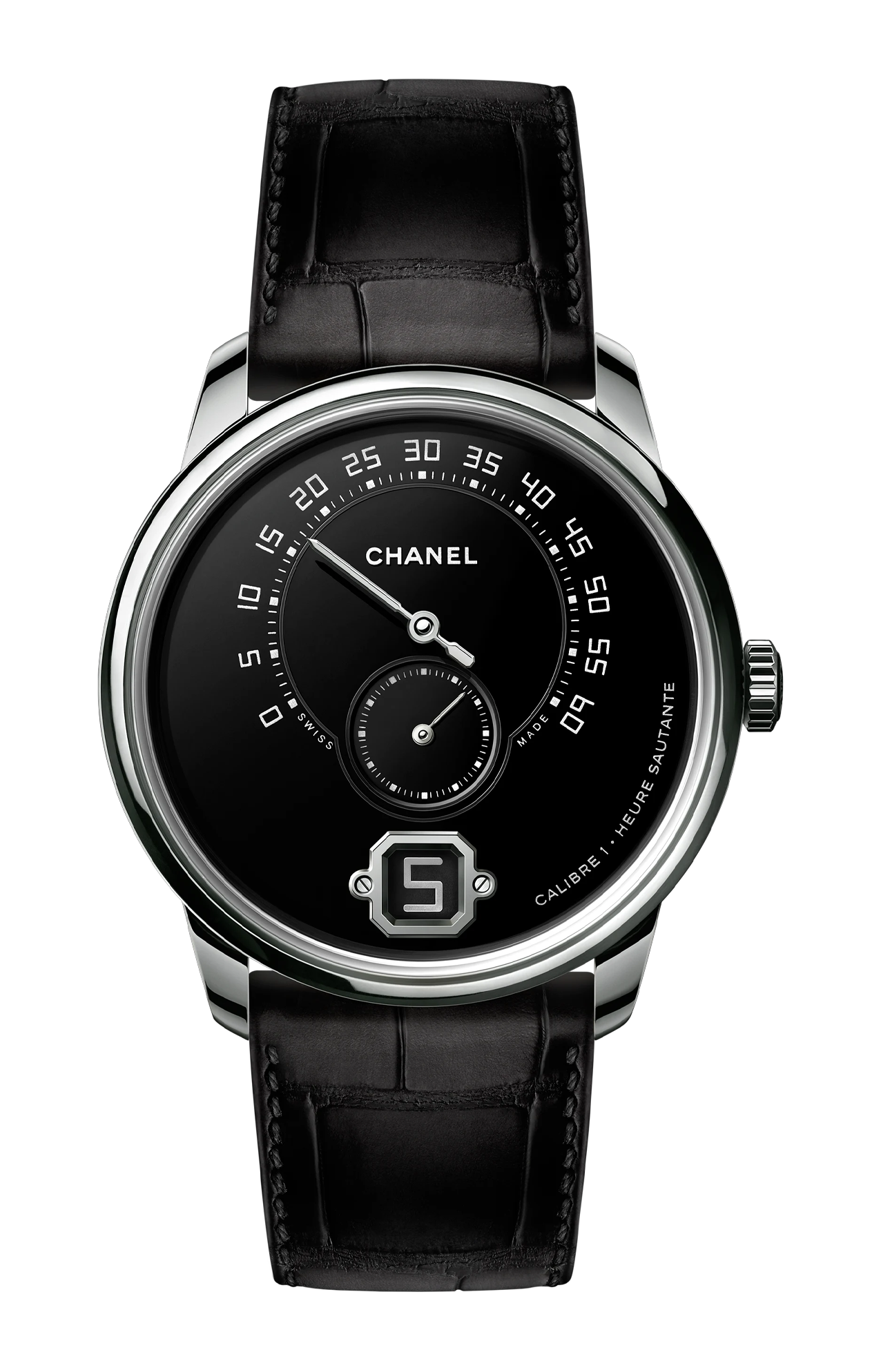 40 mm. Cassa in platino. Corona in platino. Quadrante in smalto Grand Feu nero con indicatore dei minuti retrogradi, finestrella delle ore saltanti e contatore dei piccoli secondi. Cinturino in pelle nera motivo alligatore, chiusura ad ardiglione in platino e tripla chiusura pieghevole in oro bianco 18 carati. Movimento meccanico a carica manuale ≈ 70 ore. Funzioni piccoli secondi, ore, minuti, secondi.