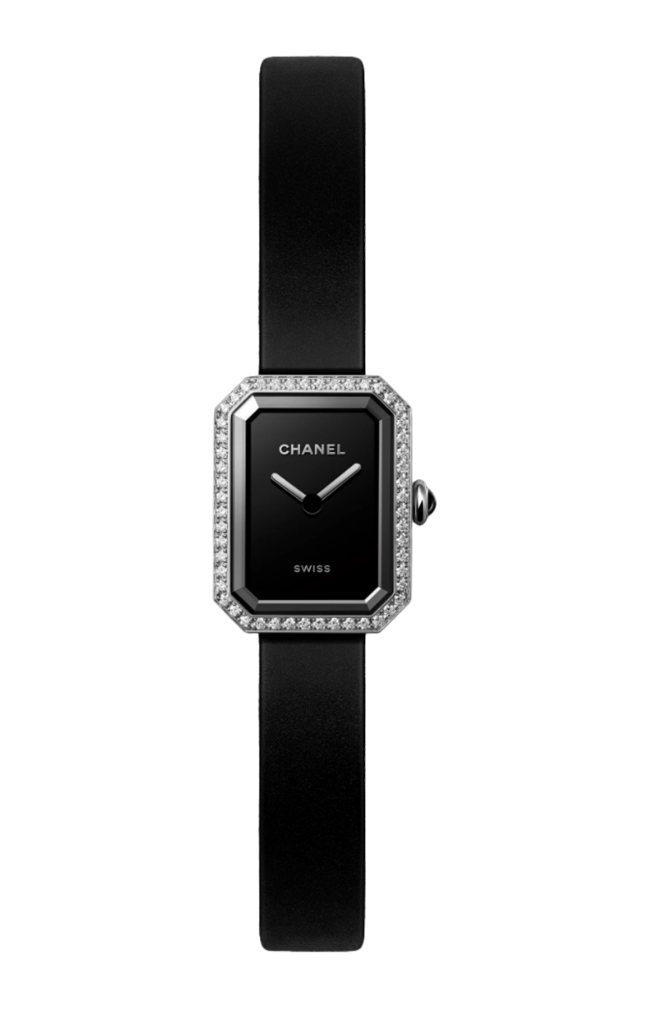 Acciaio e diamanti, cinturino in caucciù nero effetto velluto, quadrante laccato nero