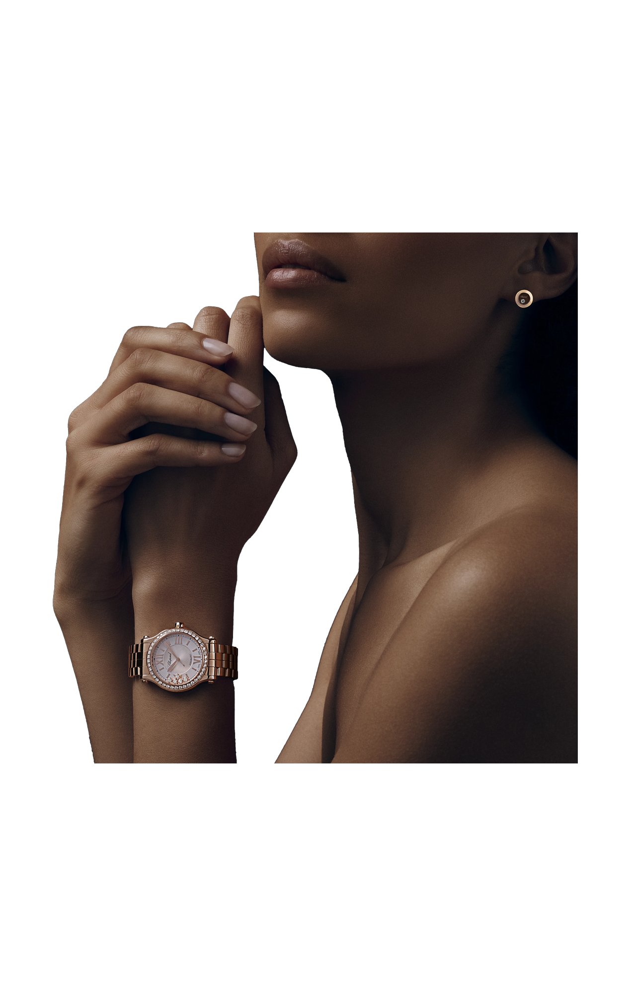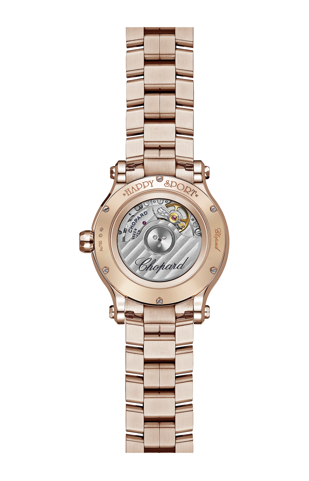 La collezione Happy Sport è l'emblema della creatività e dell'audacia di Chopard. Le sue gioiose pietre preziose, che danzano liberamente tra due vetri zaffiro, fanno sognare sin dal 1993, quando Chopard è diventata la prima maison a coniugare acciaio e diamanti. La grande competenza orologiera ha consentito a Chopard di dotare il modello Happy Sport da 33 mm di un movimento meccanico a carica automatica appositamente sviluppato per le casse dei modelli femminili. Little Diamonds Do Great Things.