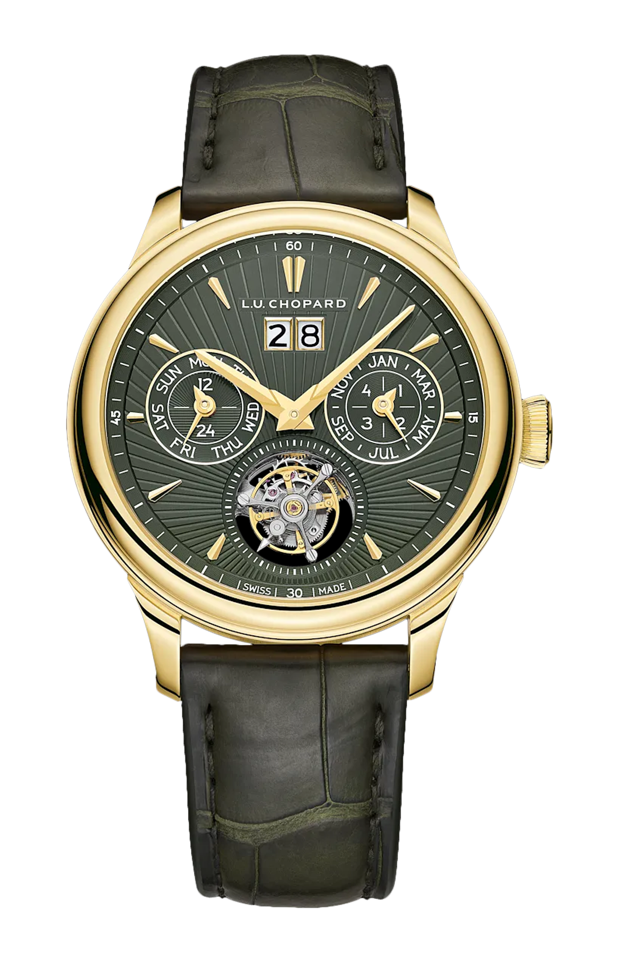 La manifattura Chopard raggiunge un nuovo importante traguardo nella sua storia grazie al L.U.C Calibre 96.36-L, un originale movimento con grandi complicazioni che abbina un tourbillon volante e un calendario perpetuo a una grande data. Il segnatempo L.U.C Flying T Twin Perpetual rispecchia il massimo savoir-faire e l’innovazione perpetuati nei laboratori di orologeria della maison. Presenta una cassa in oro giallo 18 carati da approvvigionamento responsabile del diametro di 40,5 millimetri, con un profilo elegante e bassiné. Questa raffinatezza estetica si estende al quadrante verde scuro in oro con lavorazione guilloché eseguita a mano, altamente leggibile, mentre un ingegnoso sistema di cinturini intercambiabili offre all’orologio una varietà di stili. Il movimento ha una precisione certificata come cronometro e le finiture di alta qualità di questo modello eccezionale hanno permesso al segnatempo di ottenere il marchio di qualità del punzone di Ginevra.