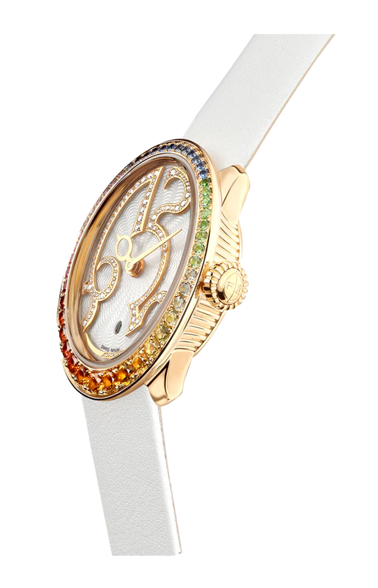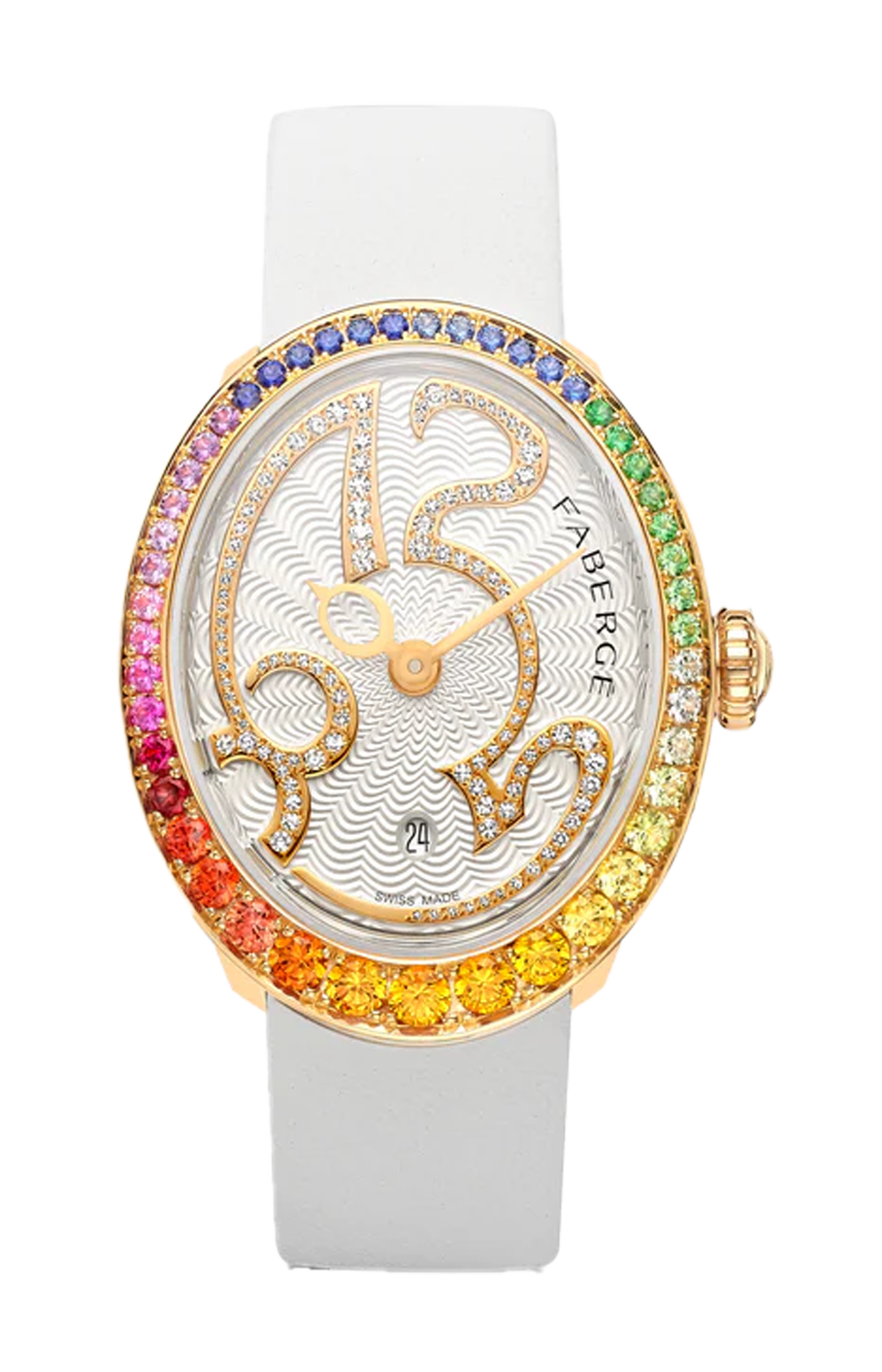 Ispirata al simbolo più rappresentativo della maison, l'uovo, questa nuova e giocosa collezione di orologi a carica automatica racchiude 180 anni di storia in un design contemporaneo, incarnando il fascino senza tempo di Fabergé. Questa edizione è stata nominata per i GPHG Awards 2024 nella categoria Ladies' ed è il pezzo di punta della collezione, caratterizzato da un'elegante cassa in oro rosa 18K incastonata con un caleidoscopio di pietre preziose color arcobaleno sulla lunetta. La cassa presenta delicate scanalature sui lati, una firma della nostra collezione Colours of Love, e numeri incastonati di diamanti, che consentono ai numeri di brillare e catturare la luce attraverso le diverse sfaccettature delle pietre preziose.
