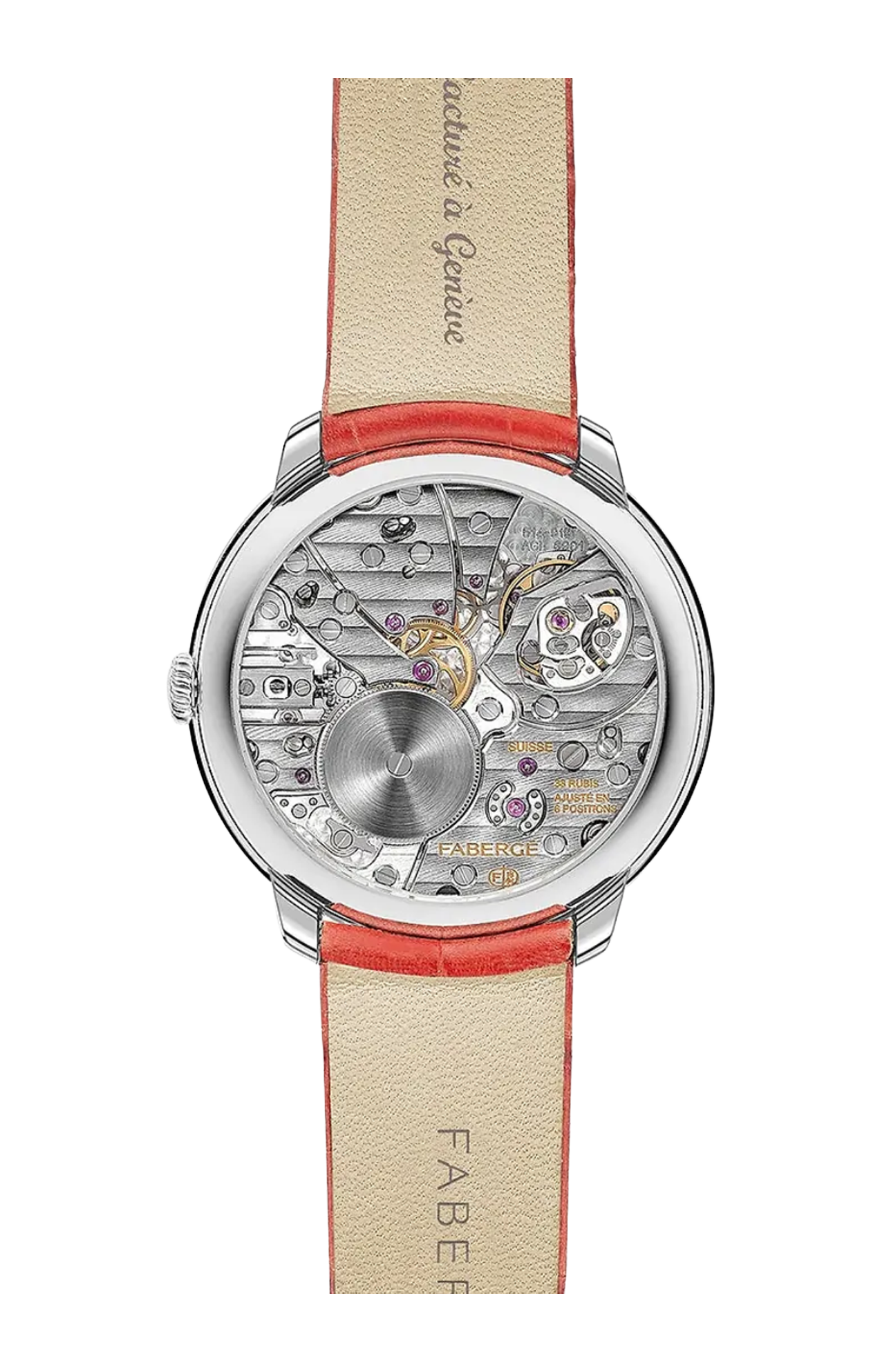 L'orologio Compliquée Peacock Ruby presenta un quadrante incastonato di diamanti e rubini, un pavone inciso a mano in oro bianco 18 carati, una lunetta incastonata di diamanti, indicatori dei minuti e delle ore in madreperla e un movimento retrogrado a carica manuale, racchiuso in una cassa in platino da 38 mm, con cinturino in alligatore.
