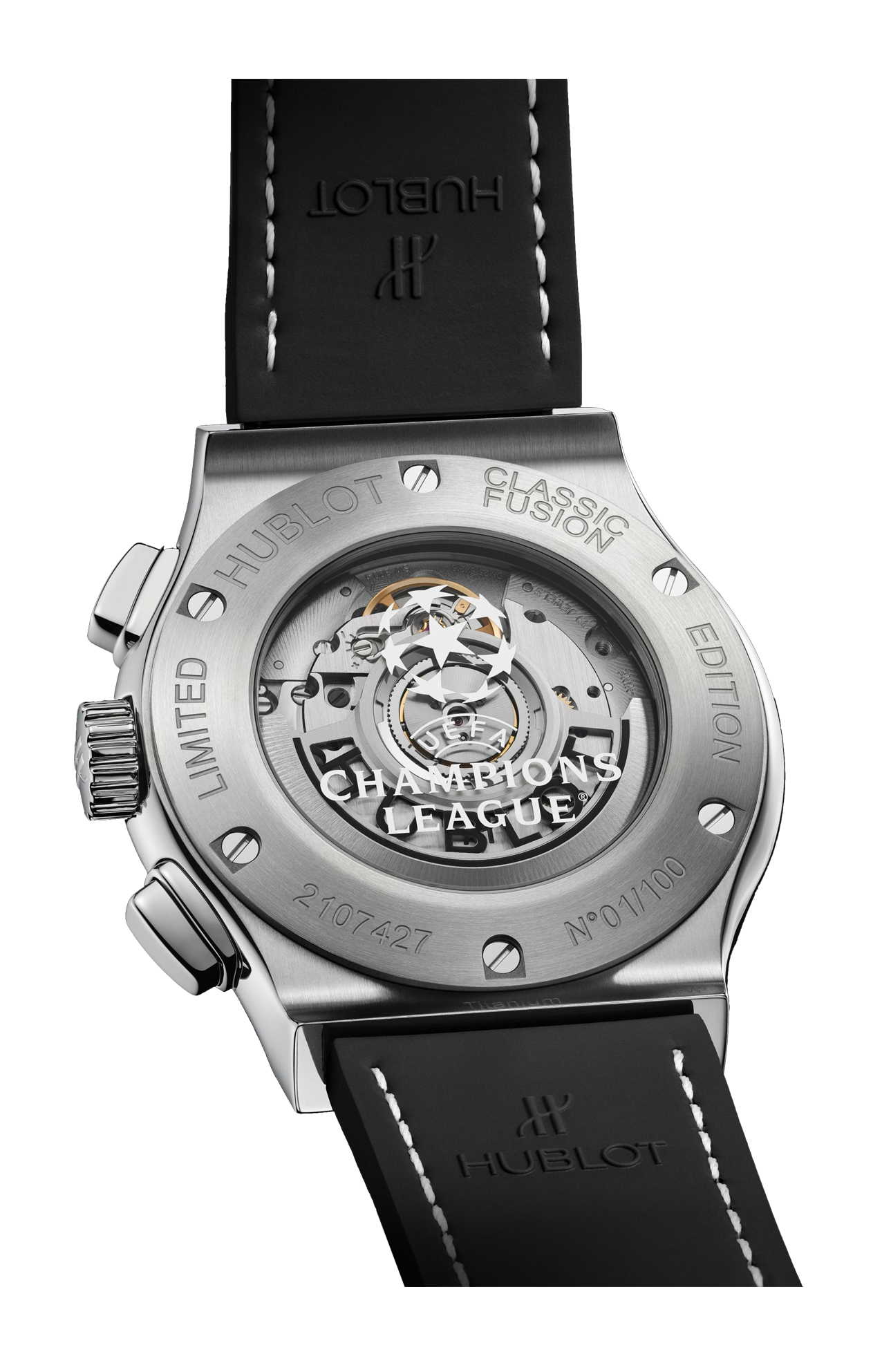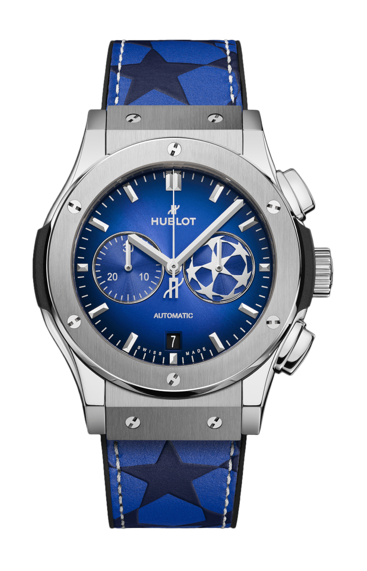 Il Classic Fusion Chronograph UEFA Champions League Titanium è un oggetto da collezione per i veri appassionati di calcio. Questa edizione limitata a 100 esemplari presenta una cassa da 42 mm in titanio satinato e lucido, un quadrante blu sfumato e il logo della UEFA Champions League applicato sul contatore a ore 3. Il cinturino fonde caucciù nero e pelle di vitello blu, sfoggiando con orgoglio l'iconico emblema della UEFA Champions League, il pallone a stella. Poiché le leggende meritano più di una scatola, ogni orologio è presentato in una custodia in legno personalizzata, completa di una replica ufficiale in miniatura del trofeo della UEFA Champions League: l'unico che non devi vincere per sollevare, ma che ti fa sentire un vincitore ogni volta che indossi l'orologio. Il titanio è ampiamente utilizzato da Hublot, in particolare per la sua leggerezza. Presenta il miglior rapporto tra resistenza e peso di qualsiasi altro materiale, il che lo rende un materiale estremamente popolare soprattutto in ambito aeronautico. Si distingue anche per la sua resistenza alla corrosione e la sua inerzia a contatto con la pelle. Hublot utilizza solo titanio di alta qualità, grado 5, il più resistente in assoluto. Una volta lucidato, questo materiale conserva una lucentezza metallica leggermente bluastra. Il titanio è ampiamente utilizzato da Hublot, in particolare per la sua leggerezza. Presenta il miglior rapporto tra resistenza e peso di qualsiasi altro materiale, il che lo rende un materiale estremamente popolare soprattutto in ambito aeronautico. Si distingue anche per la sua resistenza alla corrosione e la sua inerzia a contatto con la pelle. Hublot utilizza esclusivamente titanio di alta qualità, grado 5, il più resistente in assoluto. Una volta lucidato, questo materiale mantiene una leggera lucentezza metallica bluastra. L'arte della fusione si esprime fino al cuore del movimento. Orologi semplici con concetti orologieri innovativi: Hublot ha creato una gamma di movimenti "in-house" unici. Un design unico per il cronografo automatico unico. Una riserva di carica senza pari per i calibri Meca-10, Tourbillon e MP-11. Un motore rivoluzionario con 11 bariletti MP-05 e una riserva di carica di 50 giorni. Nella sua "arte della fusione", Hublot realizza una perfetta simbiosi tra funzionalità, architettura e design.
