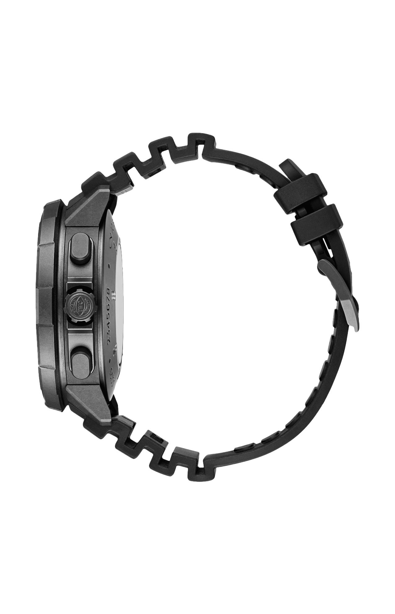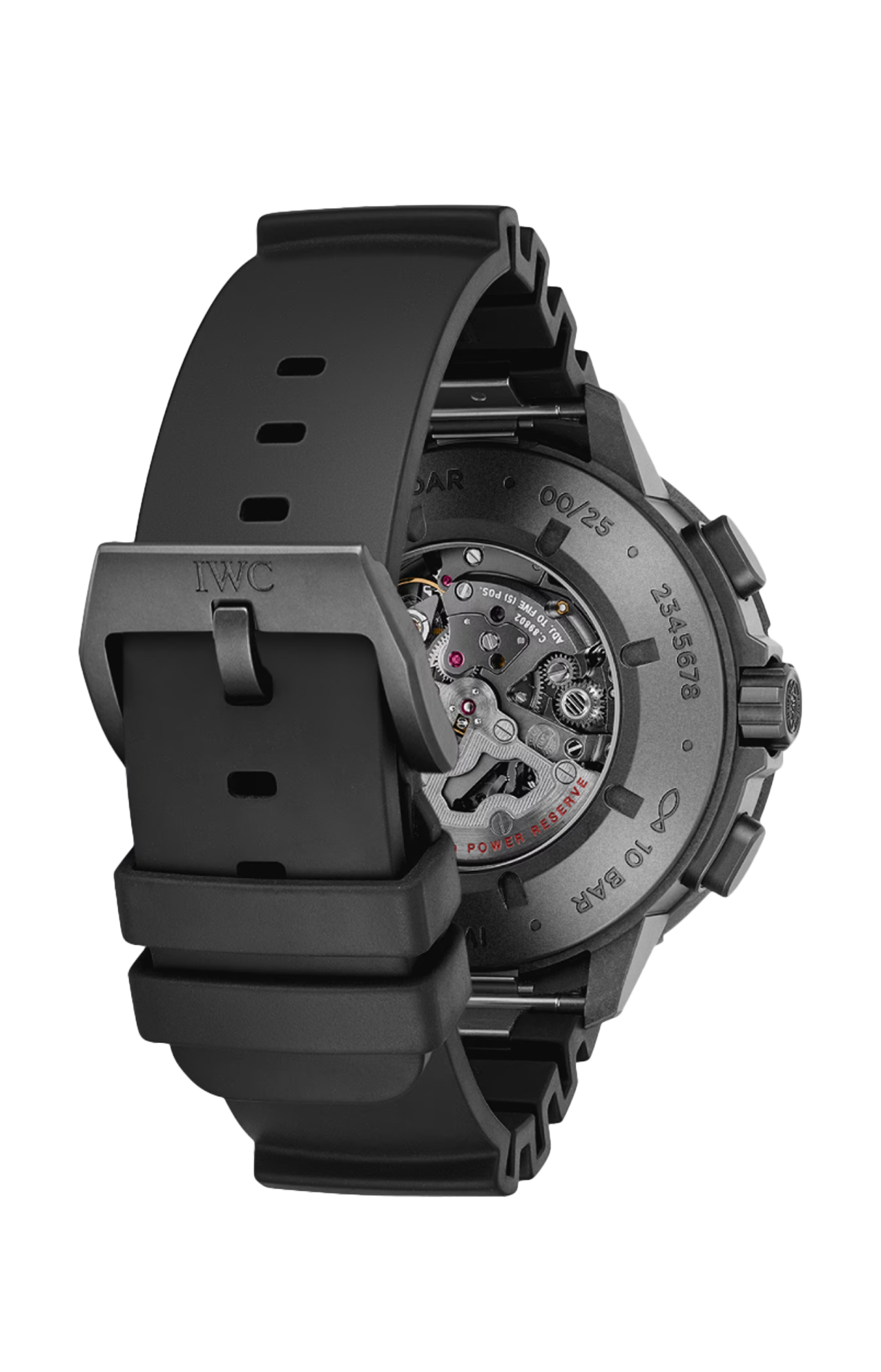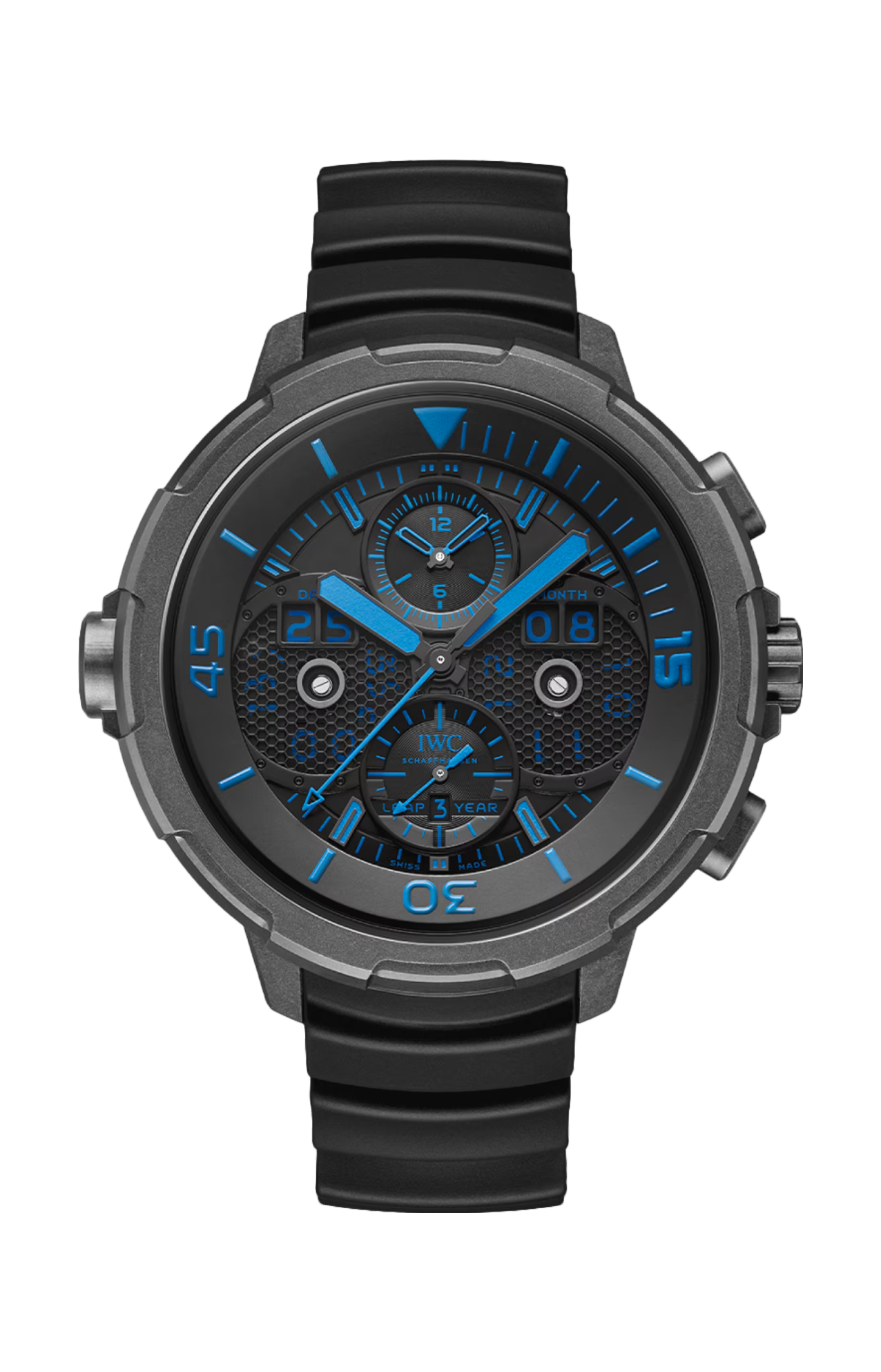 L'Aquatimer Perpetual Calendar Digital Date-Month si ispira a un orologio di scena che IWC Schaffhausen ha fornito ai personaggi del film hollywoodiano "Aquaman e il regno perduto". La cassa da 49 millimetri, il fondello, la corona e i pulsanti sono realizzati in Ceratanium® sviluppato da IWC. Questo materiale performante combina la struttura del titanio con una durezza e una resistenza ai graffi simili a quelle della ceramica. Questo orologio sportivo subacqueo ha un quadrante nero con dettagli blu in Super-Luminova®. Il materiale luminescente è applicato agli indici di ore e minuti, alle lancette e alla scala dei minuti sulla lunetta girevole interna. Il Super-Luminova® è un composto ceramico high-tech che agisce come una batteria per l'accumulo della luce. Assorbe la luce, fornisce energia agli elettroni e poi la rilascia sotto forma di luce visibile, illuminandosi al buio o sott'acqua. Una caratteristica funzionale eccezionale di questo orologio è il calendario perpetuo con indicazione digitale della data e del mese. Il programma meccanico del calendario riconosce automaticamente le diverse durate dei mesi e gli anni bisestili. Di conseguenza, la combinazione "29" e "02" apparirà solo una volta ogni quattro anni sul quadrante. L'Aquatimer Perpetual Calendar Digital Date-Month è animato dal calibro 89802 di manifattura IWC, che è dotato anche della funzione cronografo. Le ore e i minuti cronografici sono visualizzati insieme in un contatore a ore 12. Un sistema di carica a doppio cricchetto garantisce una riserva di carica di 68 ore nella molla motrice. È possibile ammirare il movimento attraverso il fondello in vetro zaffiro trasparente. Come tutti i modelli Aquatimer, questo orologio subacqueo impermeabile fino a 10 bar è dotato della lunetta girevole esterna/interna di IWC per la regolazione del tempo di immersione. Grazie al sistema IWC SafeDive, la lunetta girevole interna può essere regolata solo quando la lunetta esterna viene ruotata in senso antiorario. In questo modo, anche se il sub sposta accidentalmente la lunetta, non viene mai superato il tempo in cui può tornare in superficie in sicurezza, senza dover effettuare soste di decompressione. L'orologio è dotato di un cinturino in caucciù nero con una fibbia ad ardiglione in Ceratanium®. Grazie al sistema di sostituzione rapida del cinturino di IWC, il cinturino in caucciù nero può essere cambiato facilmente. L'Aquatimer Perpetual Calendar Digital Date-Month è prodotto in edizione limitata di 25 esemplari.