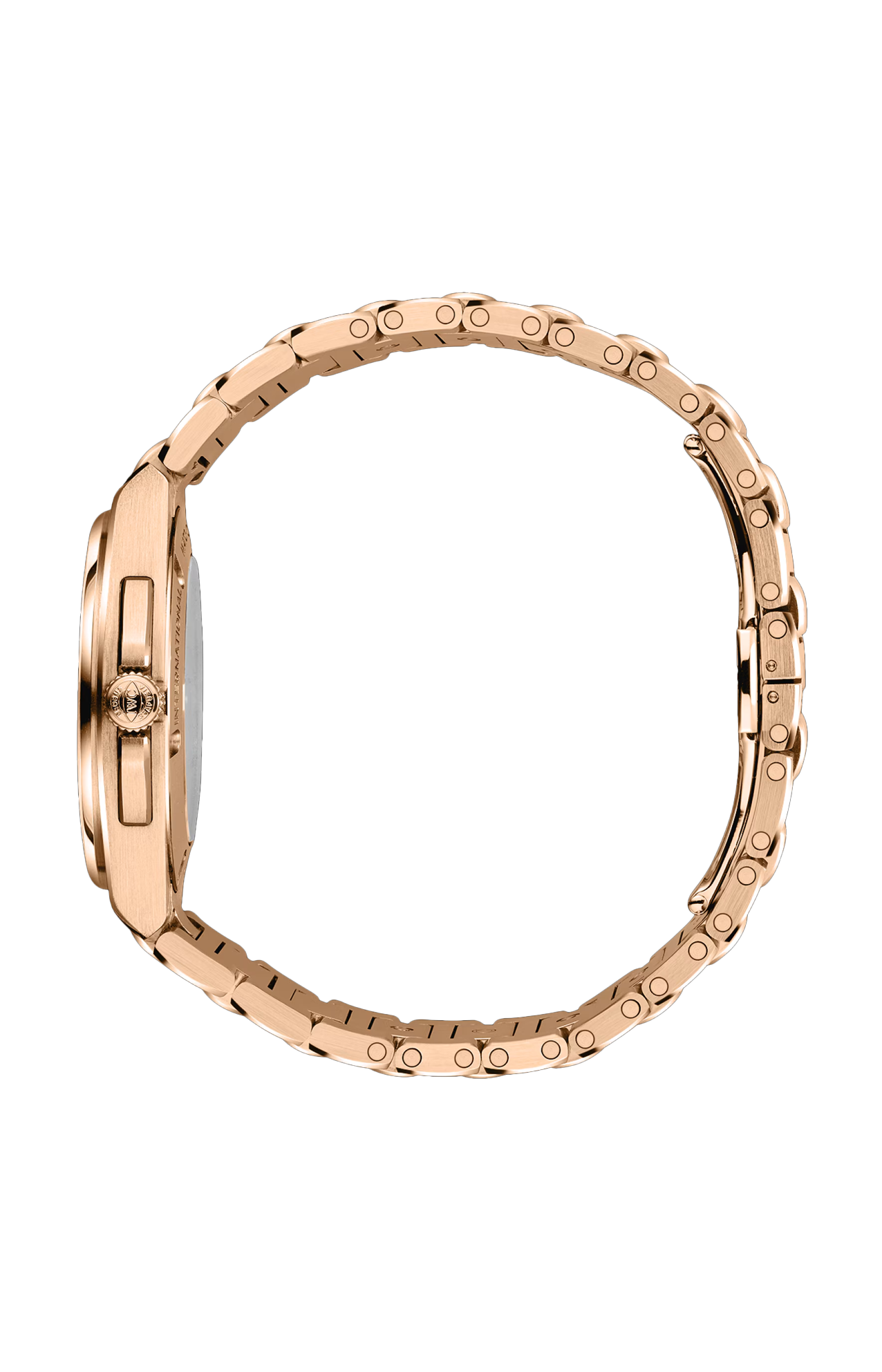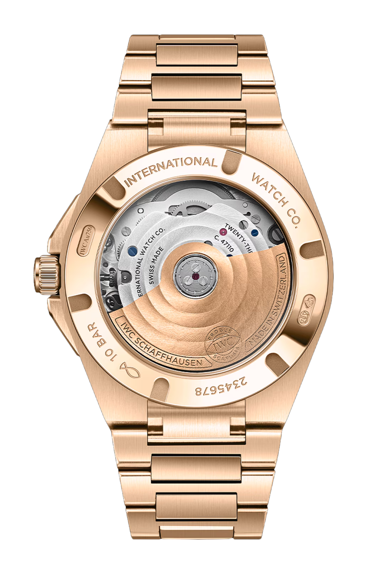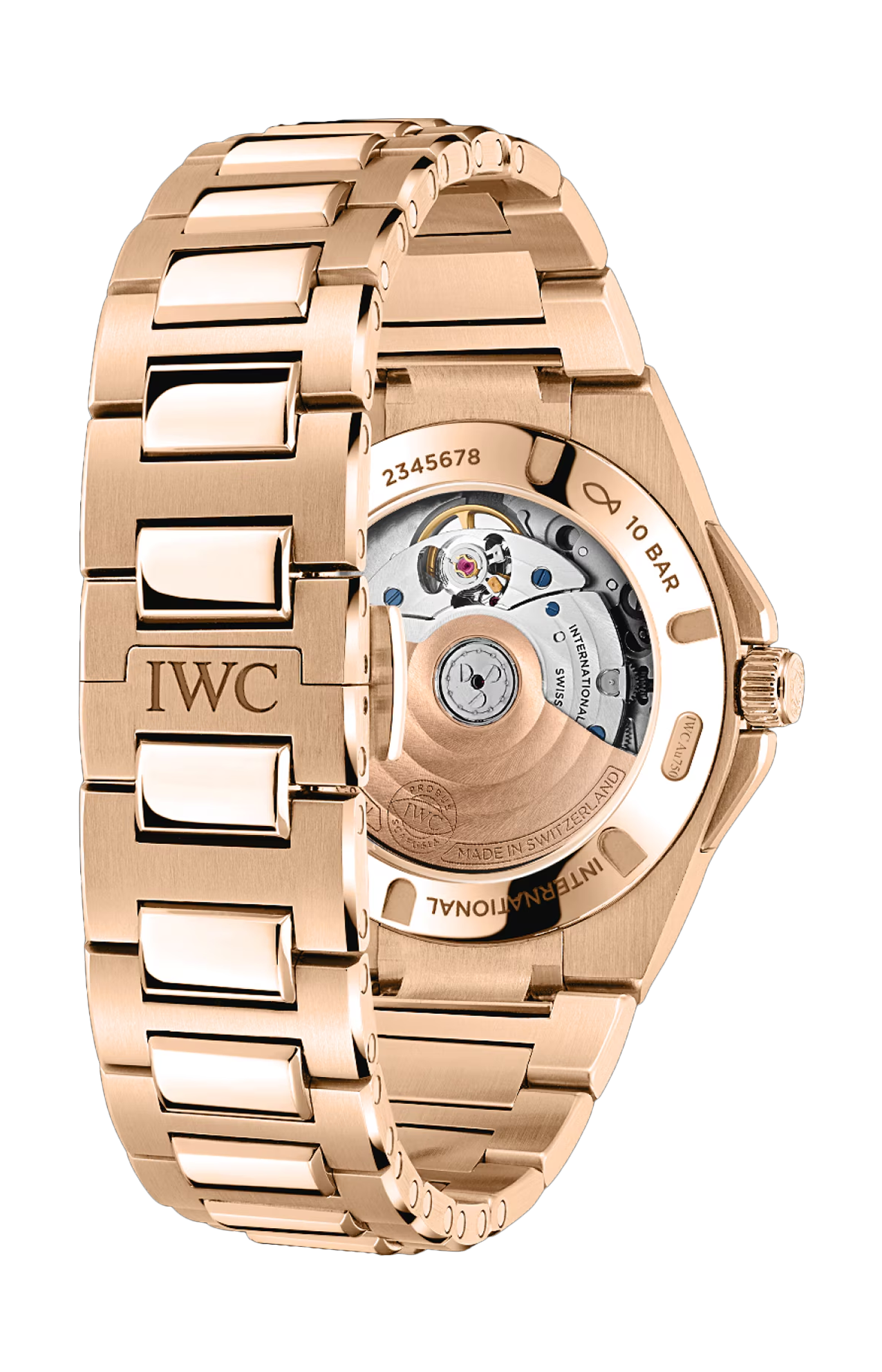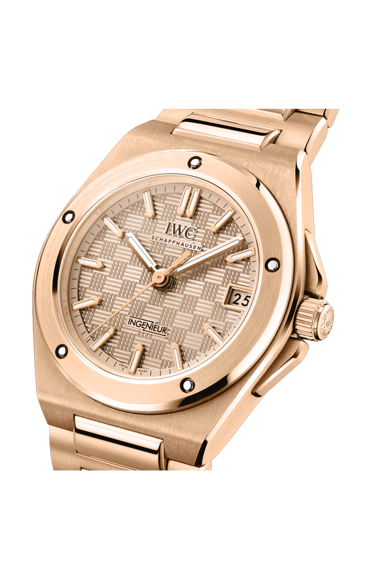 L’ingenieur automatic 35 completa la collezione ingenieur di IWC Schaffhausen con una versione con cassa da 35 millimetri. Il moderno ingenieur rivisita gli audaci codici estetici dell’ingenieur SL, referenza 1832, un orologio sportivo di lusso creato dal famoso designer di orologi ginevrino Gérald Genta negli anni ’70. Questo modello presenta una cassa e un bracciale integrato in oro rosso 18 carati e un quadrante color oro con lancette e indici applicati in oro. Designer e ingegneri hanno lavorato fianco a fianco per definire, proporzionare e rifinire ogni componente e caratteristica dell’ingenieur, rimanendo fedeli alle dimensioni della cassa di 35 millimetri. Per ottenere le proporzioni visive e l’ergonomia desiderata, ogni elemento ha dovuto essere rivisitato. Il risultato offre l’aspetto immediatamente riconoscibile dell’ingenieur in una versione più piccola e piatta, con ergonomia e comfort perfetti. Proprio come la versione da 40 millimetri, l’ingenieur automatic 35 colpisce per le sue finiture estremamente curate. L’orologio è rifinito con una combinazione di superfici satinate e lucide, che aggiungono texture e riflettono magnificamente la luce. Fissata alla ghiera con cinque viti funzionali, la lunetta è satinata con un bordo esterno lucido. Anche le maglie ad H del bracciale sono satinate con bordi lucidi, mentre le maglie centrali e il fondello sono completamente lucidi. Una particolarità distintiva dell’ingenieur automatic 35 è il quadrante finemente lavorato con il caratteristico motivo “a griglia”, costituito da piccole linee e quadrati. Gli indici applicati sono montati singolarmente a mano e riempiti con Super-Luminova®. Il fondello aperto mette in mostra il calibro 47110 con una riserva di carica di 42 ore. Il movimento è rifinito con perlage e Côtes de Genève e vanta una massa oscillante placcata oro.