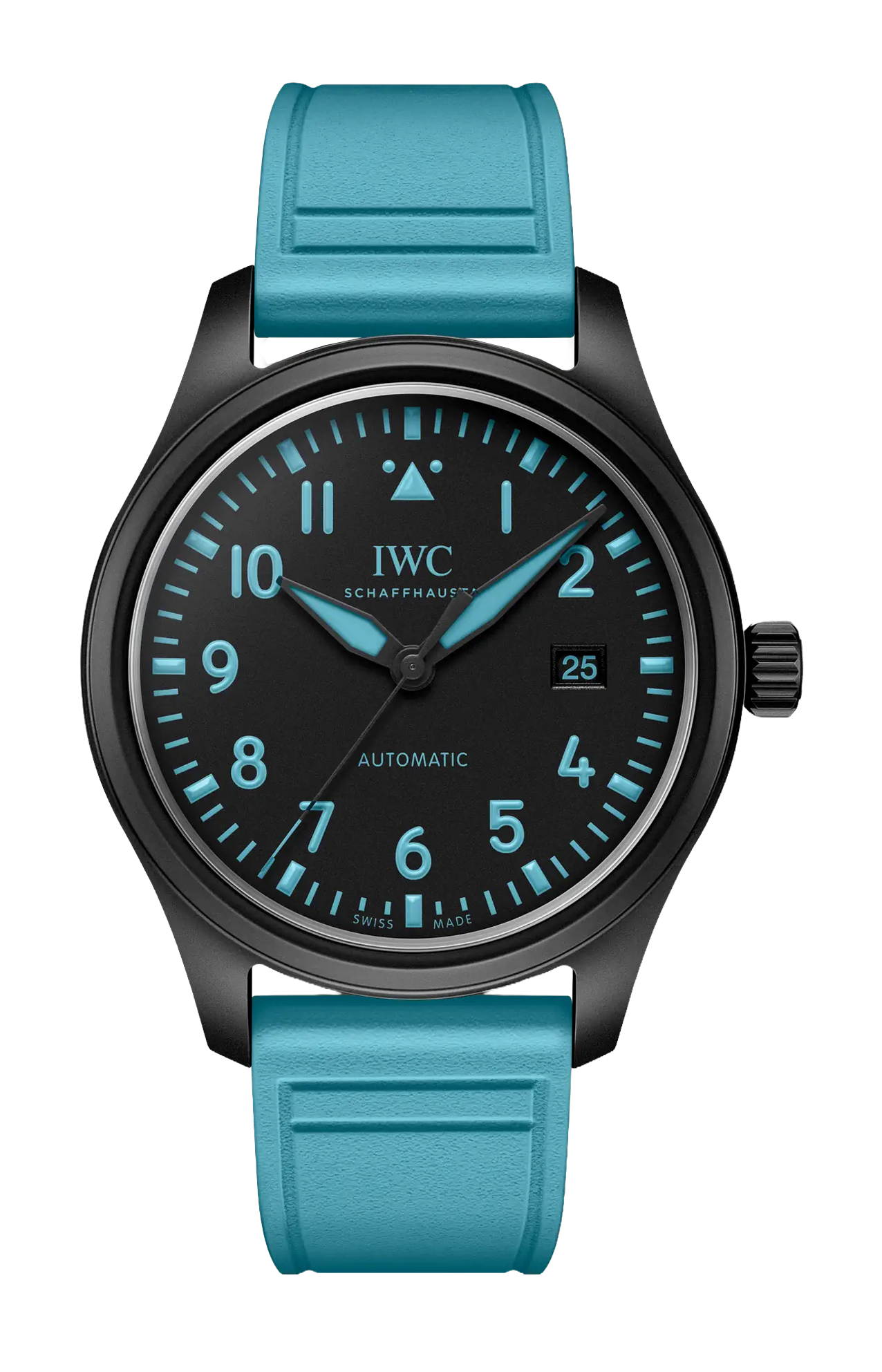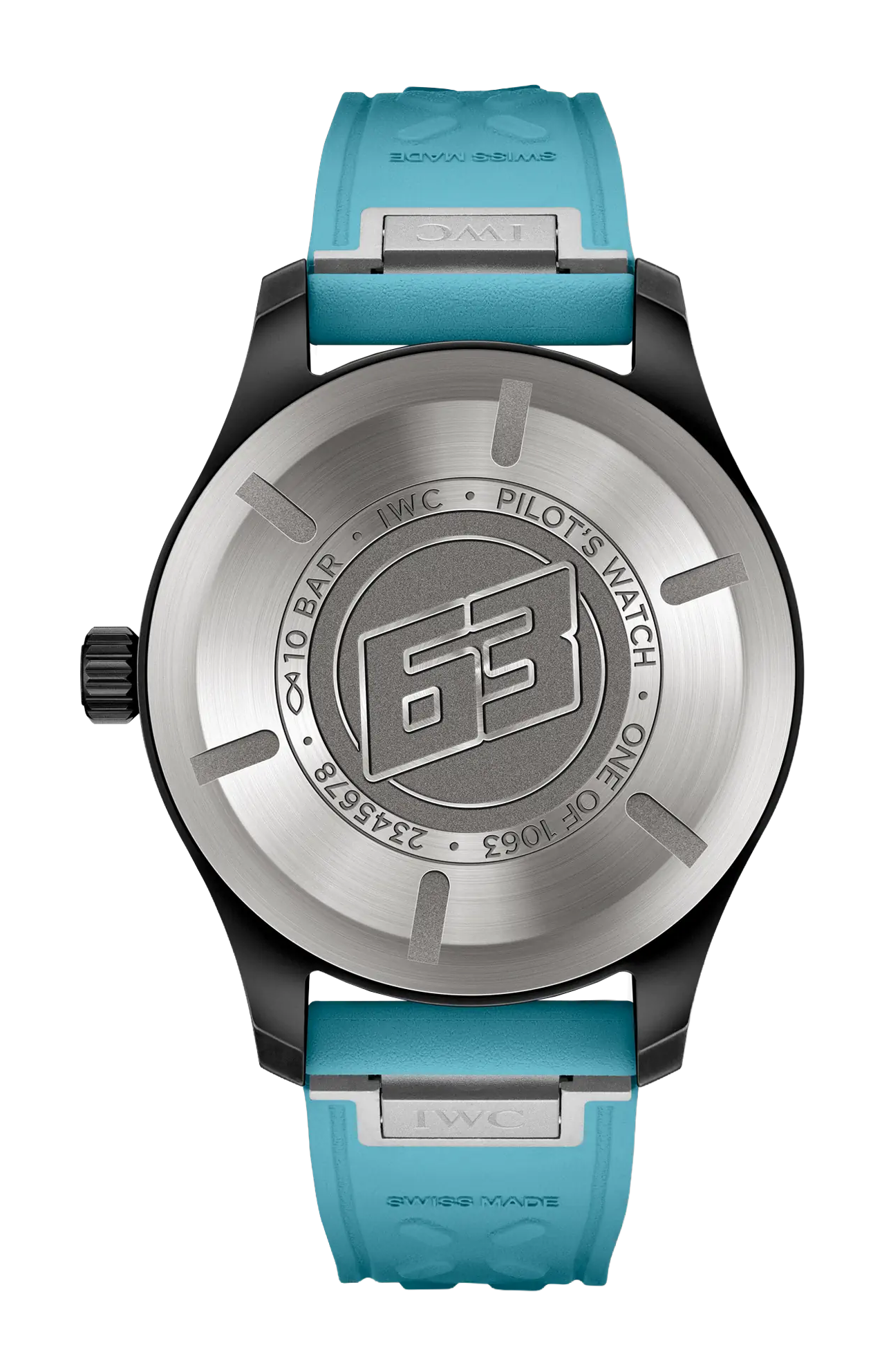 Limitato a 1063 esemplari, il Pilot’s Watch Automatic 41 George Russell in ceramica nera presenta un quadrante stampato e un cinturino in caucciù in un’esclusiva tonalità di blu, ispirata al casco da corsa del pilota.