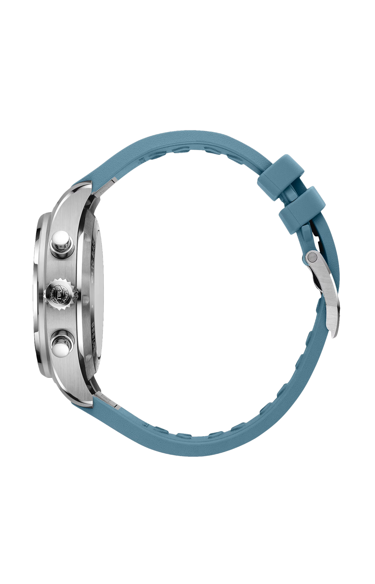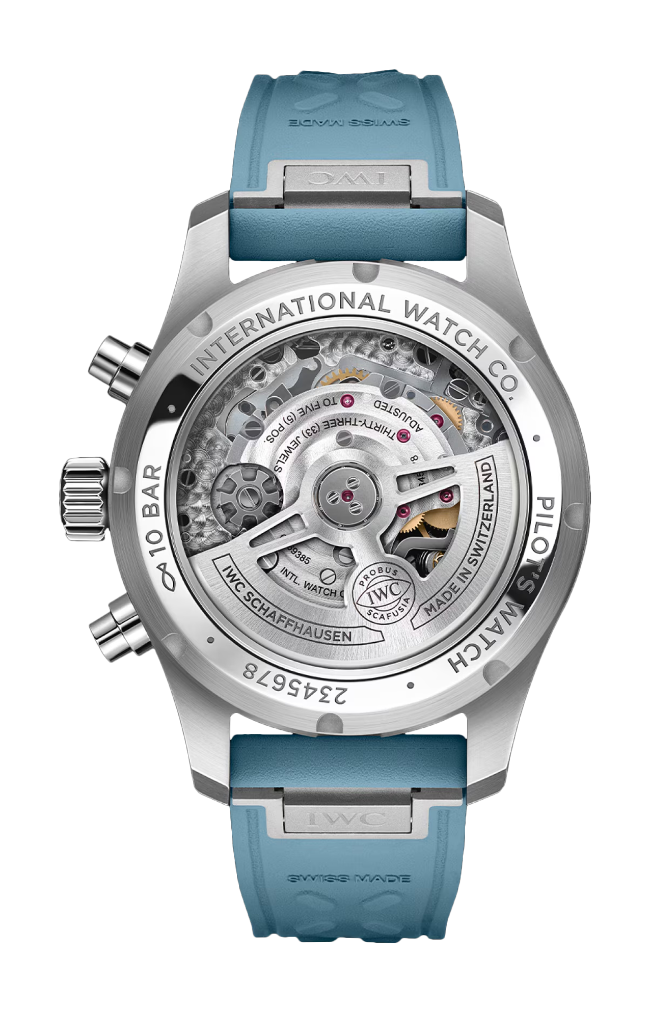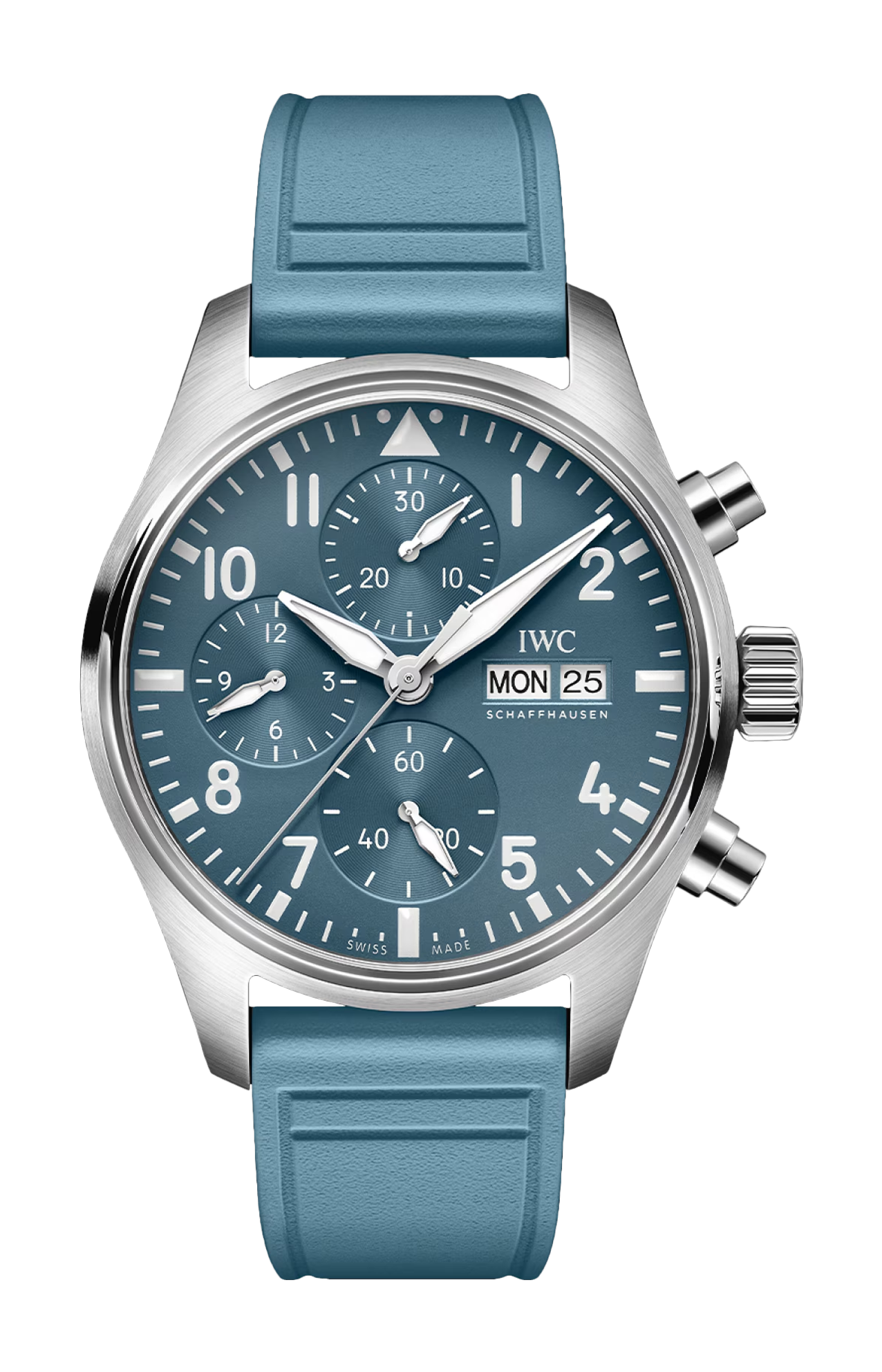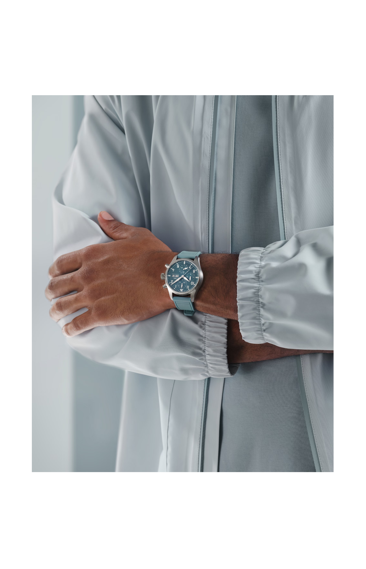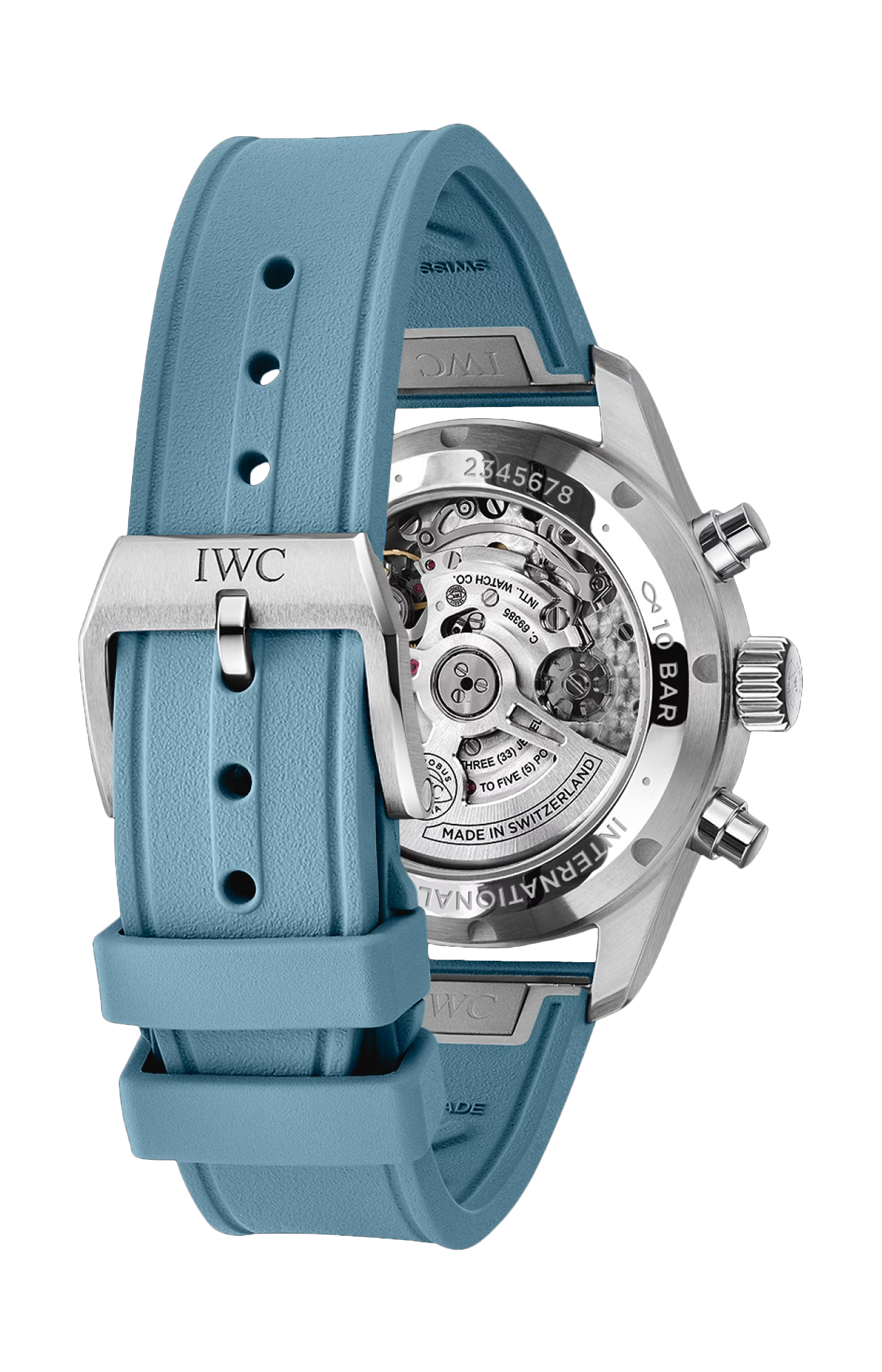 Cassa 41 mm in acciaio, quadrante azzurro. Movimento cronografico a carica automatica con indicazione di giorno e data a ore 3, calibro 69385 di manifattura IWC Schaffhausen, riserva di ricarica 46 ore. Cinturino in caucciù azzurro con sistema EASX-CHANGE® e fibbia ad ardiglione in acciaio. Impermeabilità 10 ATM.