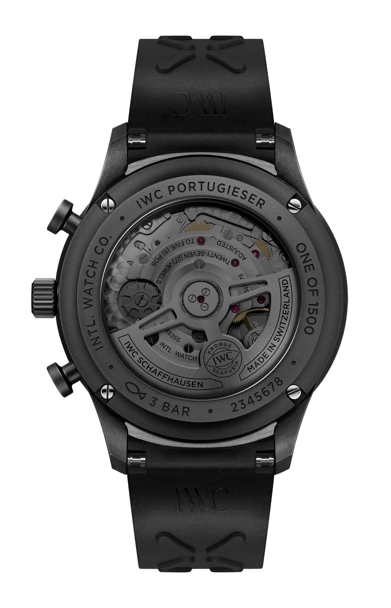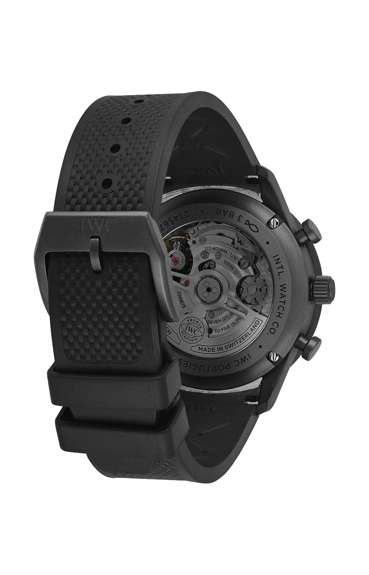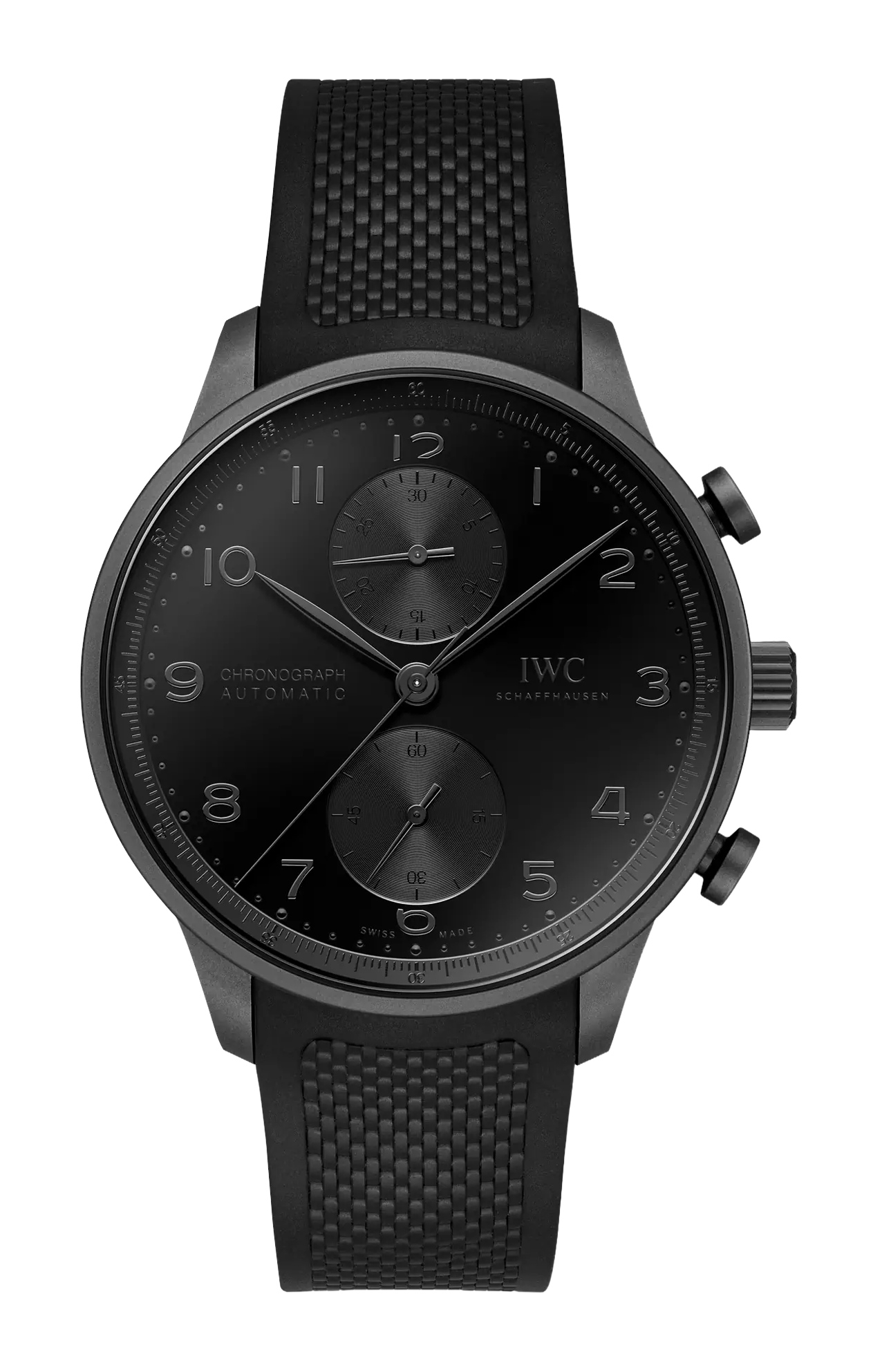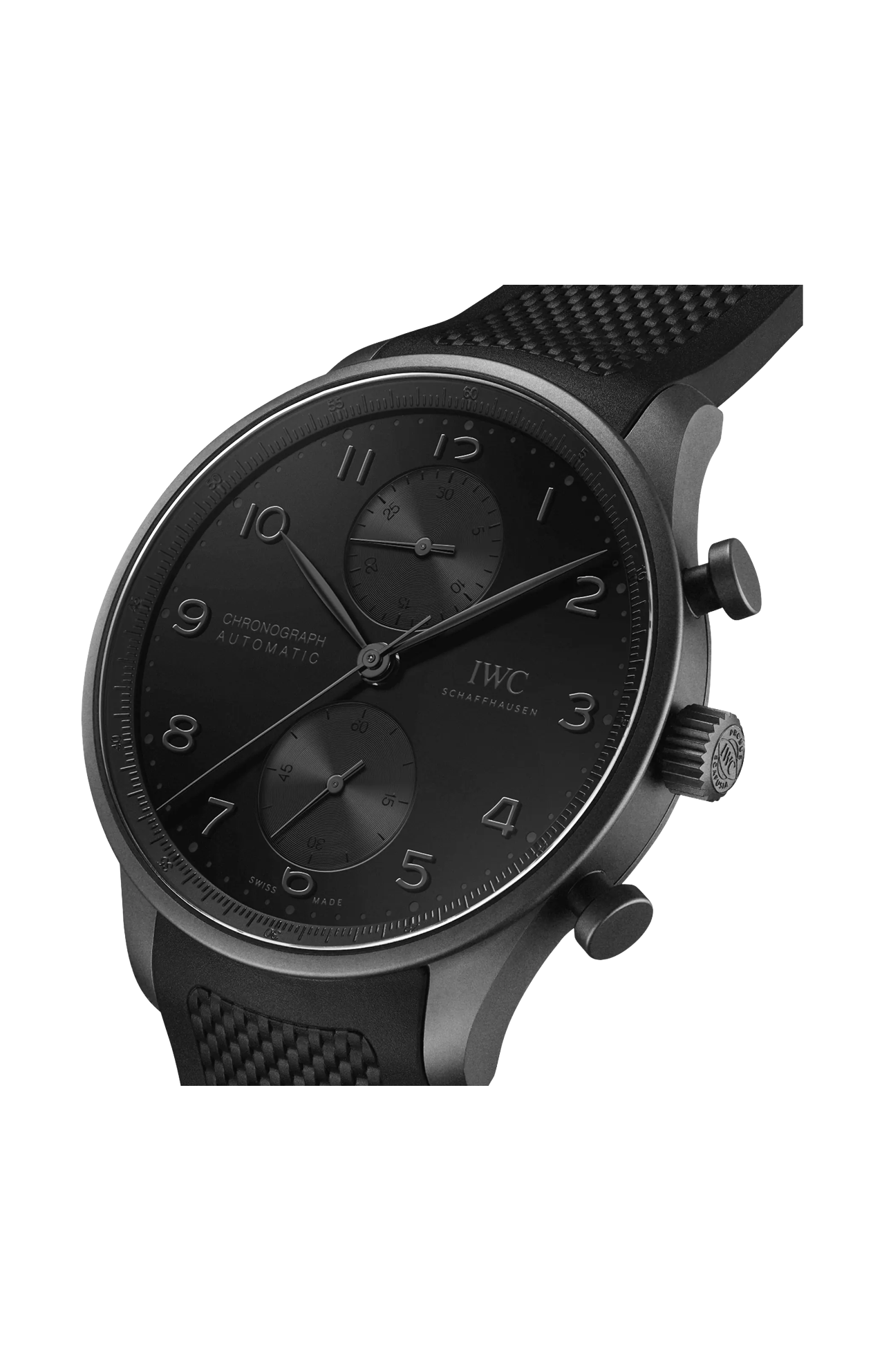 Reinterpretazione creativa di un classico senza tempo, il Portugieser Chronograph Ceratanium® segna la prima comparsa di questo materiale inconfondibile, scuro e discreto, nella collezione Portugieser. Il monolitico design total black è valorizzato da quadrante, indici applicati e lancette di colore nero e da un cinturino in caucciù nero testurizzato.
