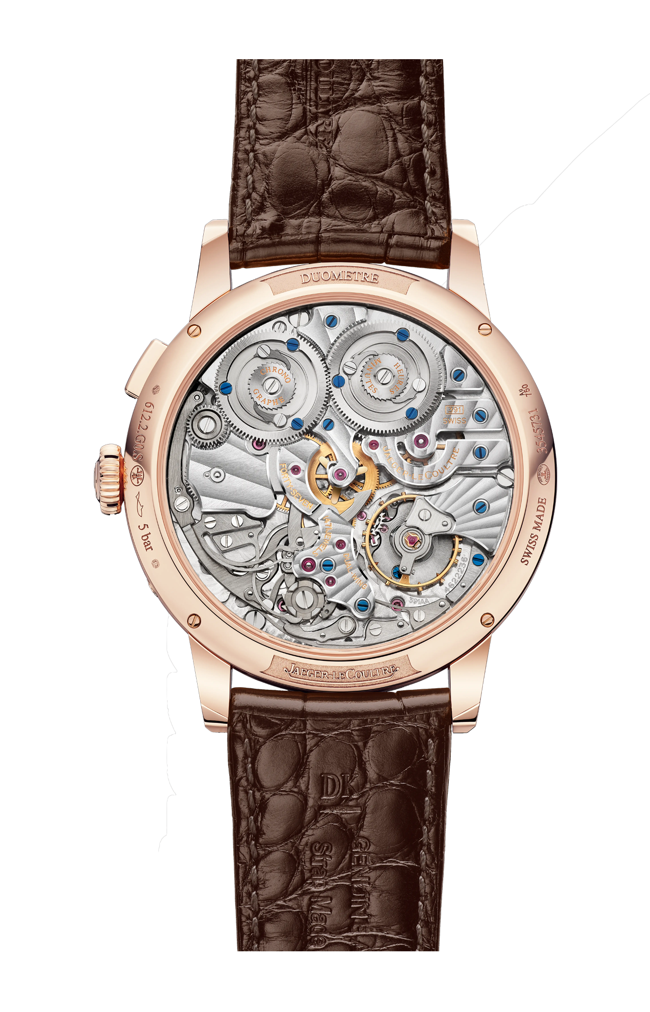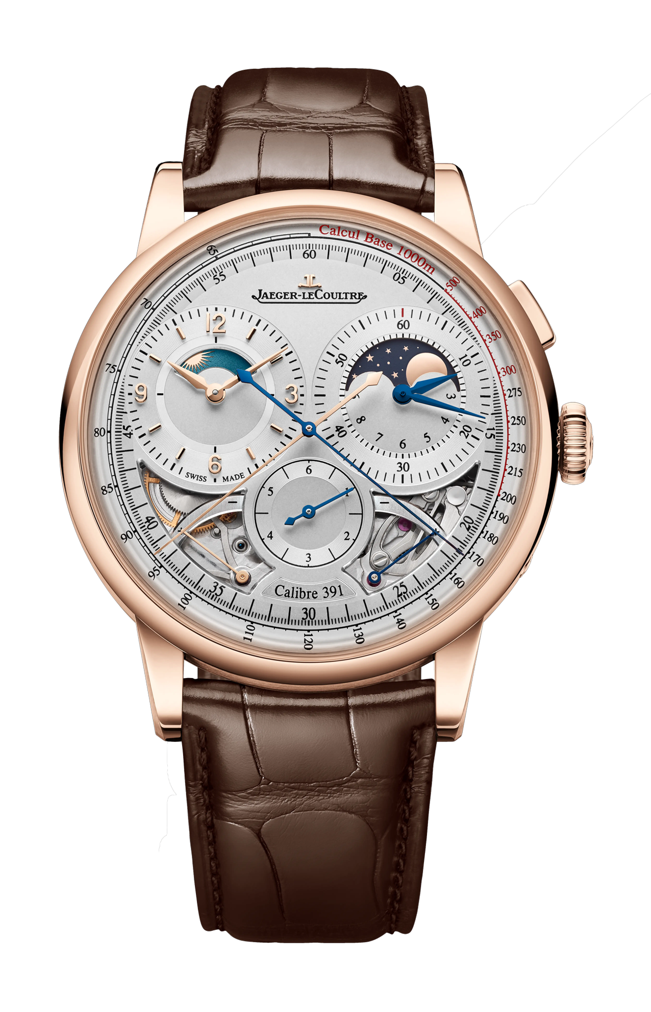 Il quadrante settoriale della Duometre Chronograph Moon è estremamente leggibile sia in termini di design che di funzionalità: fasi lunari sul contatore del cronografo, il cui monopulsante attiva avvio/arresto/azzeramento, indicatore giorno/notte sul contatore delle ore a sinistra, riserve di carica ai lati della funzione dei secondi saltanti a ore 6. Nel cuore di questo orologio con complicazioni batte il calibro 391, che si distingue per i suoi due bariletti e ingranaggi indipendenti: uno dedicato all’indicazione delle ore e dei minuti, l’altro alle complicazioni. Con diversi livelli di finitura, il calibro 391 è uno spettacolo orologiero da ammirare sotto il vetro zaffiro del fondello del segnatempo.
