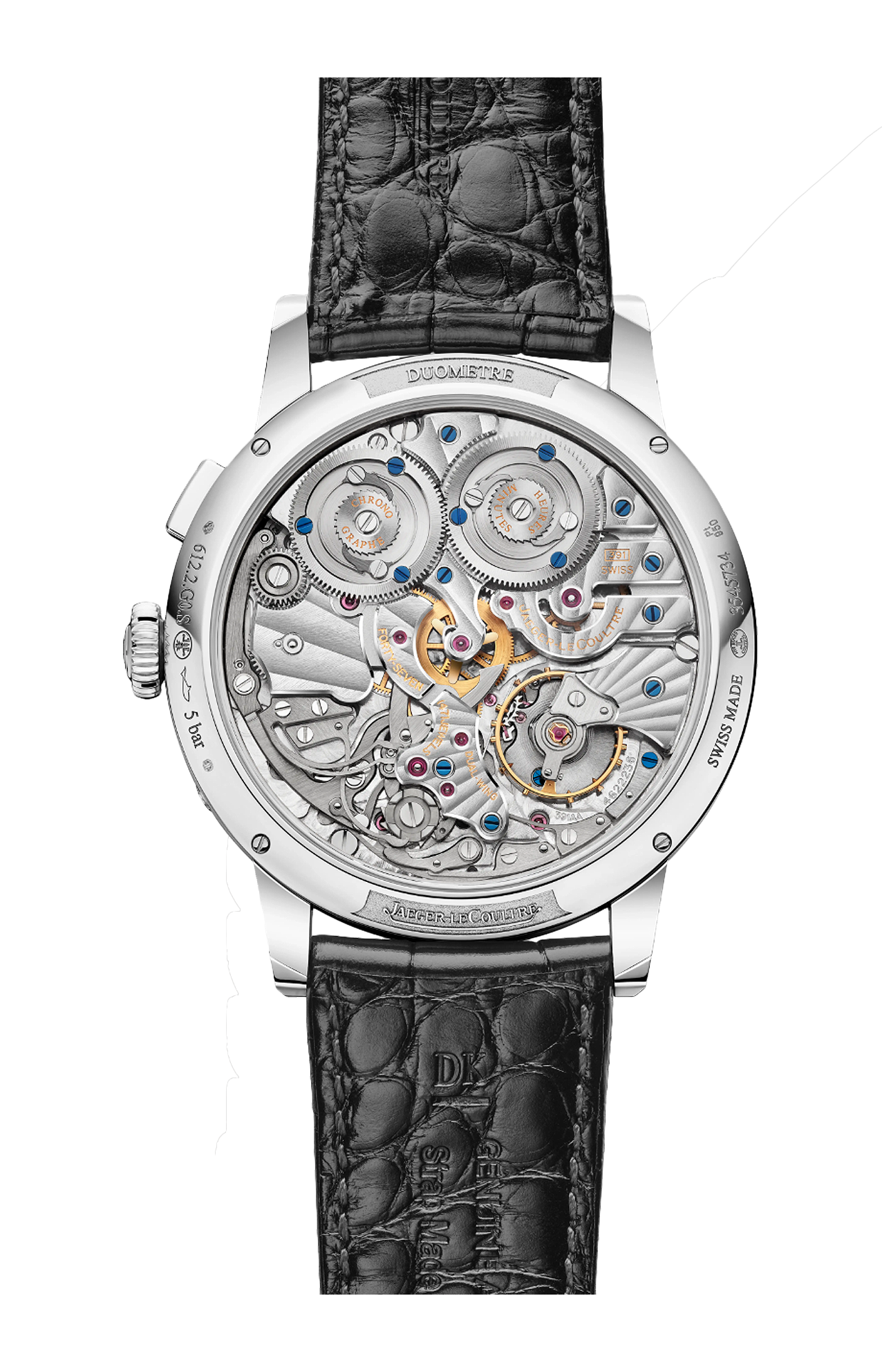 Anteprima assoluta nella collezione Duometre, la cassa in platino è qui abbinata a un quadrante opalino color rame. Questa combinazione audace e originale rimane molto apprezzata dagli intenditori dell’alta orologeria. Dotata del calibro 391, con due bariletti e due ingranaggi, la Duometre Chronograph Moon rivela tutta la complessità delle sue funzioni attraverso i suoi contatori finemente decorati: cronografo e fasi lunari a ore 2, ore-minuti e indicatore giorno/notte a ore 9, secondi centrali in blu che percorrono la scala tachimetrica lungo la circonferenza del quadrante, secondi saltanti (una funzione emblematica della collezione) a ore 6, riserva di carica.