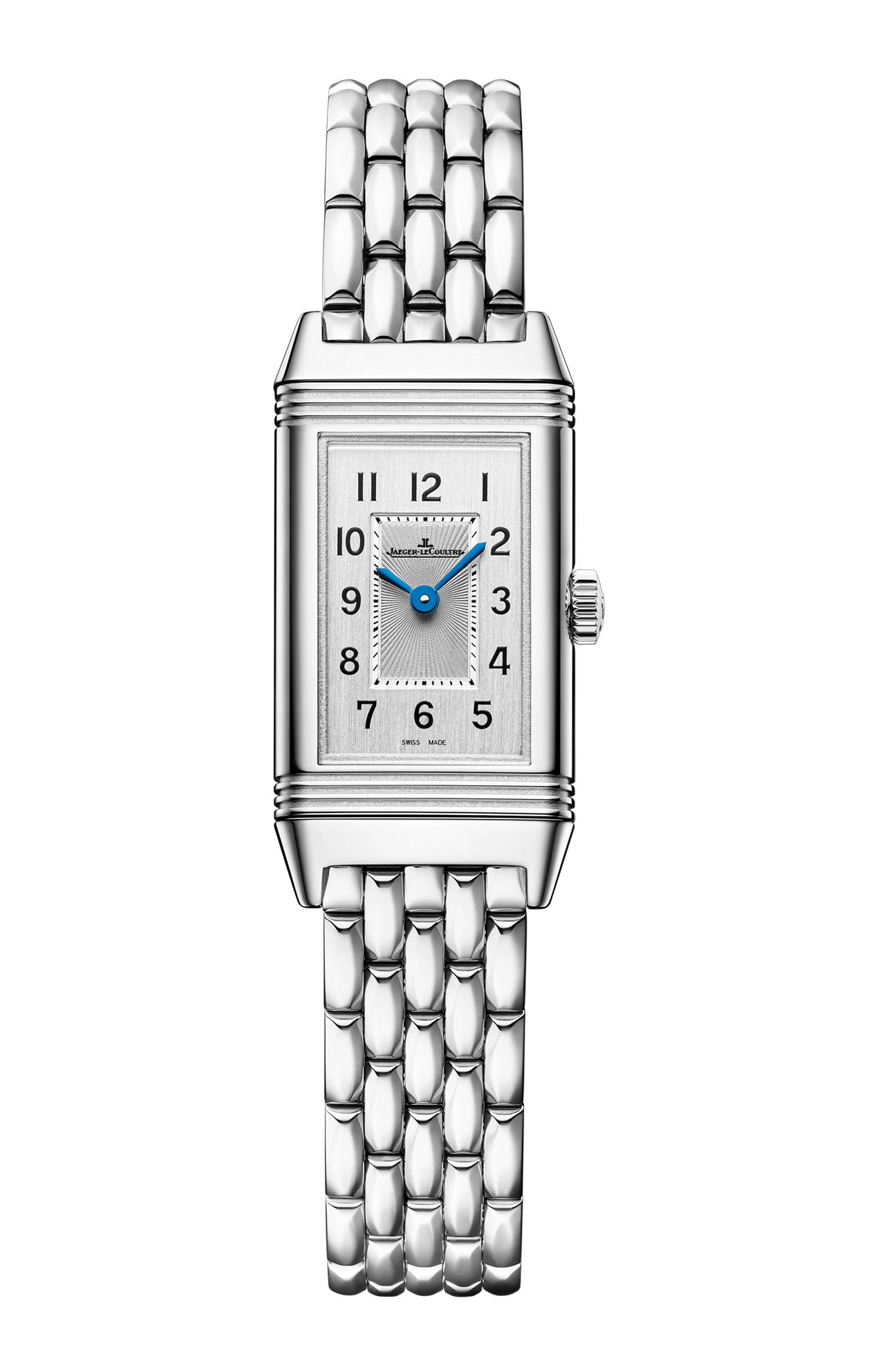 Ispirato ai primi modelli da donna degli anni ’30, il Reverso Classic Monoface Origin è un orologio di grande sobrietà. Le lancette Dauphine azzurrate spiccano su uno sfondo monocromatico. Sul quadrante con doppia finitura – guilloché e spazzolato in verticale – gli emblematici codici Art Déco del Reverso formano un equilibrio armonioso: scanalature ai lati della cassa in acciaio, minuteria “chemin de fer” al centro, numeri arabi a indicare le ore. Il retro può essere personalizzato tramite incisione e laccatura. Un bracciale a maglie in acciaio completa questo segnatempo dall’eleganza intramontabile.